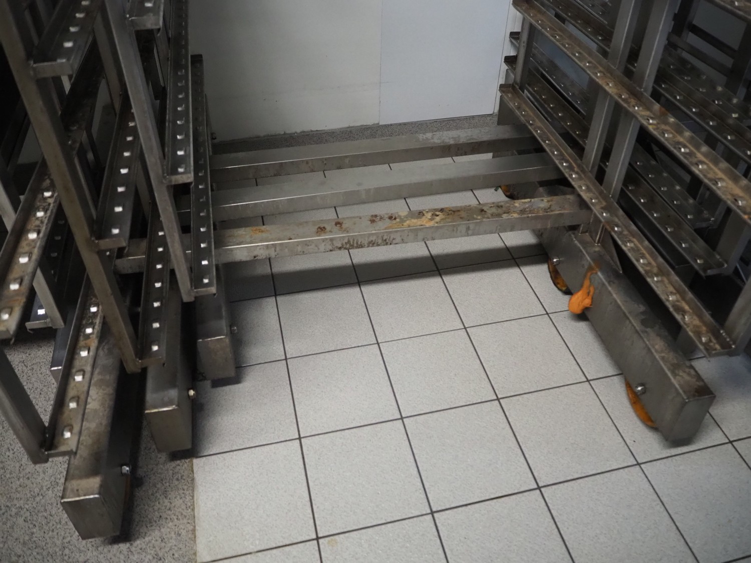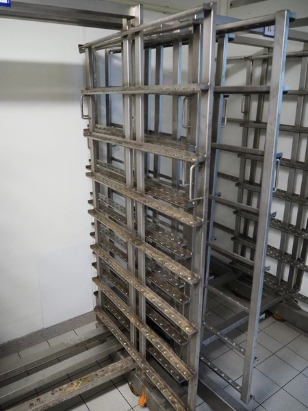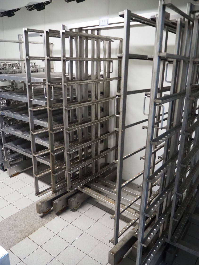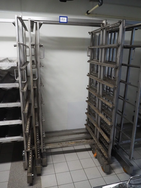 3 s/s smoke trolleys, 8 floors, dimensions floors: (8x) 930 mm x 980 mm, total dimensions: (3x) 1050 mm x 990 mm x 1980 mm.