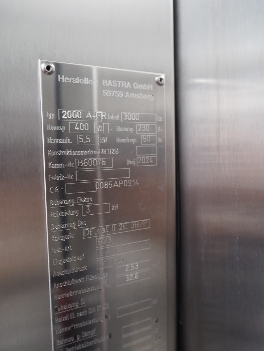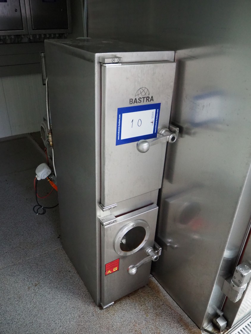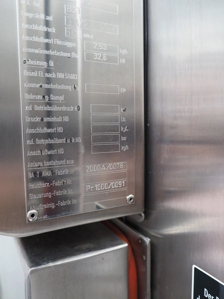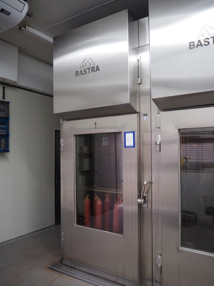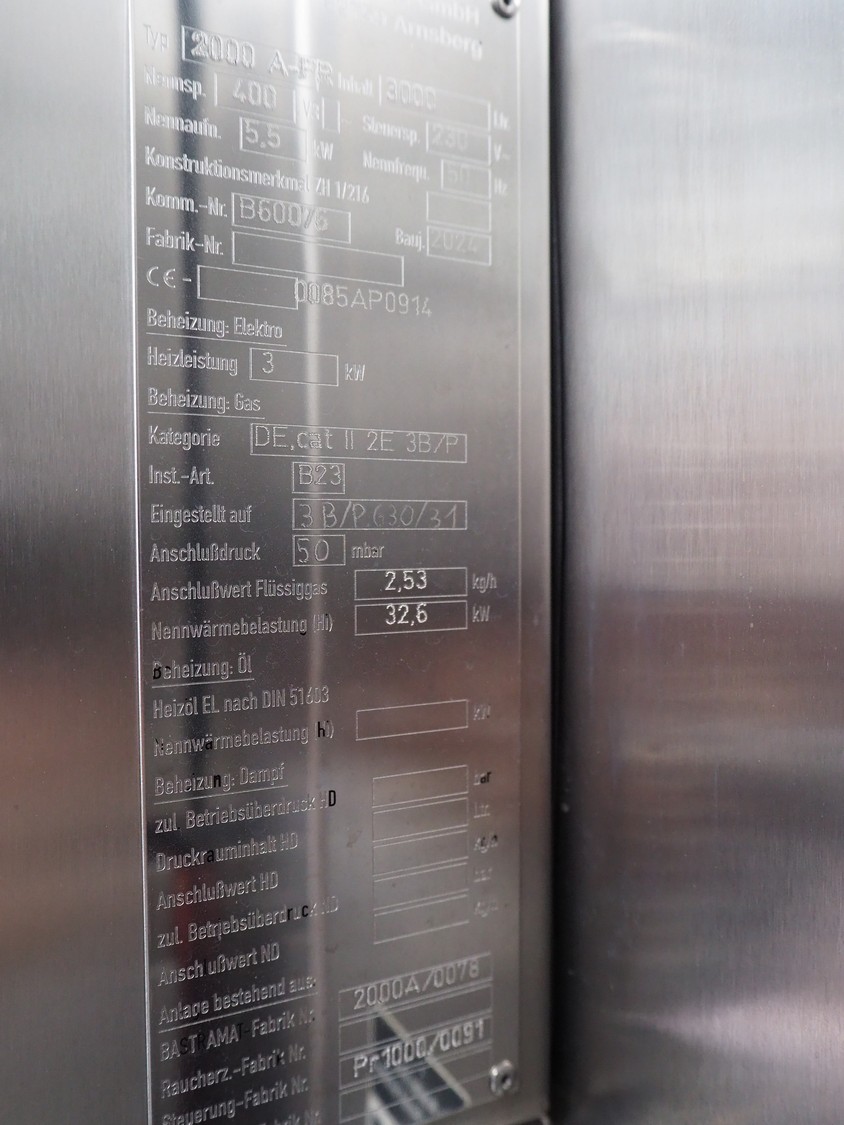 Bastra GmbH universal smoking chamber for 1 smoke trolley, type: 2000 A-FR, serial number: B60076, year of construction: 2024, 230 / 400 V, 3 Ph, 50 Hz, 5.5 kW, volume: 3000 liter, connection liquid smoke: 2.53 kg / hour, nominal capacity: 32.6 kW, equipped with gas heating, climate package, shower, steam cooking, viewing window, PC-monitoring, Bastra FR 50 liquid smoke generator, inside dimensions smoking chamber:1130 mm x 1100 mm x 2100 mm, total dimensions smoking chamber: 1500 mm x 1700 mm x 3300 mm, Bastra smoke generator for woodchips, type: 40 HS, year of construction: 2021, dimensions smoke generator: 340 mm x 1050 mm x 1300 mm, dimensions switch cabinet: 480 mm x 260 mm x 1100 mm, dimensions switch cabinet with frequency convertor: 300 mm x 200 mm x 370 mm, dimensions switch cabinet liquid smoke generator: 480 mm x 300 mm x 700 mm. Smoking chamber needs to be removed by crane.