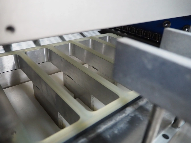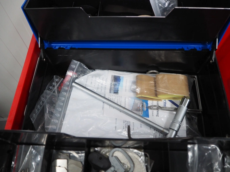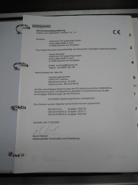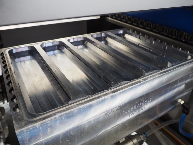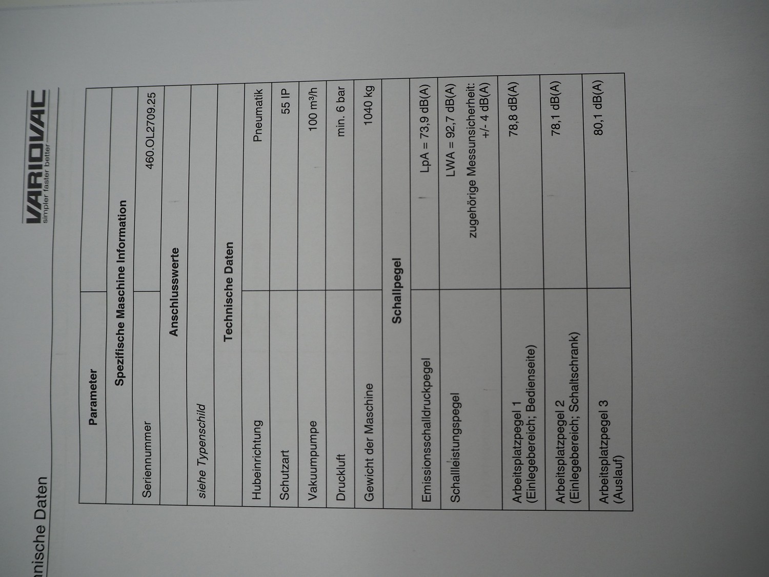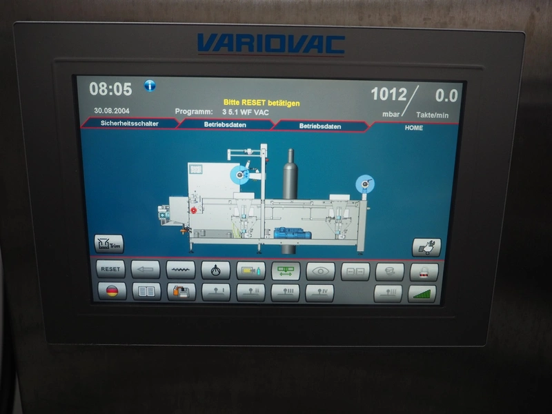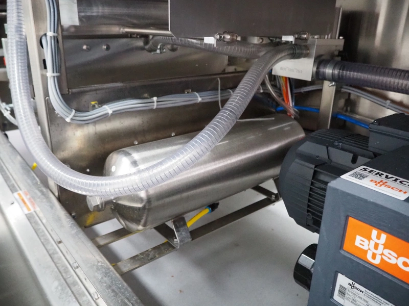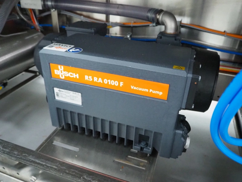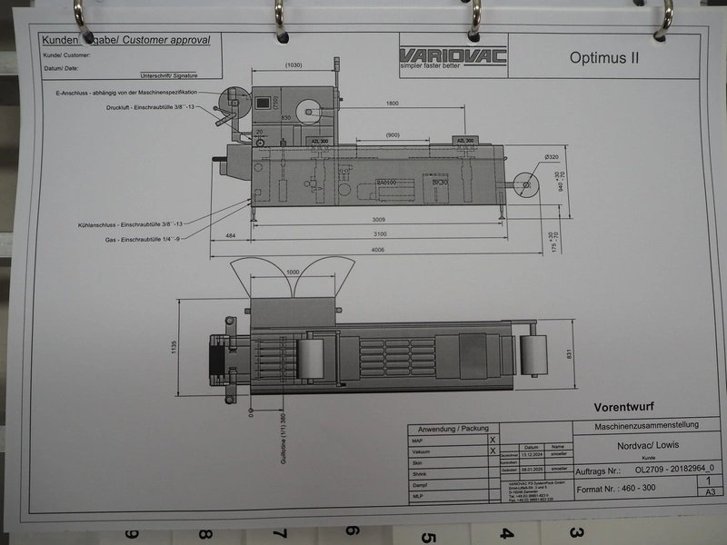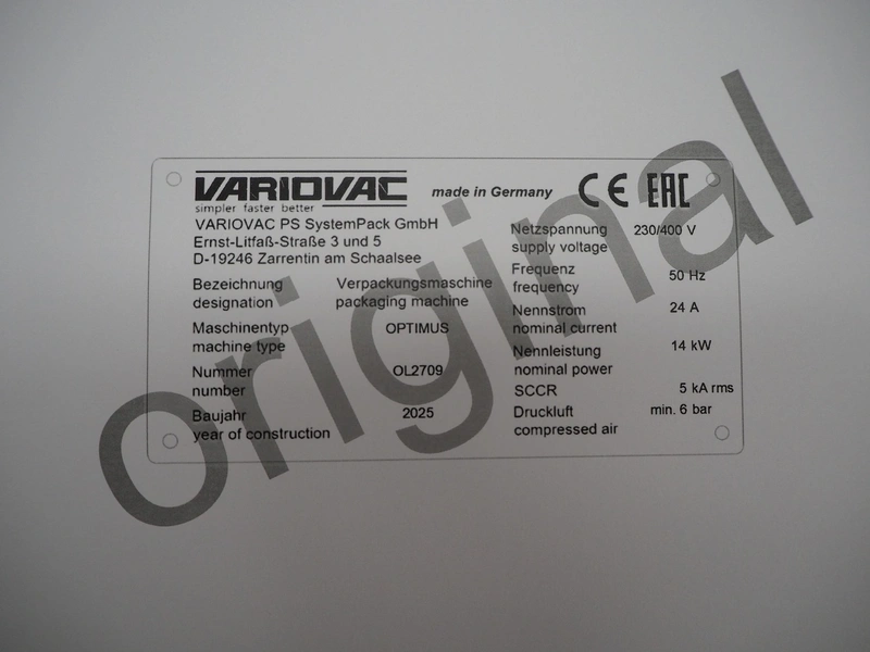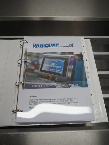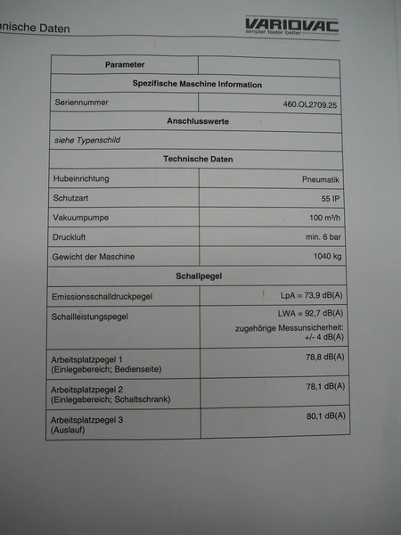 Variovac thermoformer, machine type: OPTIMUS, number: OL2709, year of construction: 2025, 230/400 V, 50 Hz, nominal current: 24 A, nominal power: 14 kW, compressed air minimum: 6 bar, film width: 460 mm, index: 300 mm, dye: (5x) 287 mm x 71 mm, thermoforming depth: 100 mm, outfeed belt, belt width: 425 mm, Busch vacuum pump, type: RA0100 F 403 TDXZ, year of construction: 2024, capacity: 120 m³ per hour, total dimensions: 3700 mm x 1200 mm x 2100 mm. Including various parts. For more information about the dyes see below drawings: