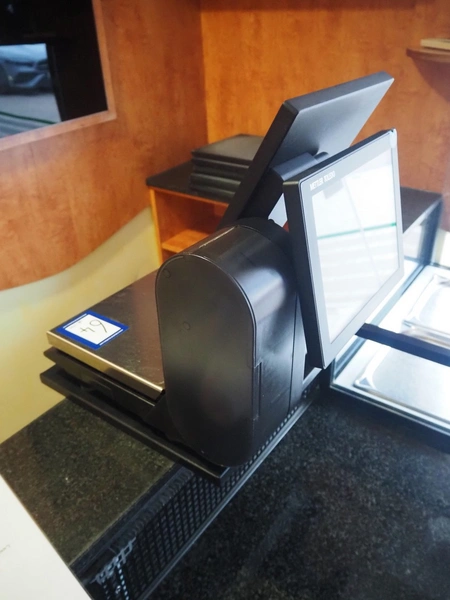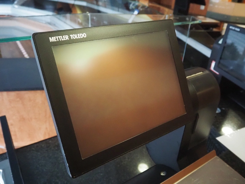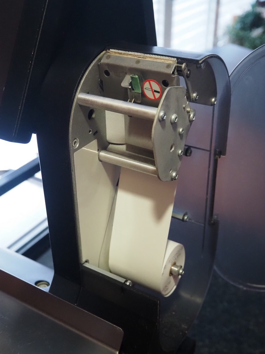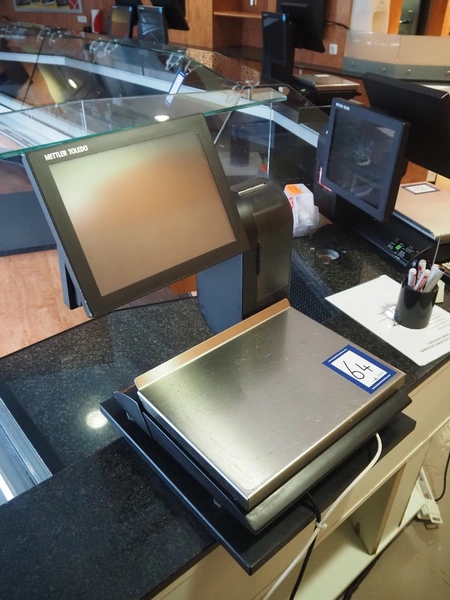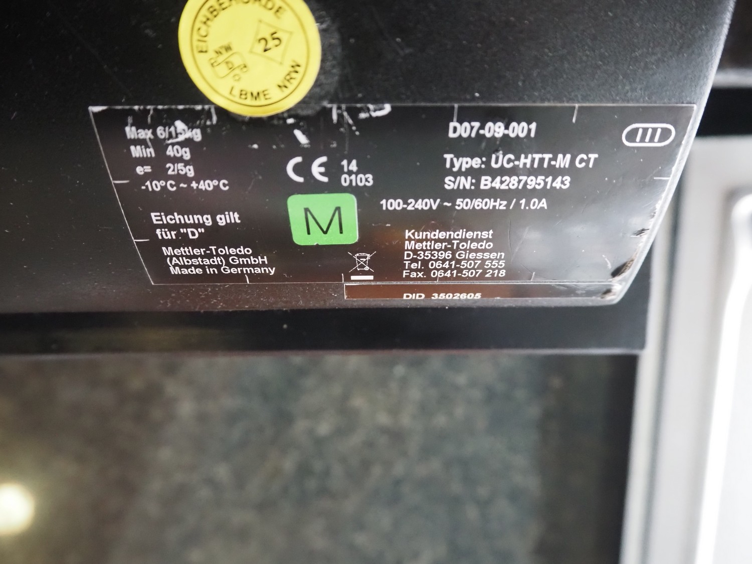 Mettler Toledo weighing scale with printer, type: UC-HTT-M CT, serial number: B428795143, 100/240 V, 50/60 Hz, 1.0 A, maximum: 6/15 kg, minimum: 40 g, e= 2/5 g, scale dimensions: 360 mm x 270 mm, total dimensions: 500 mm x 440 mm x 550 mm.