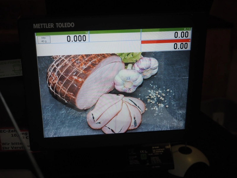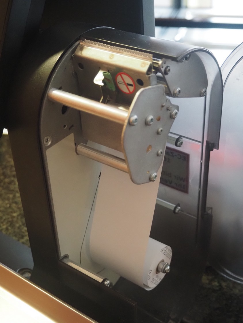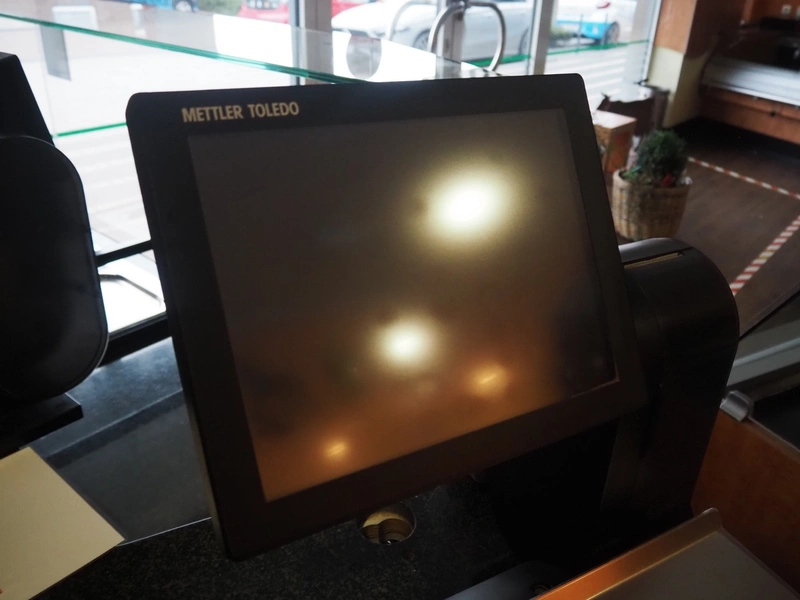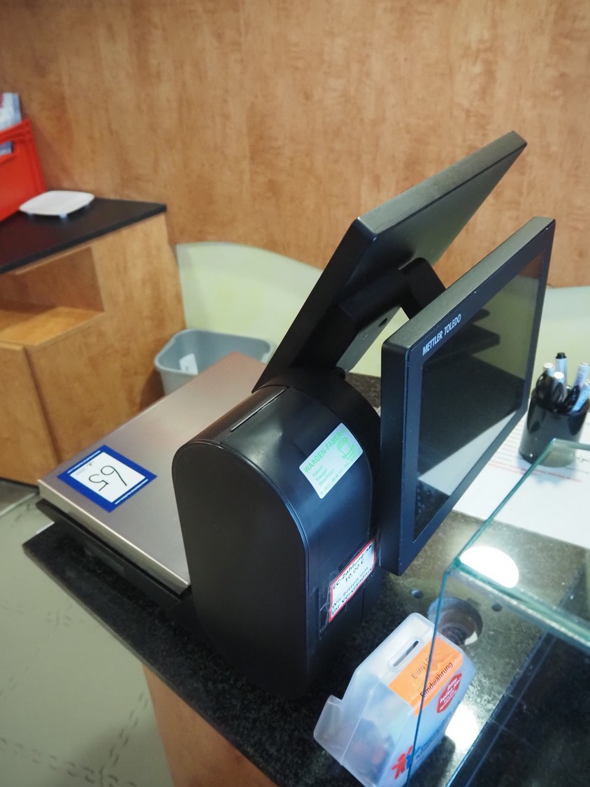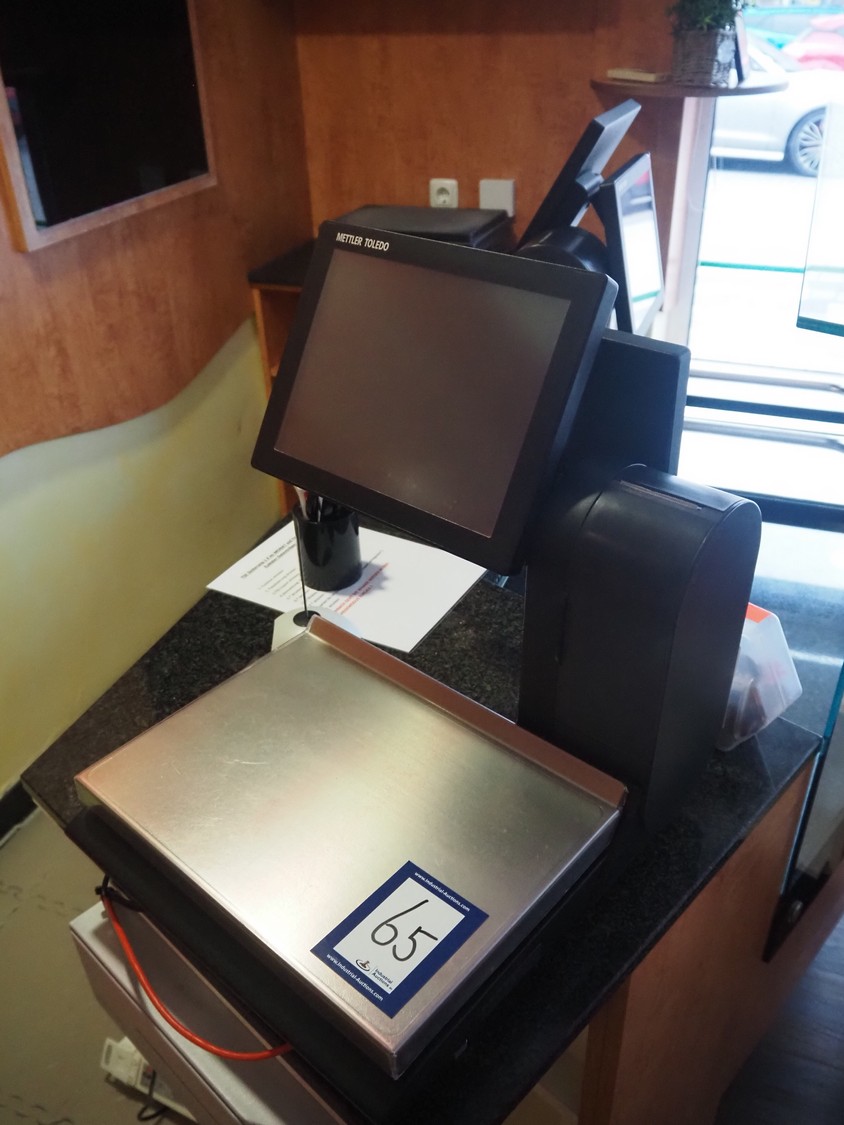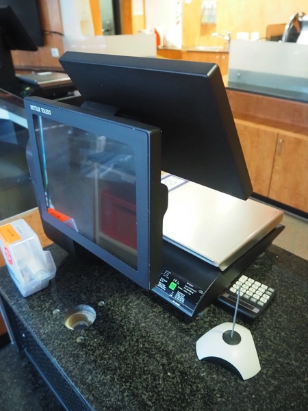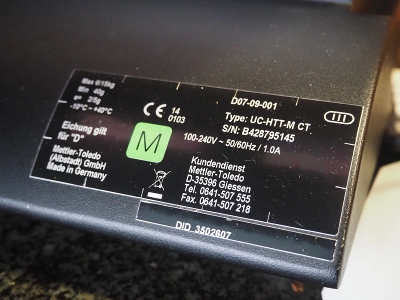 Mettler Toledo weighing scale with printer, type: UC-HTT-M CT, serial number: B428795145, 100/240 V, 50/60 Hz, 1.0 A, maximum: 6/15 kg, minimum: 40 g, e= 2/5 g, scale dimensions: 360 mm x 270 mm, total dimensions: 500 mm x 440 mm x 550 mm.