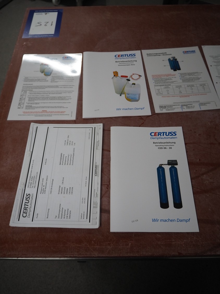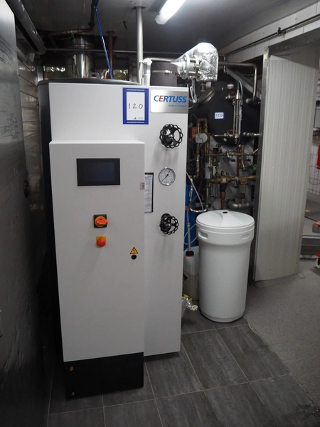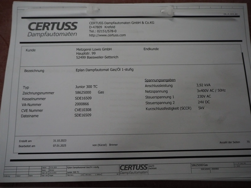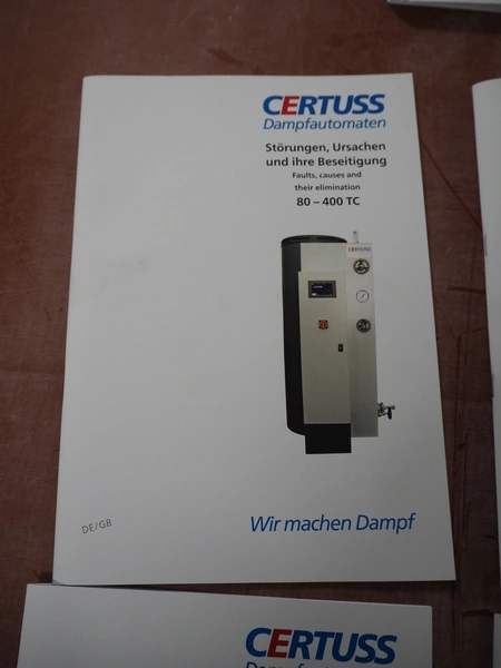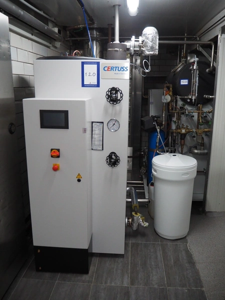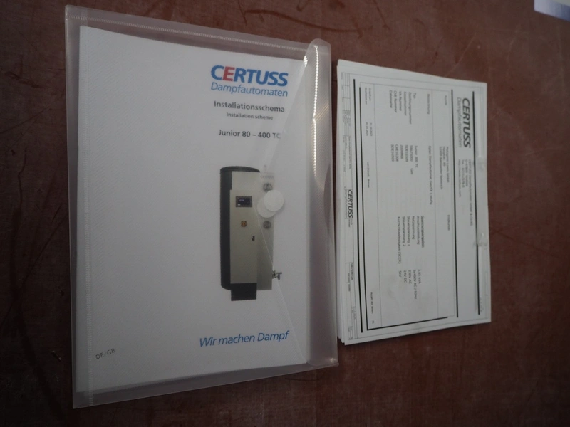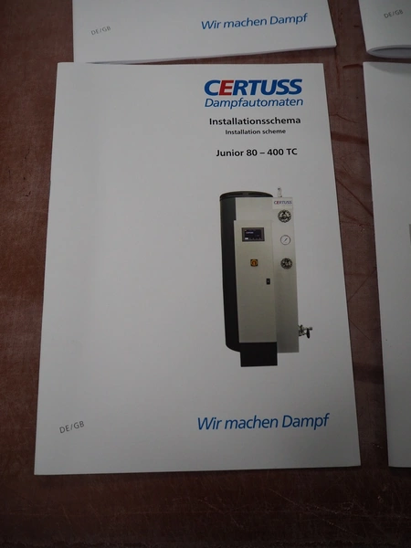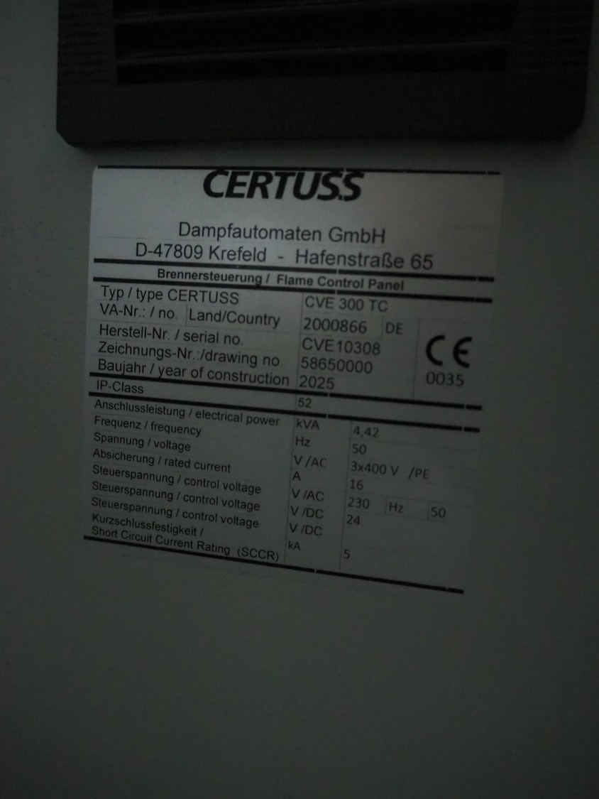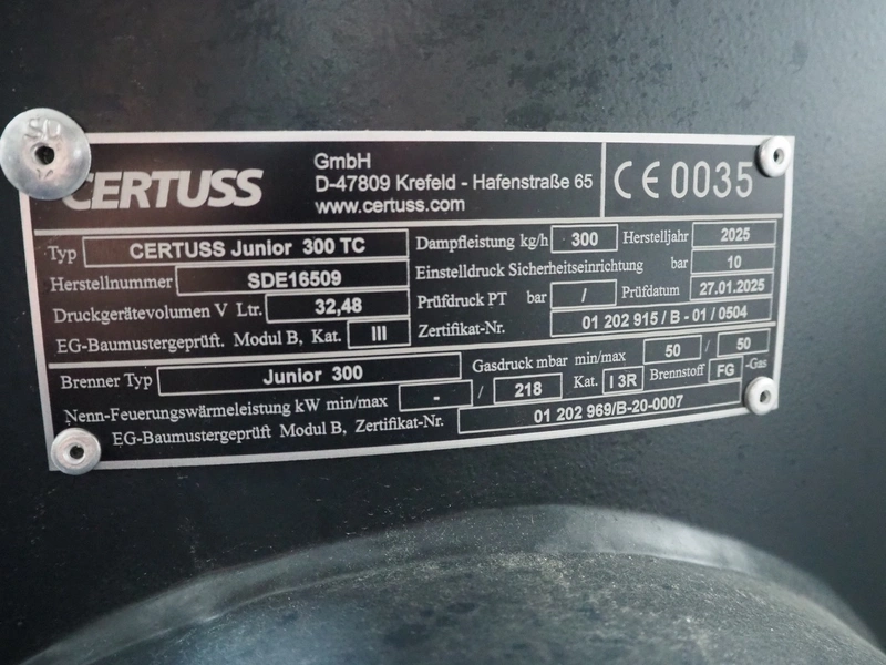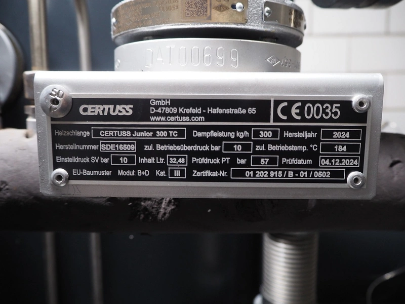 Certuss GmbH steam generator, model: CERTUSS Junior 300 TC, production number: SDE16509, year of construction: 2024, capacity: 300 kg per hour, maximum working pressure: 10 bar, maximum working temperature: 184˚C, volume in liter: 32.48 liter, test pressure: 57 bar, dimensions: 1000 mm x 1500 mm x 2000 mm, Certuss GmbH CVE package plant unit, type: CERTUSS CVE 300 TC, serial number CVE10308, year of construction: 2025, 230 V, 50 Hz, 16 A, 4.42 kVa, dimensions: 1500 mm x 1000 mm x 2000 mm.