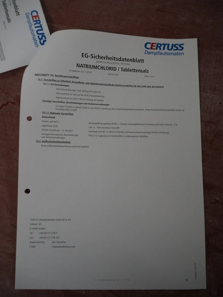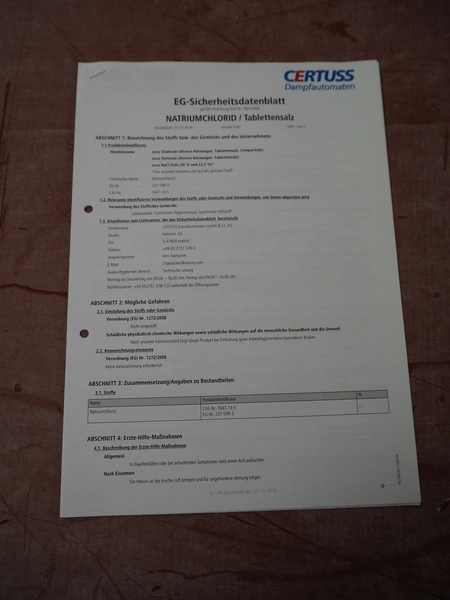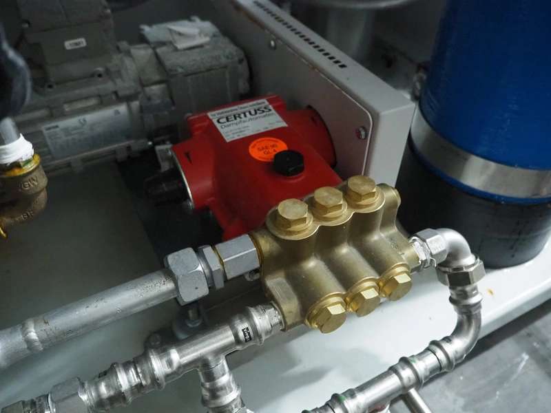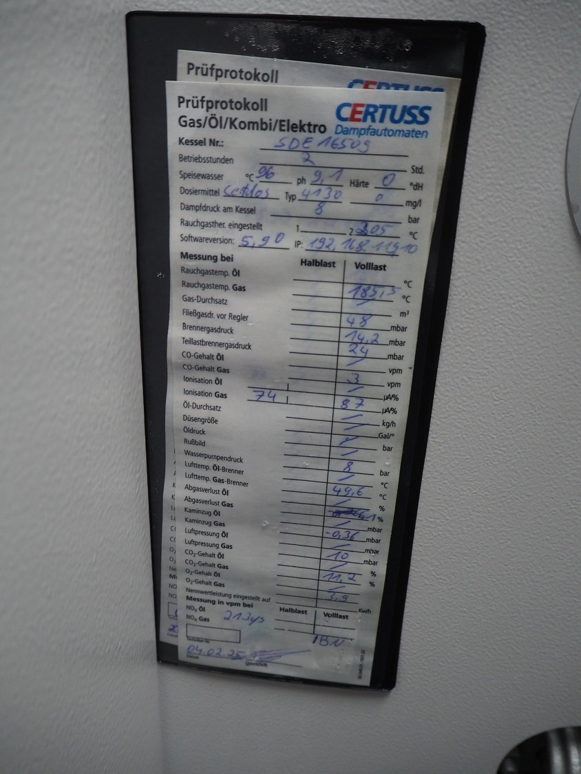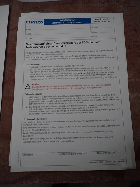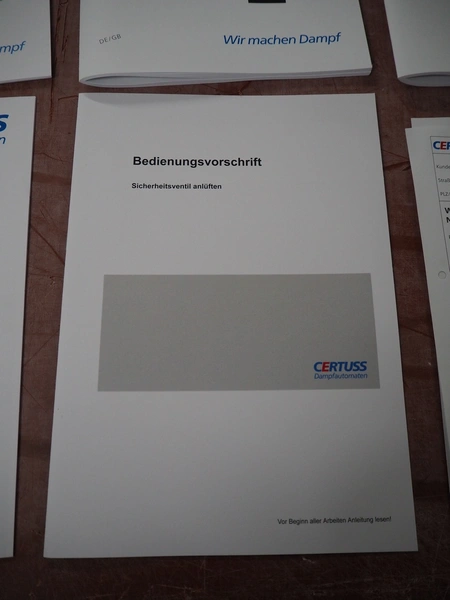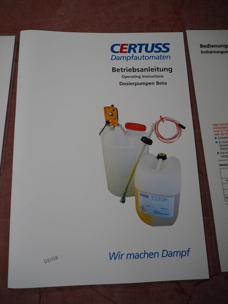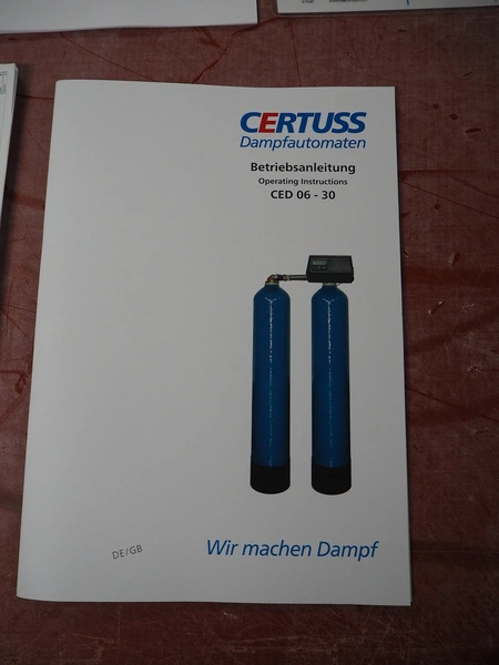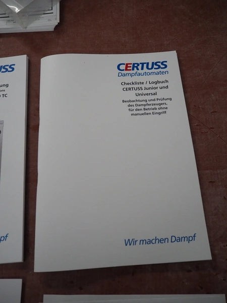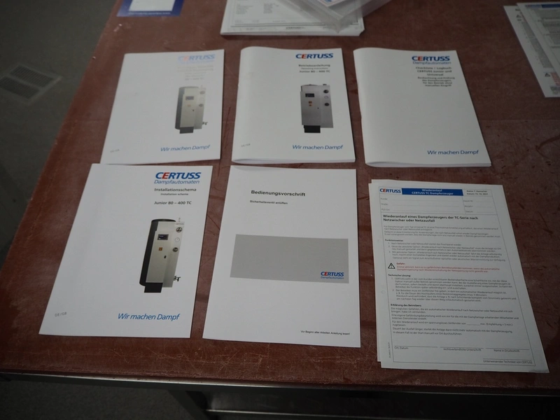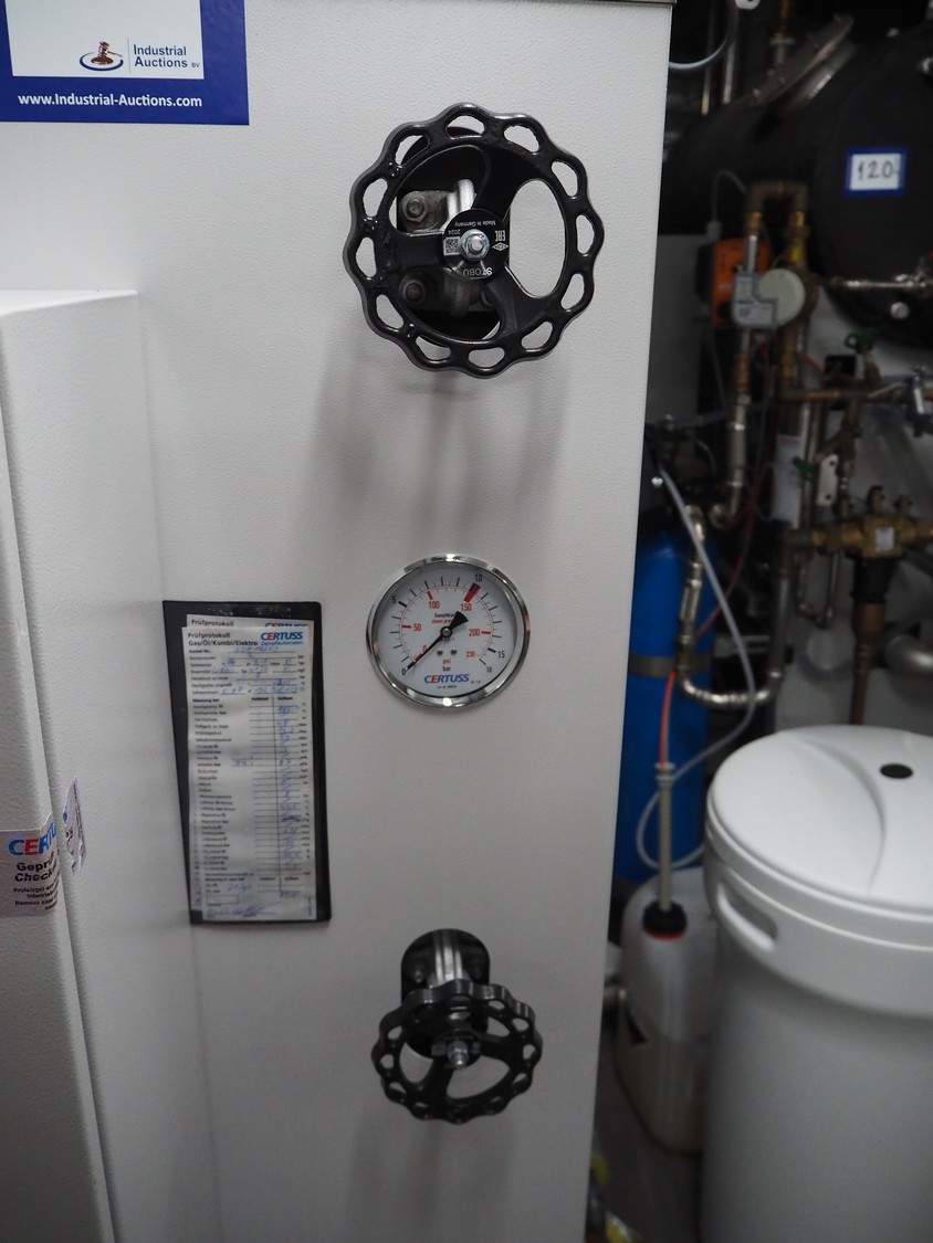 Certuss GmbH steam generator, model: CERTUSS Junior 300 TC, production number: SDE16509, year of construction: 2024, capacity: 300 kg per hour, maximum working pressure: 10 bar, maximum working temperature: 184˚C, volume in liter: 32.48 liter, test pressure: 57 bar, dimensions: 1000 mm x 1500 mm x 2000 mm, Certuss GmbH CVE package plant unit, type: CERTUSS CVE 300 TC, serial number CVE10308, year of construction: 2025, 230 V, 50 Hz, 16 A, 4.42 kVa, dimensions: 1500 mm x 1000 mm x 2000 mm.