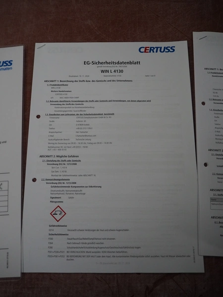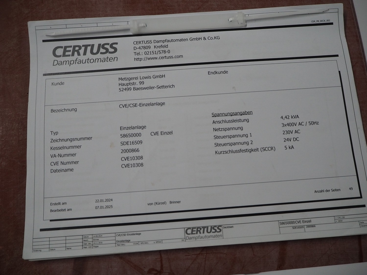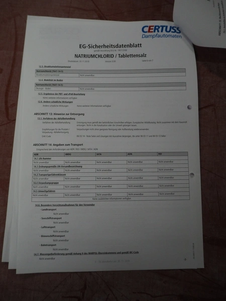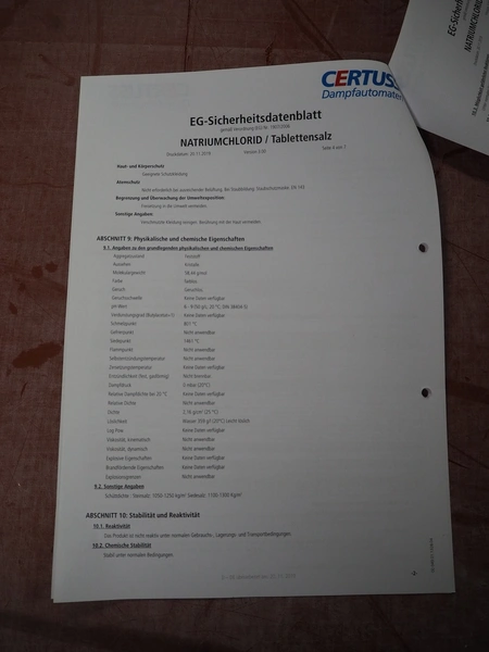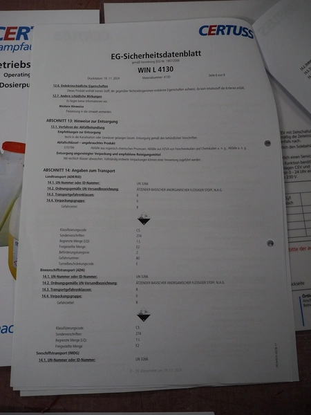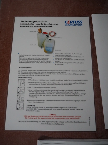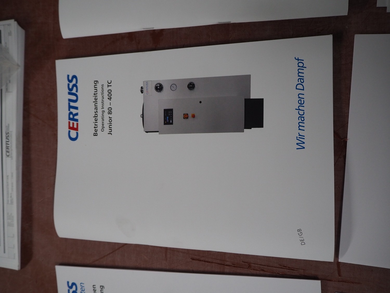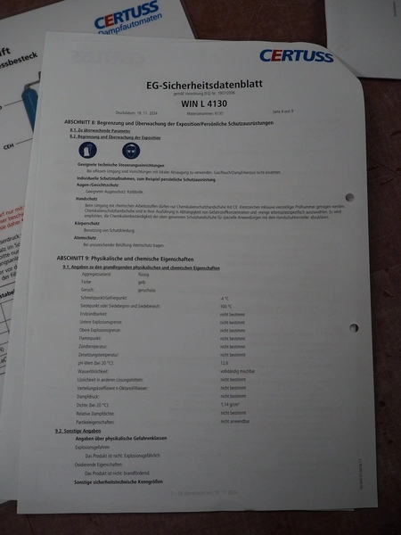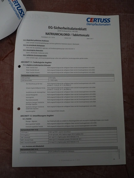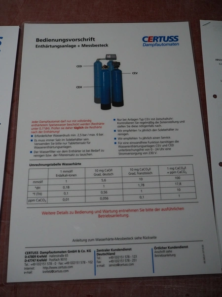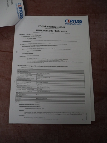 Certuss GmbH steam generator, model: CERTUSS Junior 300 TC, production number: SDE16509, year of construction: 2024, capacity: 300 kg per hour, maximum working pressure: 10 bar, maximum working temperature: 184˚C, volume in liter: 32.48 liter, test pressure: 57 bar, dimensions: 1000 mm x 1500 mm x 2000 mm, Certuss GmbH CVE package plant unit, type: CERTUSS CVE 300 TC, serial number CVE10308, year of construction: 2025, 230 V, 50 Hz, 16 A, 4.42 kVa, dimensions: 1500 mm x 1000 mm x 2000 mm.