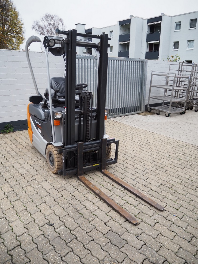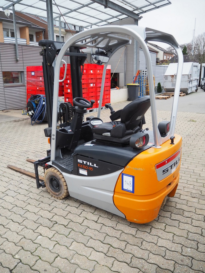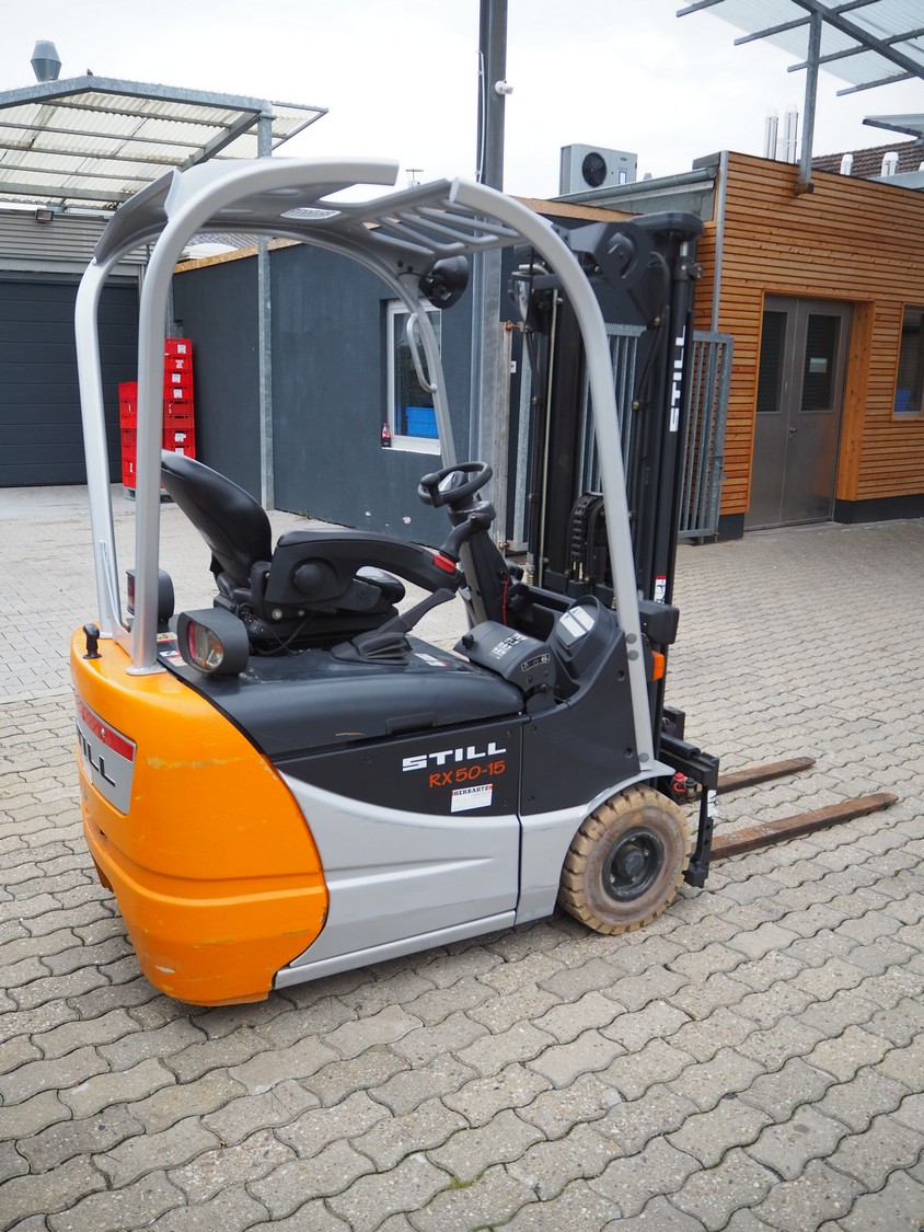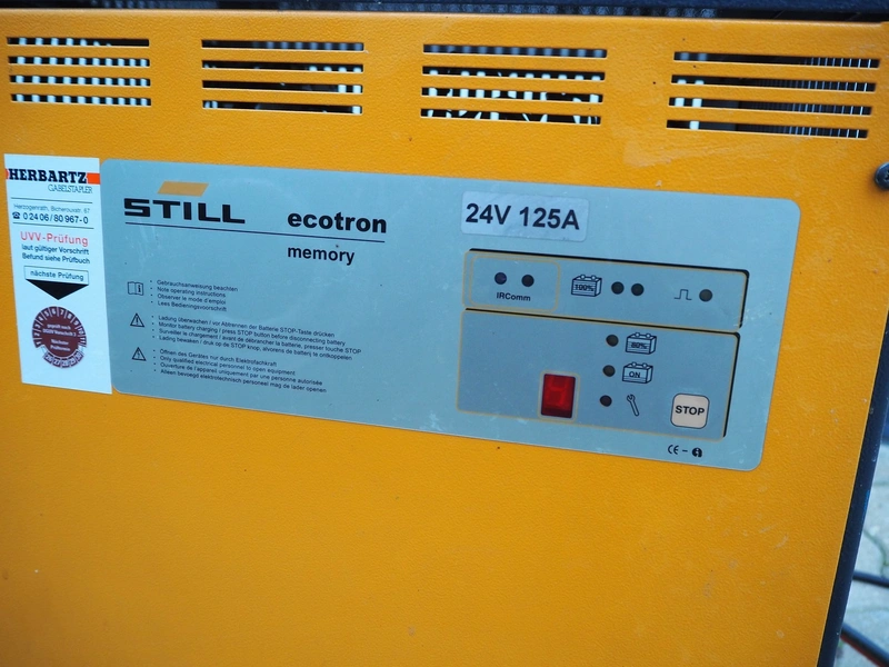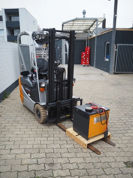 Still forklift truck, type: RX 50-15, serial number: 515054A00356, year of construction: 2010, rated capacity: 1500 kg, battery voltage: 24 V, unladen mass: 2036 kg, maximum / minimum battery weight: 710 / 642 kg, rated power drive: 4.0 kW, fork length: 1180 mm, duplex mast, side shift, dimensions forklift truck: 3000 mm x 1100 mm x 2100 mm, Still battery charger, model: D24V/125A, dimensions battery charger: 500 mm x 450 mm x 500 mm. Complete overhauled in 2024. Battery renewed 11/2024.