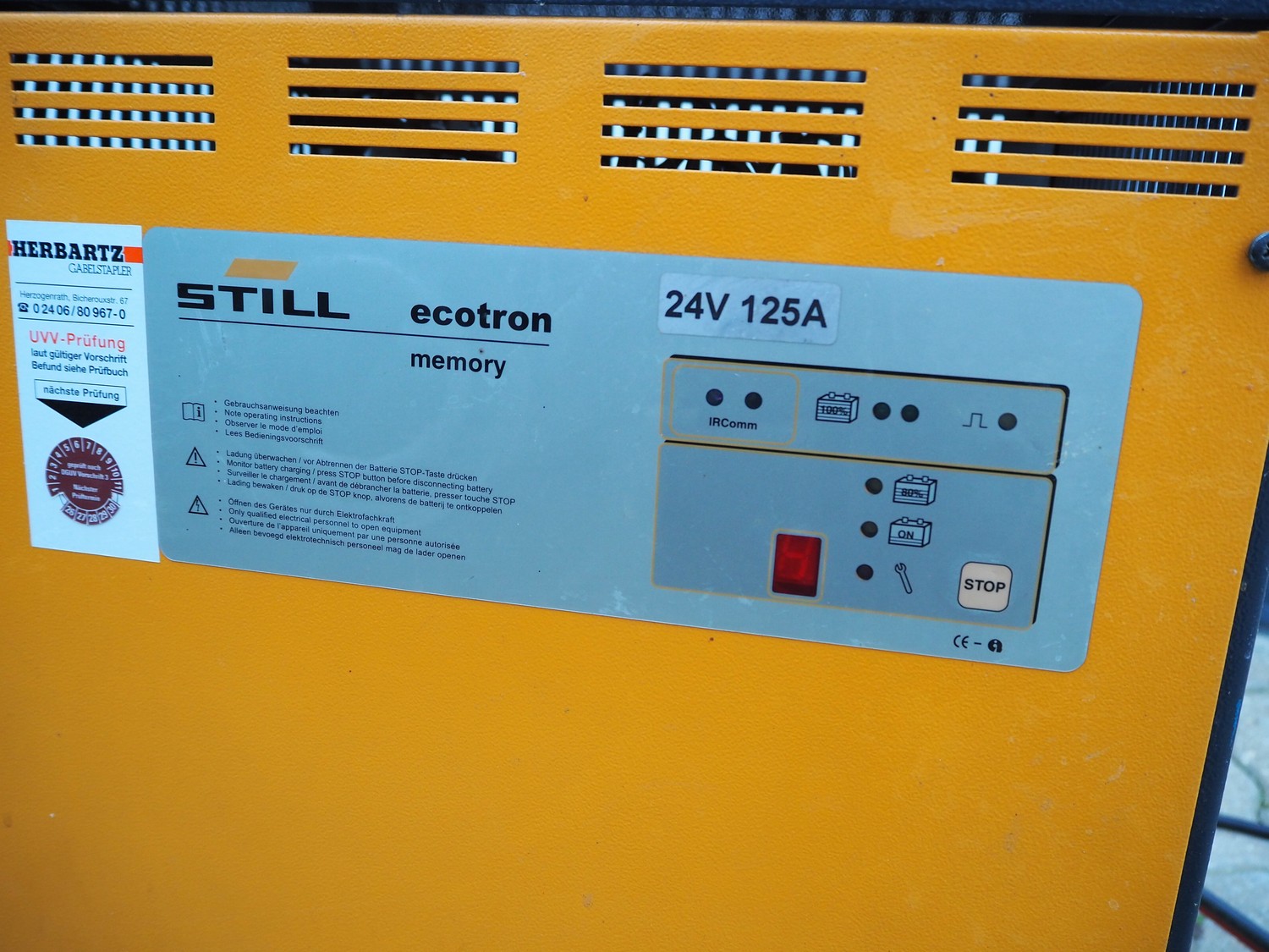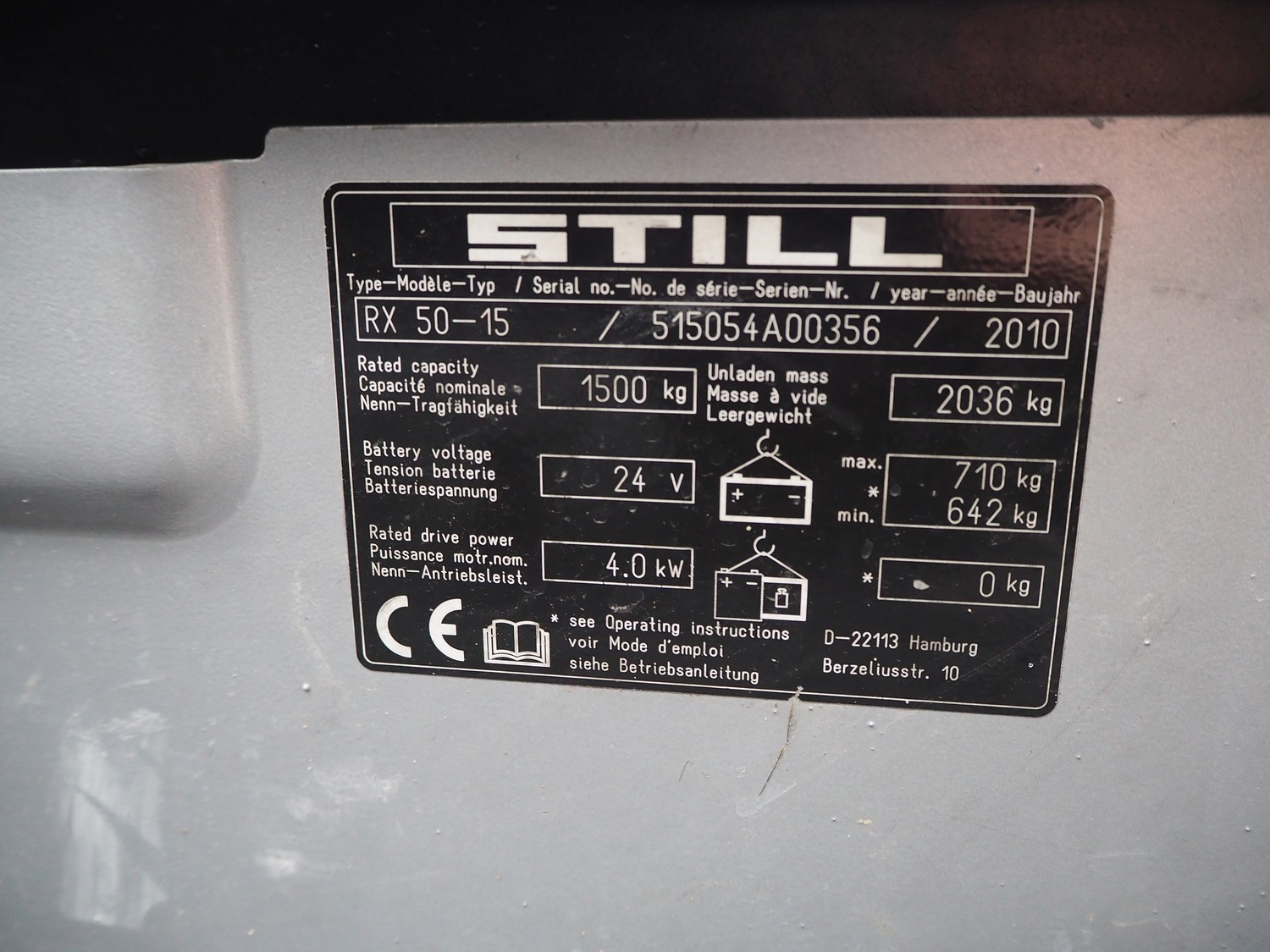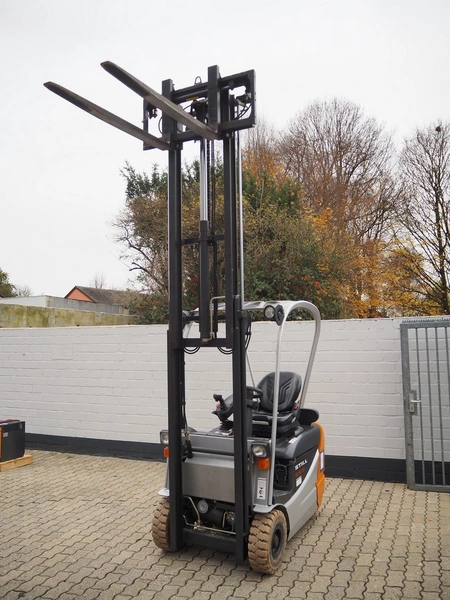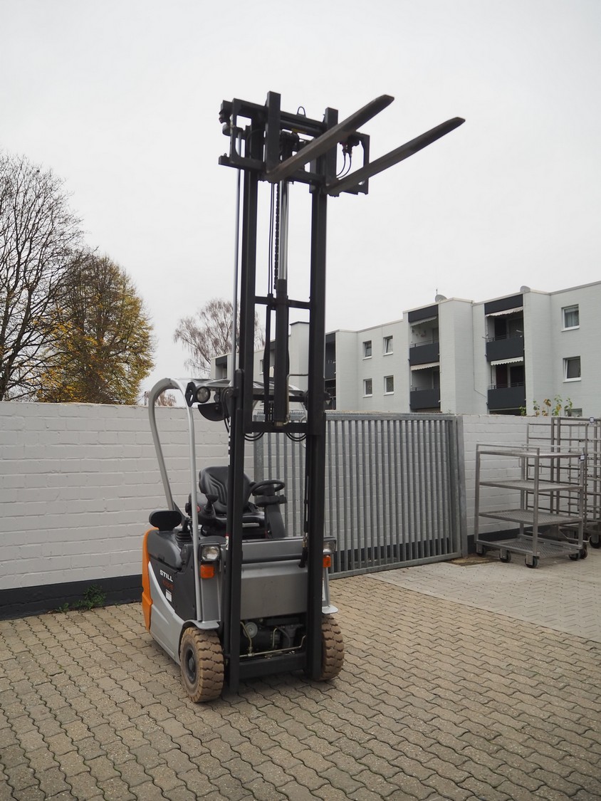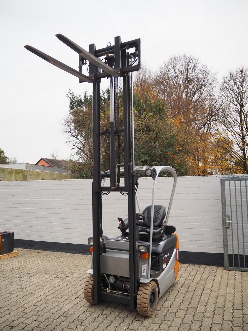 Still forklift truck, type: RX 50-15, serial number: 515054A00356, year of construction: 2010, rated capacity: 1500 kg, battery voltage: 24 V, unladen mass: 2036 kg, maximum / minimum battery weight: 710 / 642 kg, rated power drive: 4.0 kW, fork length: 1180 mm, duplex mast, side shift, dimensions forklift truck: 3000 mm x 1100 mm x 2100 mm, Still battery charger, model: D24V/125A, dimensions battery charger: 500 mm x 450 mm x 500 mm. Complete overhauled in 2024. Battery renewed 11/2024.