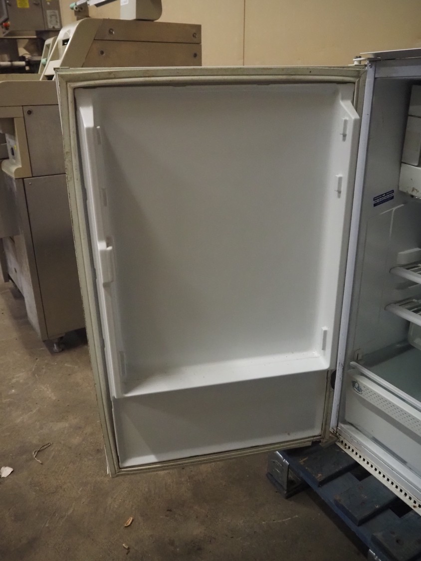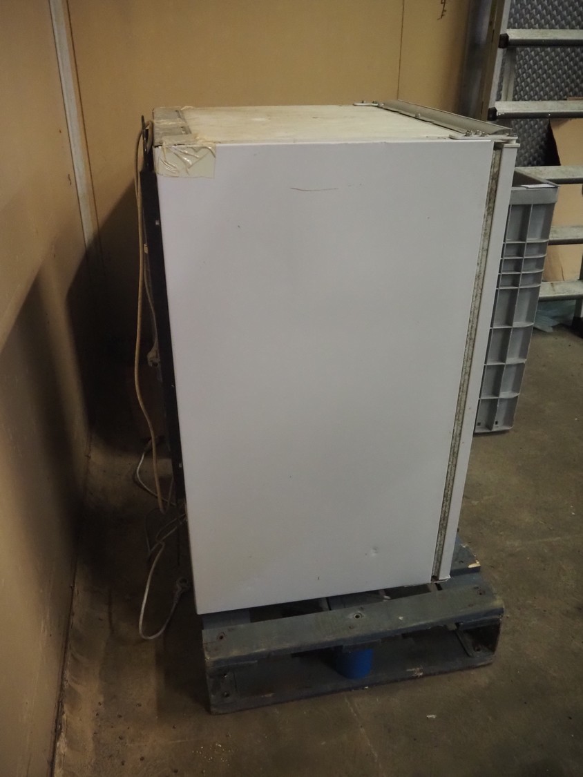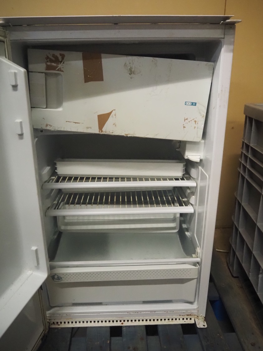 Refrigerator with freezer cabinet, inside dimensions: 500 mm x 480 mm x 710 mm, total dimensions: 540 mm x 540 mm x 870 mm. Broken.