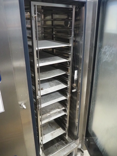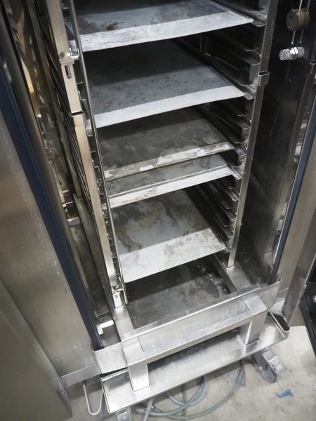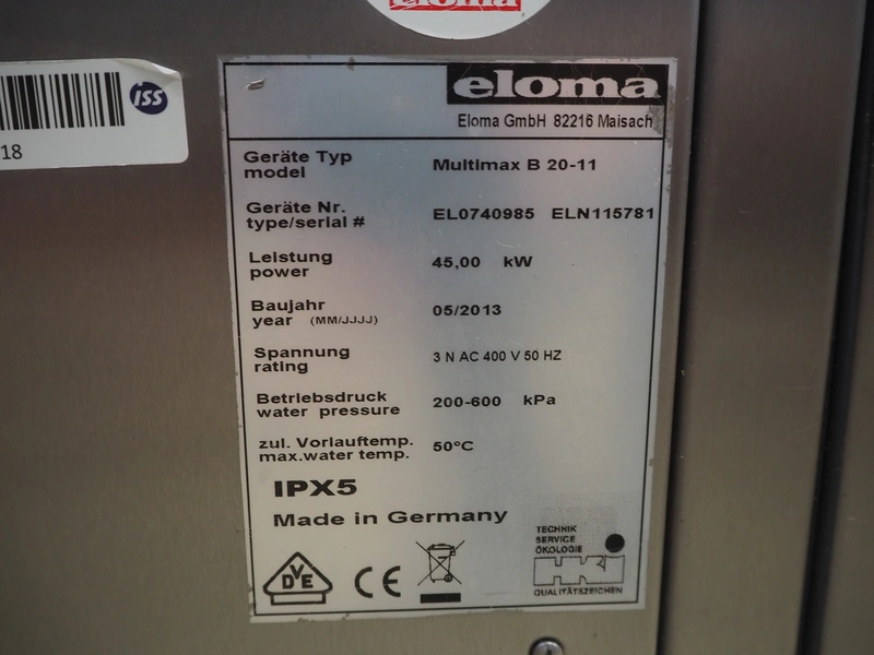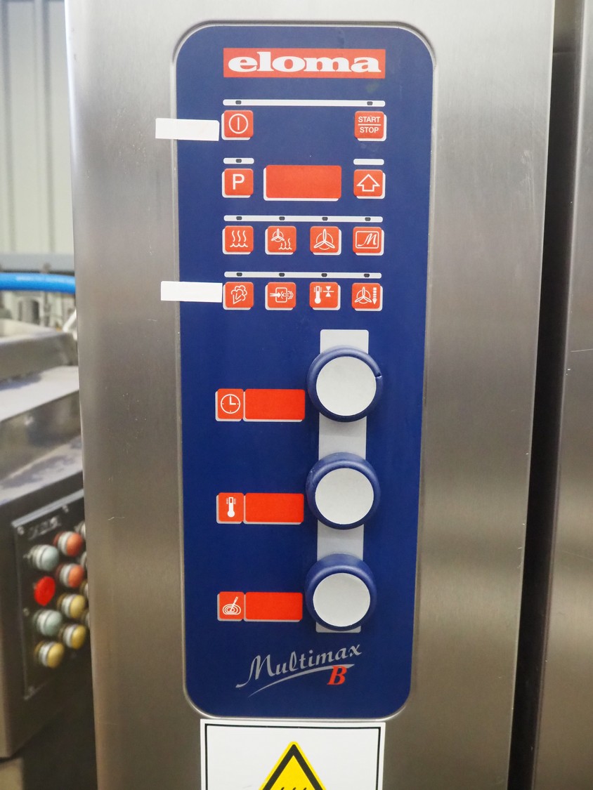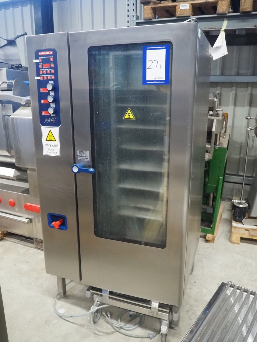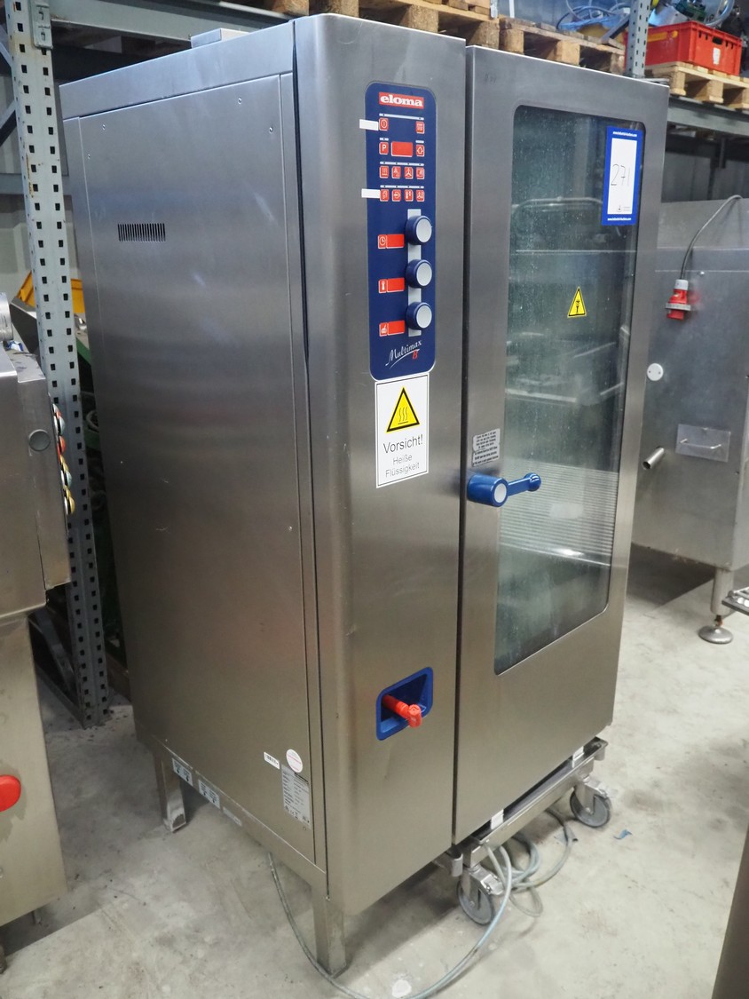 Eloma combi steamer, type: Multimax B 20-11, serial number: EL0740985 ELN115781, year of construction: 05/2013, 400 V, 3 Ph, 50 Hz, 45 kW, dimensions: 1040 mm x 930 mm x 1960 mm. Including s/s trolley, 20 floors, dimensions each floor: 540 mm x 330 mm,