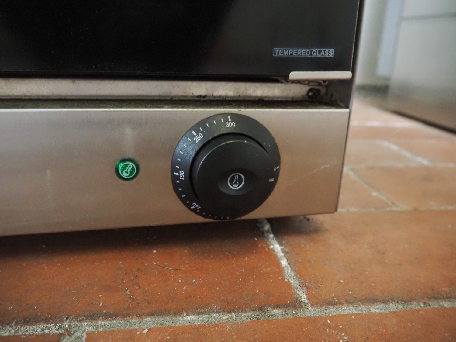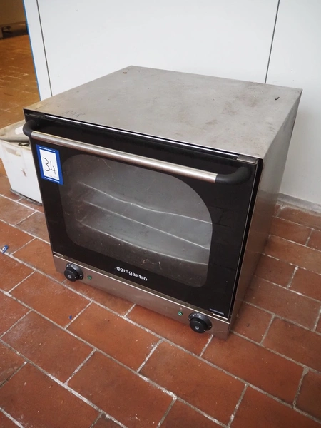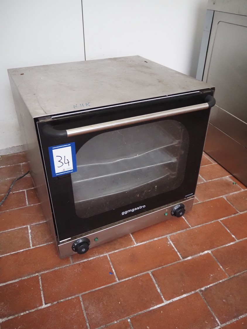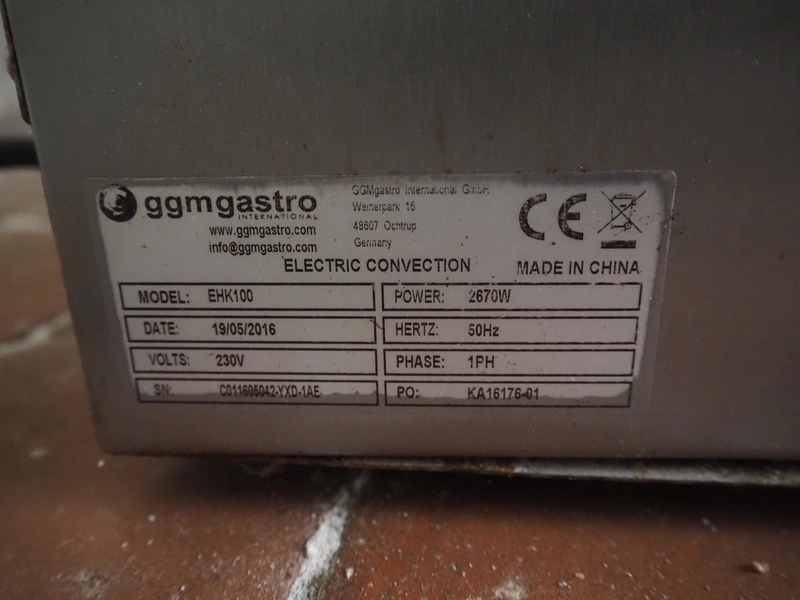 GGM Gastro International GmbH oven, model: EHK100, serial number: C011605042-YXD-1AE, year of construction: 19/05/2016, 230 V, 1 Ph, 50 Hz, 2670 W, 4 floors, dimensions each floor: 320 mm x 450 mm, total dimensions: 600 mm x 600 mm x 570 mm.