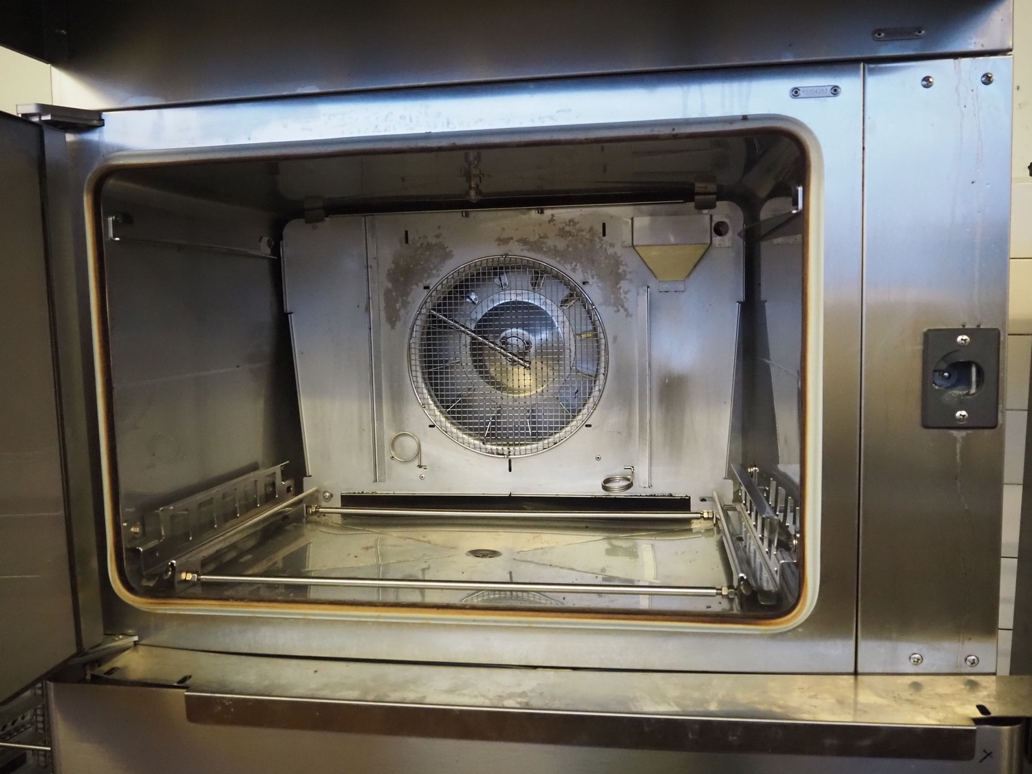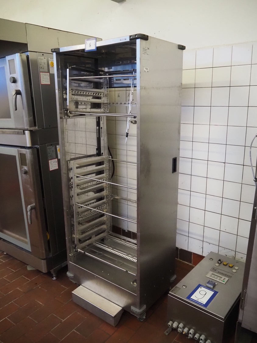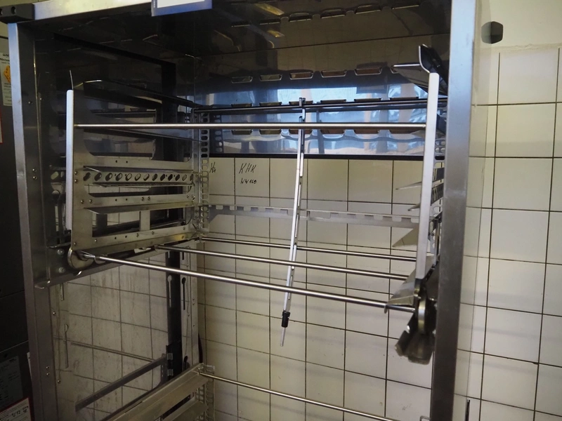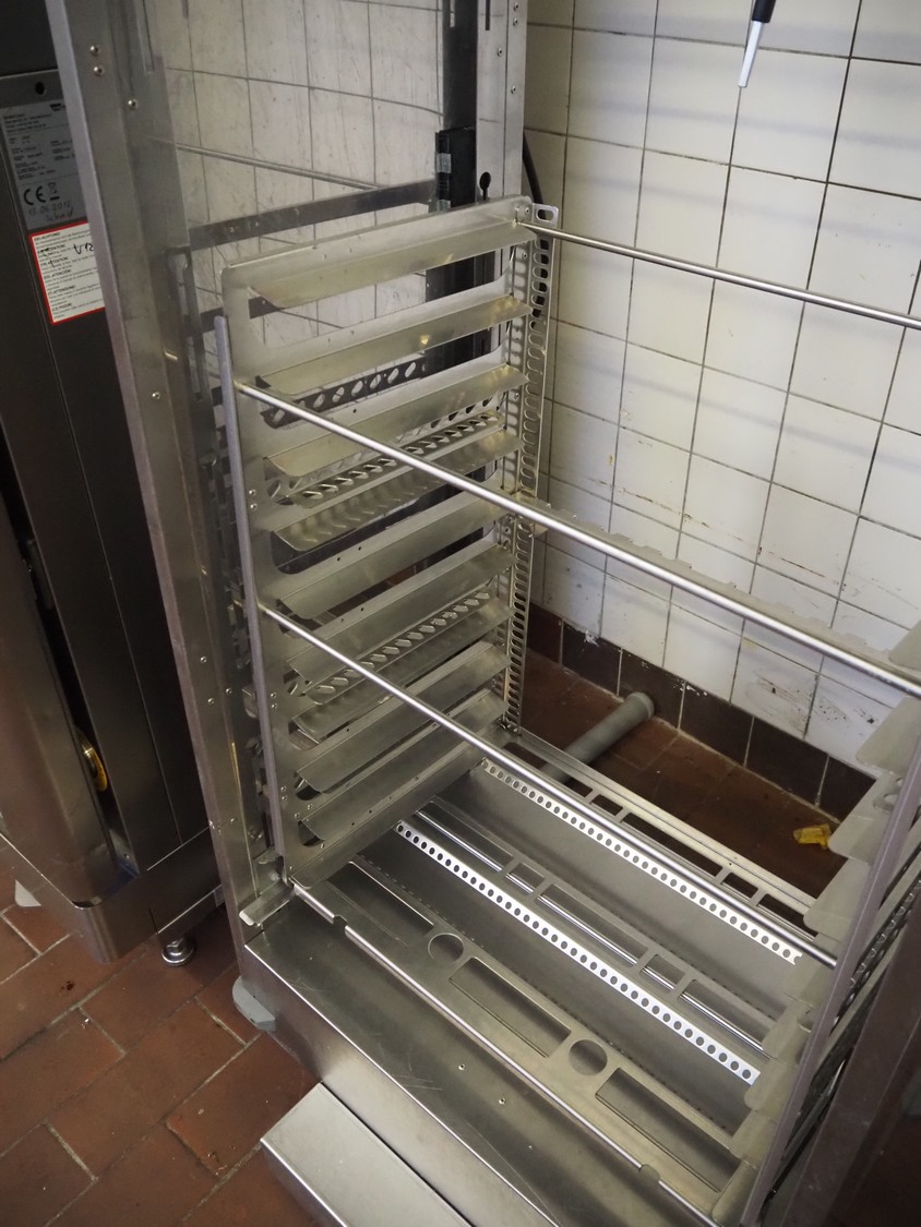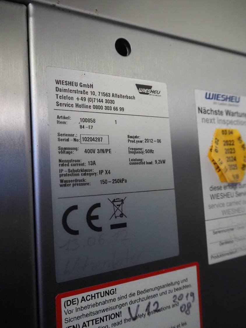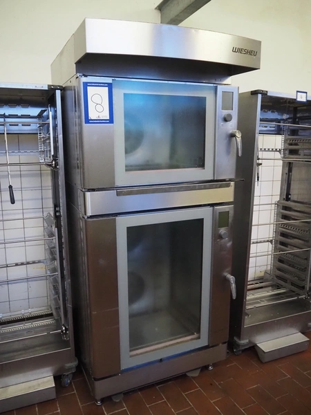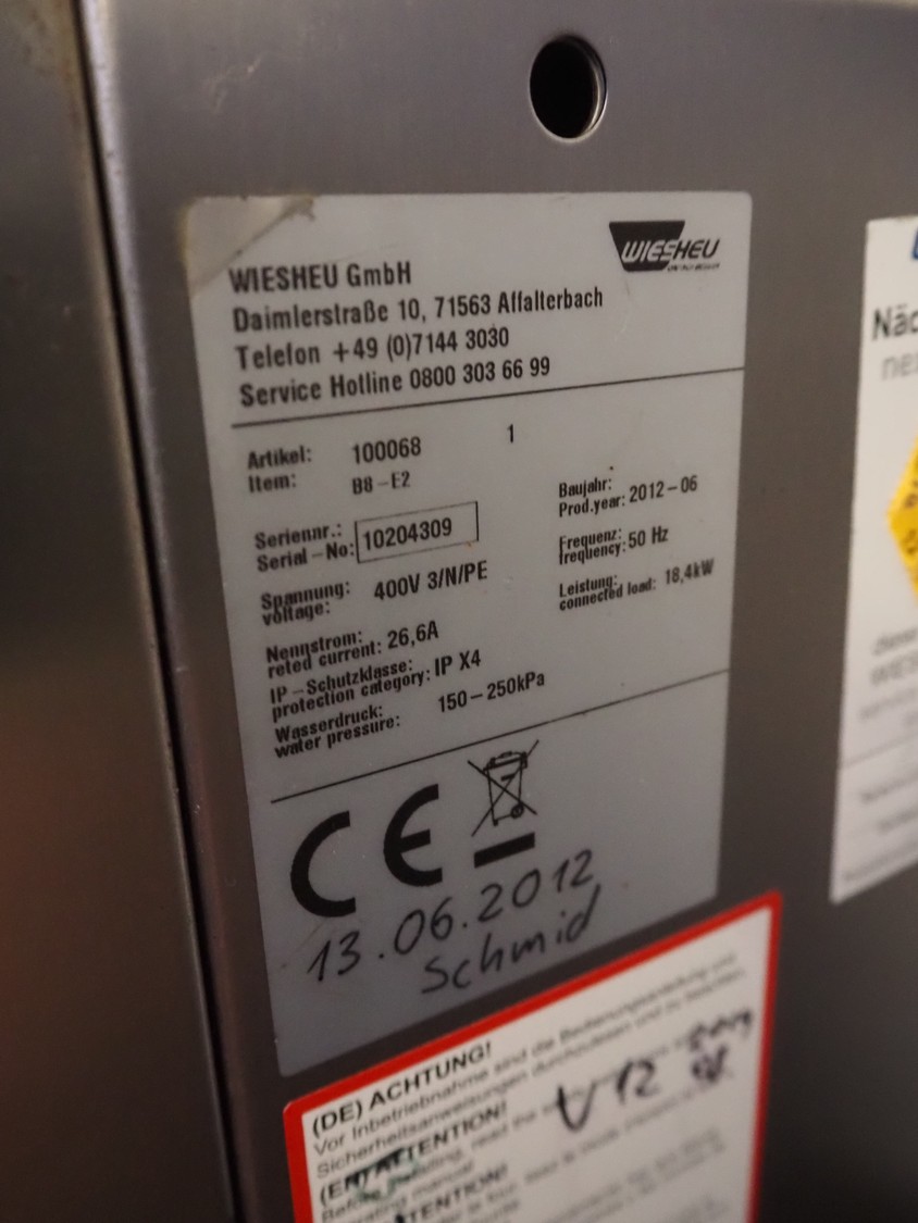 Wiesheu GmbH double stacked oven, model top oven: B4-E2, serial number: 10204287, year of construction: 2012-06, 400 V, 3 Ph, 50 Hz, 13 A, 9.2 kW, dimensions inside: 660 mm x 400 mm, model bottom oven: B8-E2, serial number: 10204309, year of construction: 2012-06, 400 V, 3 Ph, 50 Hz, 26.6 A, 18.4 kW, total dimensions: 1250 mm x 950 mm x 2250 mm. Including loading trolley, serial number: 10207281, year of construction: 2012-07, dimensions: 740 mm x 600 mm x 1950 mm.