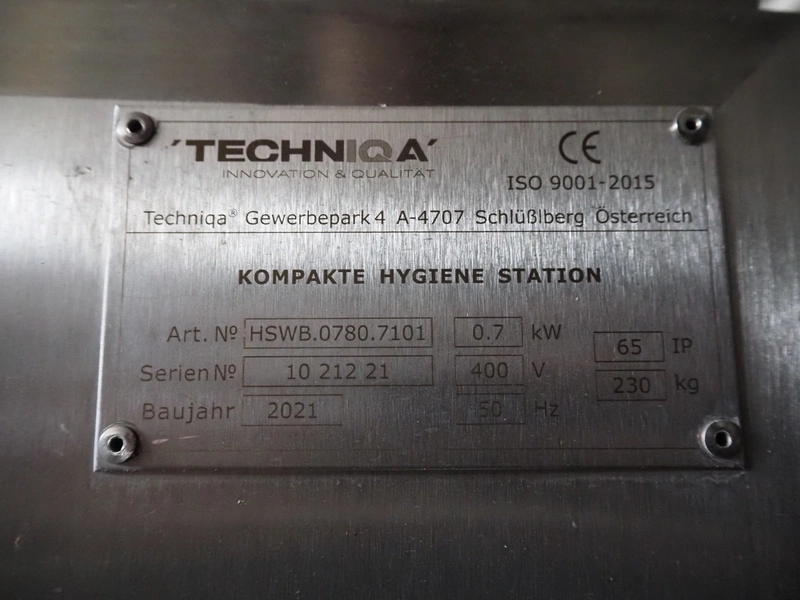 Techniqa hygiene station, serial number: 10 212 21, year of construction: 2021, 400 V, 50 Hz, 0.7 kW, weight: 230 kW, brush length: (2x) 750 mm, dimensions: 1650 mm x 930 mm x 2020 mm.