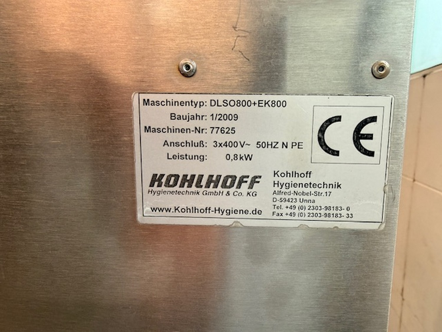 Kohlhoff hygiene station, type: DLSO800+EK800, machine number: 77625, year of construction: 1/2009, 3x 400 V, 50 Hz, 0.8 kW, dimensions: 1500 mm x 1200 mm x 1900 mm.