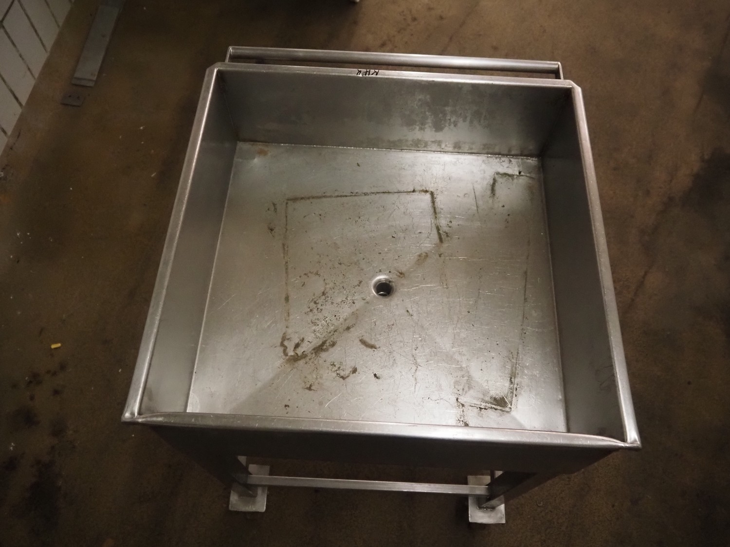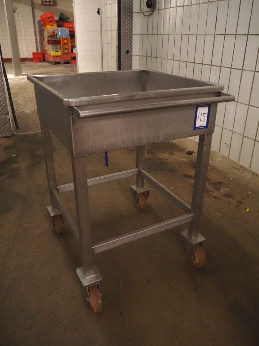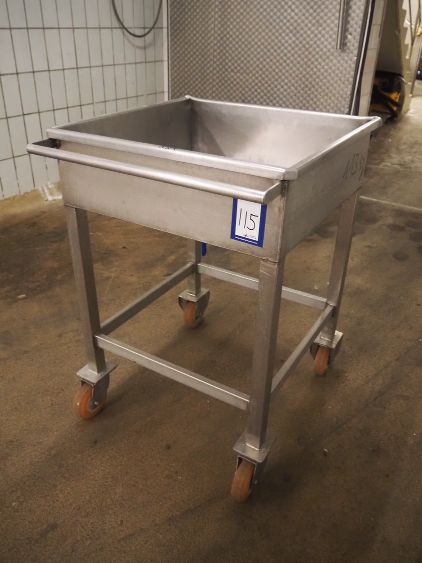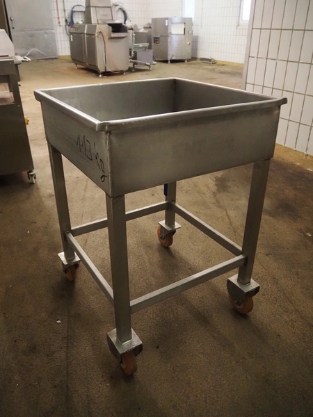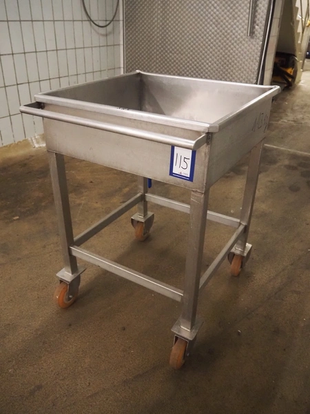 Mobile s/s tub with drain, inside dimensions: 600 mm x 580 mm, total dimensions: 700 mm x 650 mm x 900 mm.