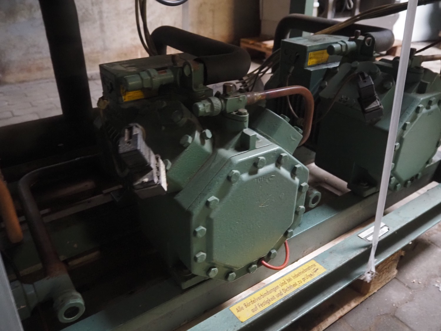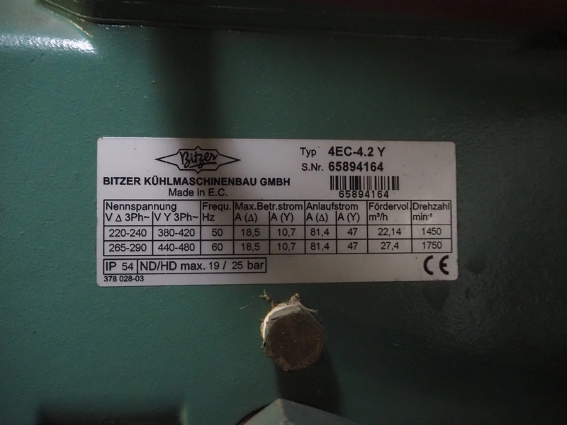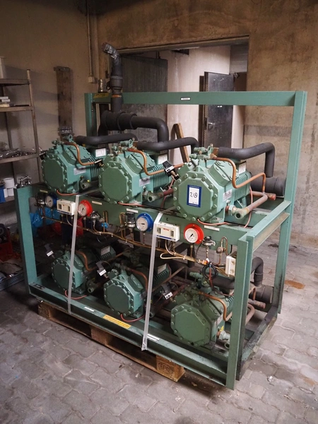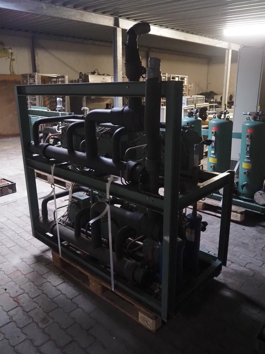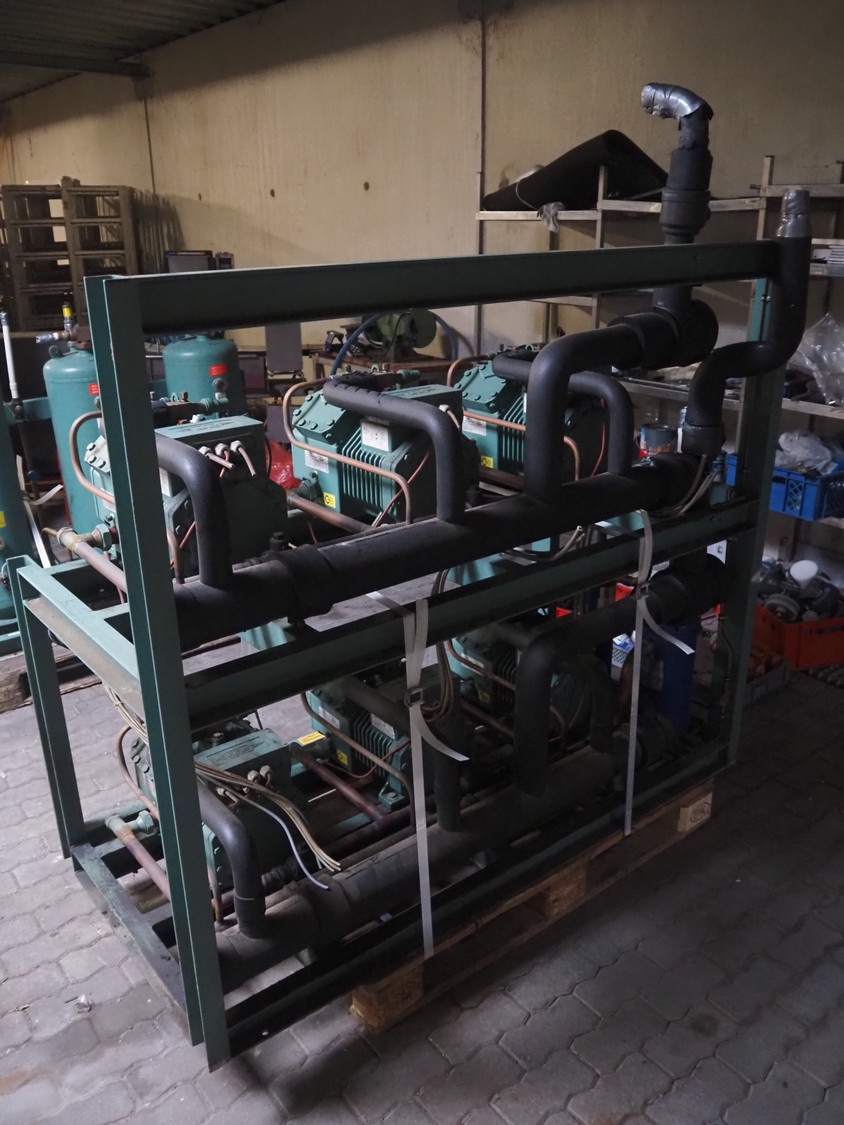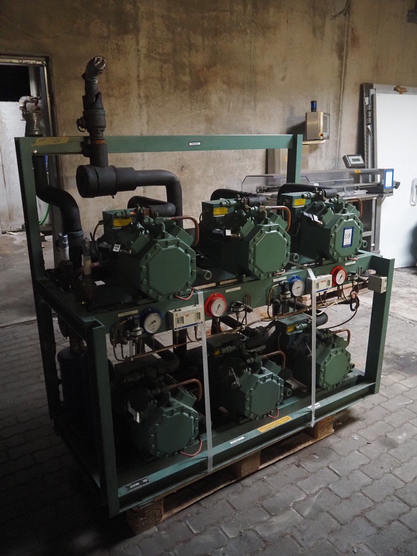 Compact Kältetechnik GmbH compressor rack, type: BX 3-68H, serial number: 210-00, year of construction: 10/00, 28/16 bar, refrigerant: R404A, consisting of: (6x) Bitzer Kühlmaschinenbau GmbH cooling compressors, type: (3x) 4EC-4.2 Y, (3x) 4EC-6.2 Y, 380 / 420 / 440 / 480 V, 3 Ph, 50/60 Hz, capacity: 22.14/27.4 m³ per hour, dimensions: 1650 mm x 800 mm x 1720 mm.