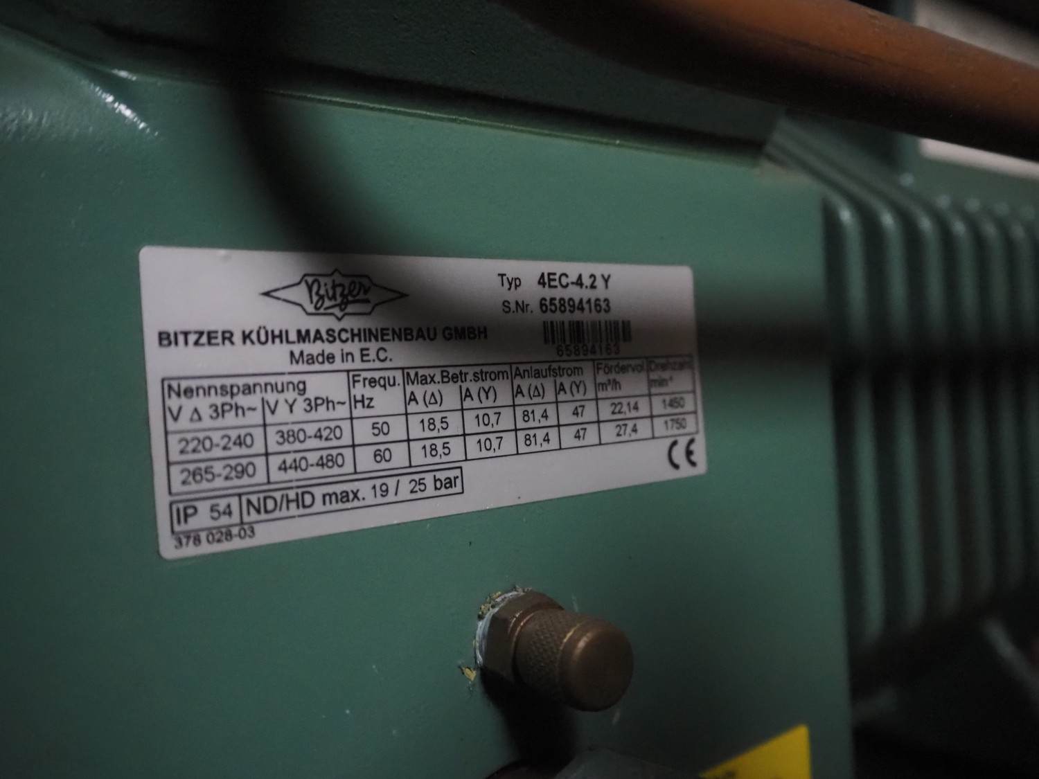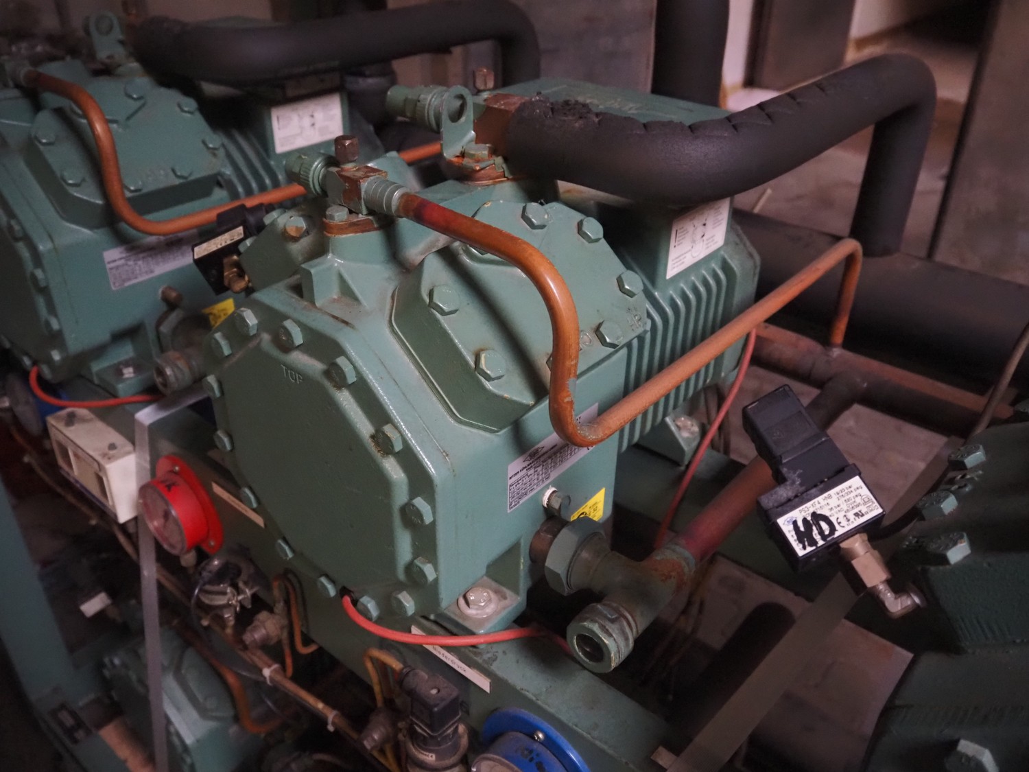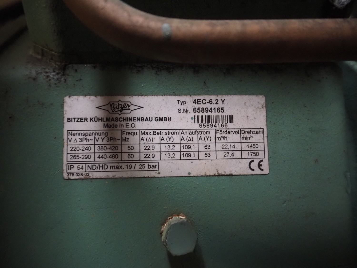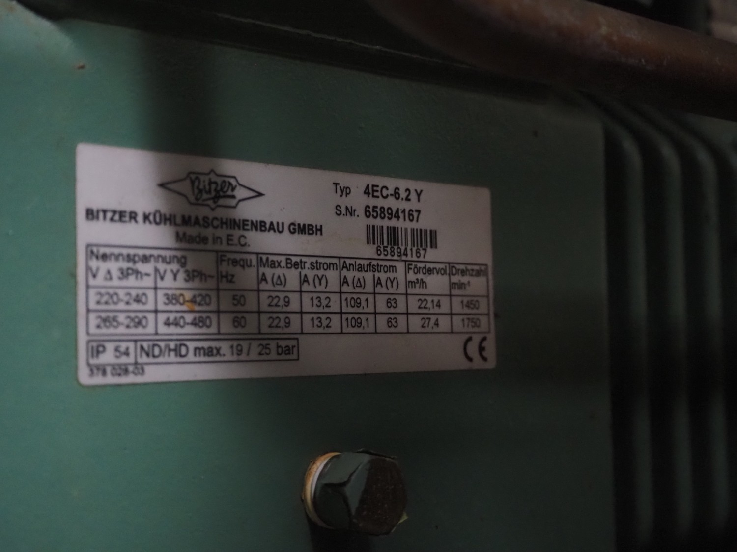 Compact Kältetechnik GmbH compressor rack, type: BX 3-68H, serial number: 210-00, year of construction: 10/00, 28/16 bar, refrigerant: R404A, consisting of: (6x) Bitzer Kühlmaschinenbau GmbH cooling compressors, type: (3x) 4EC-4.2 Y, (3x) 4EC-6.2 Y, 380 / 420 / 440 / 480 V, 3 Ph, 50/60 Hz, capacity: 22.14/27.4 m³ per hour, dimensions: 1650 mm x 800 mm x 1720 mm.