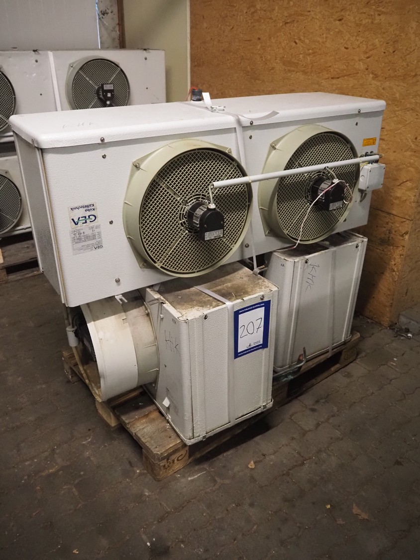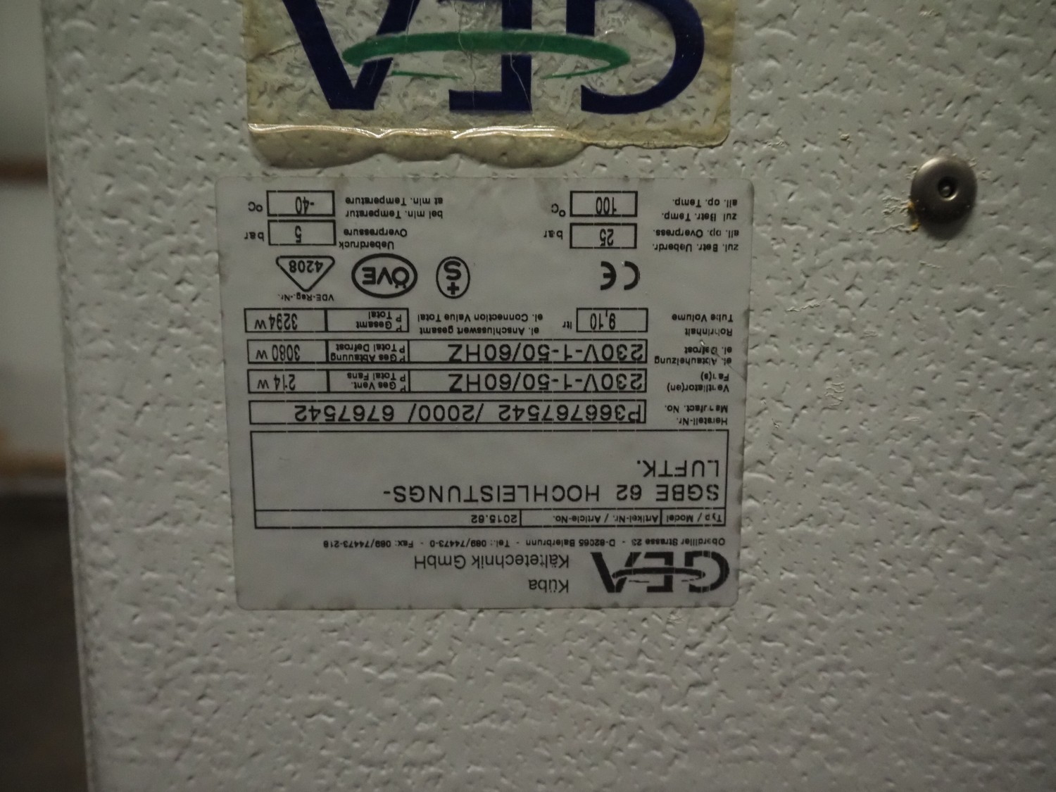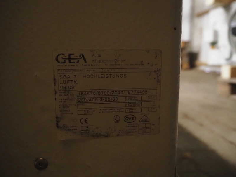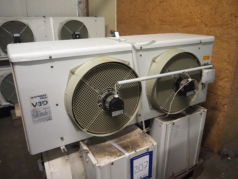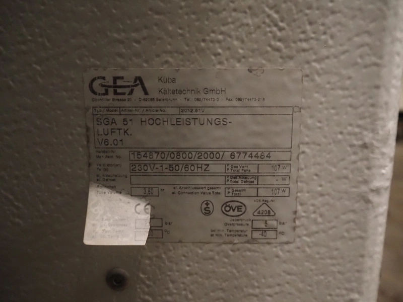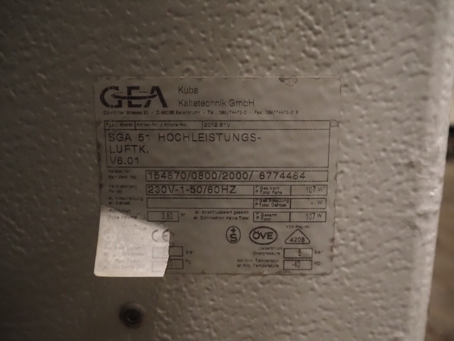 3 GEA Küba Kältetechnik GmbH evaporators, (1x) type: SBE 62, number: P366767542/2000/6767542, year of construction: 2000, 230 V, 1 Ph, 50/60 Hz, 3294 W, dimensions: 1360 mm x 700 mm x 520 mm, (1x) type: SGA 51, number: 154870/0800/2000/6774484, year of construction: 2000, 230 V, 1 Ph, 50/60 Hz, 107 W, dimensions: 900 mm x 700 mm x 520 mm, (1x) type: SGA 51, number: 154870/0700/2000/6774488, year of construction: 2000, 230 V, 3 Ph, 50/60 Hz, 5150 W, dimensions: 900 mm x 700 mm x 520 mm.