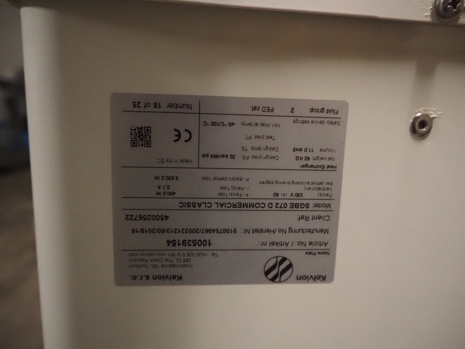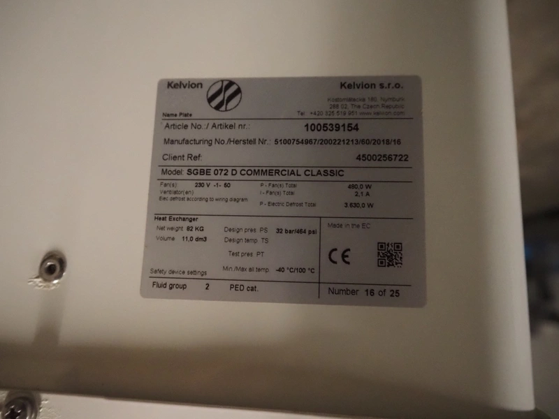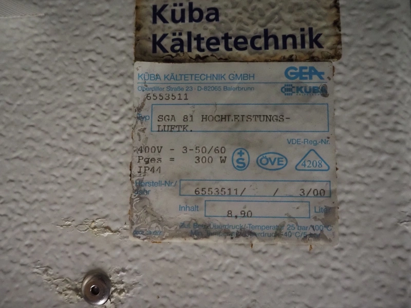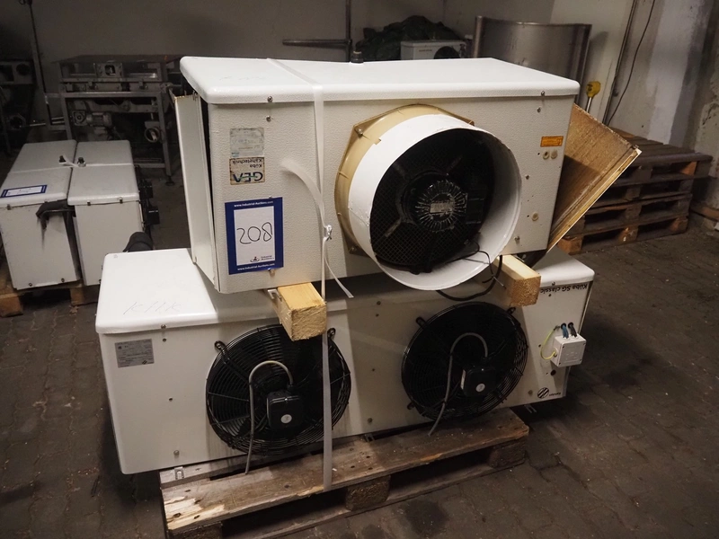 1 GEA Küba Kältetechnik GmbH evaporator, type: SGA 81, number: 6553511, 400 V, 3 Ph, 50/60 Hz, 300 W, dimensions: 1050 mm x 810 mm x 520 mm, (1x) Kelvion evaporator, type: SGBE 072 D, number: 5100754967/200221213/60/2018/16, year of construction: 2016, 230 V, 1 Ph, 50 Hz, 3630 W, dimensions: 1580 mm x 860 mm x 520 mm.
