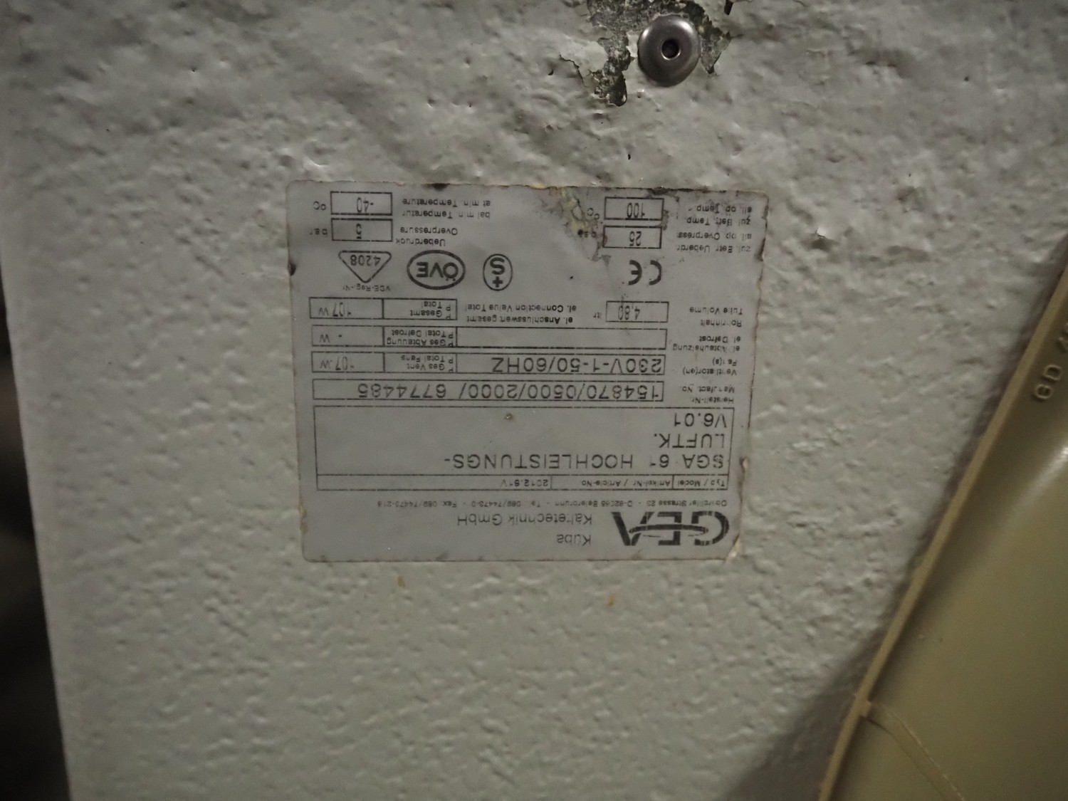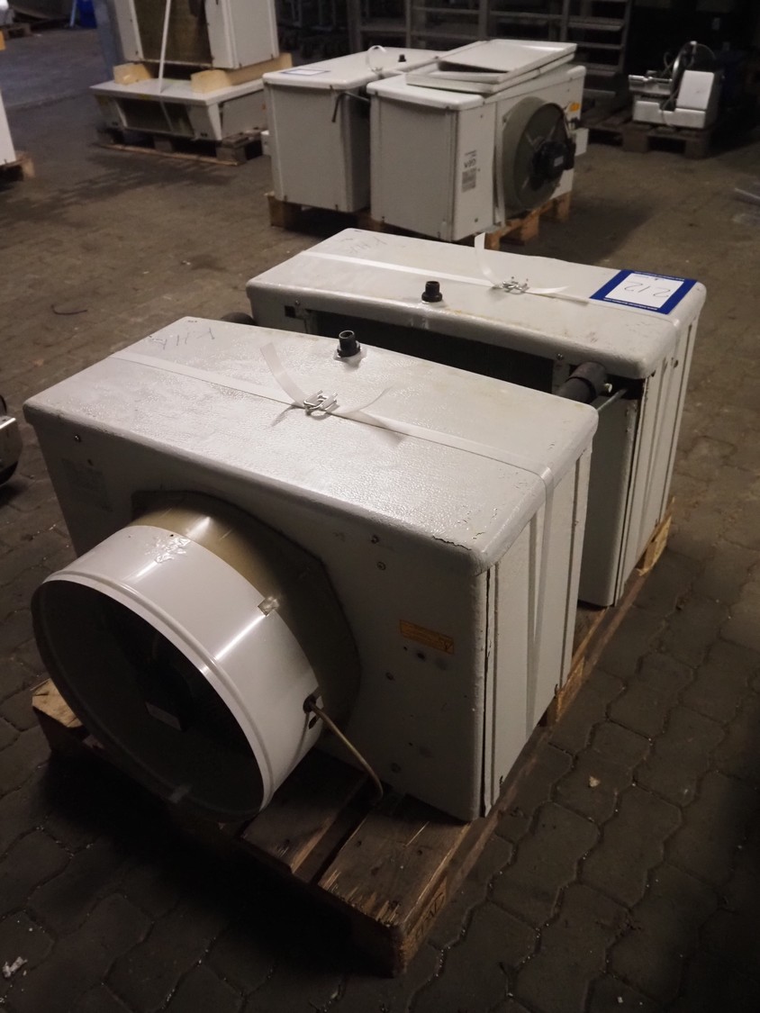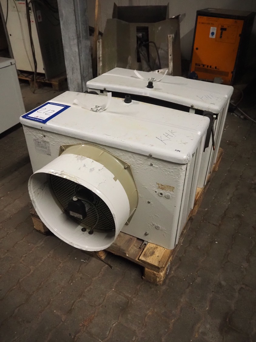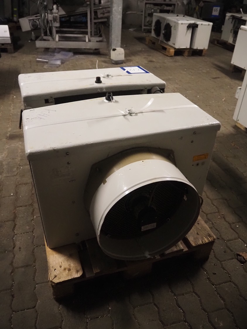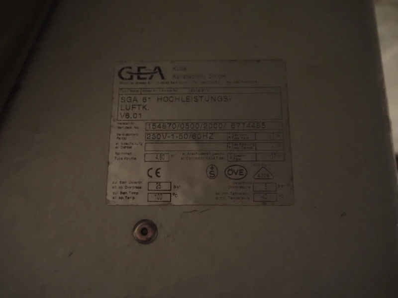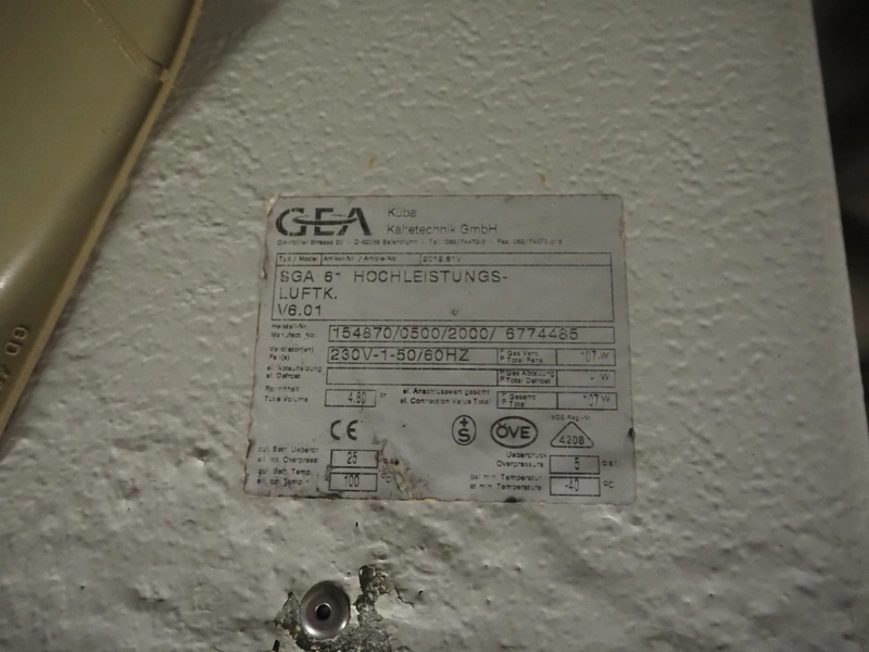 2 GEA Küba Kältetechnik GmbH evaporators, type: (2x) SGA 61, number: 154870/0500/2000/6774485, year of construction: 2000, 230 V, 1 Ph, 50/60 Hz, 107 W, dimensions: (2x) 820 mm x 750 mm x 520 mm.