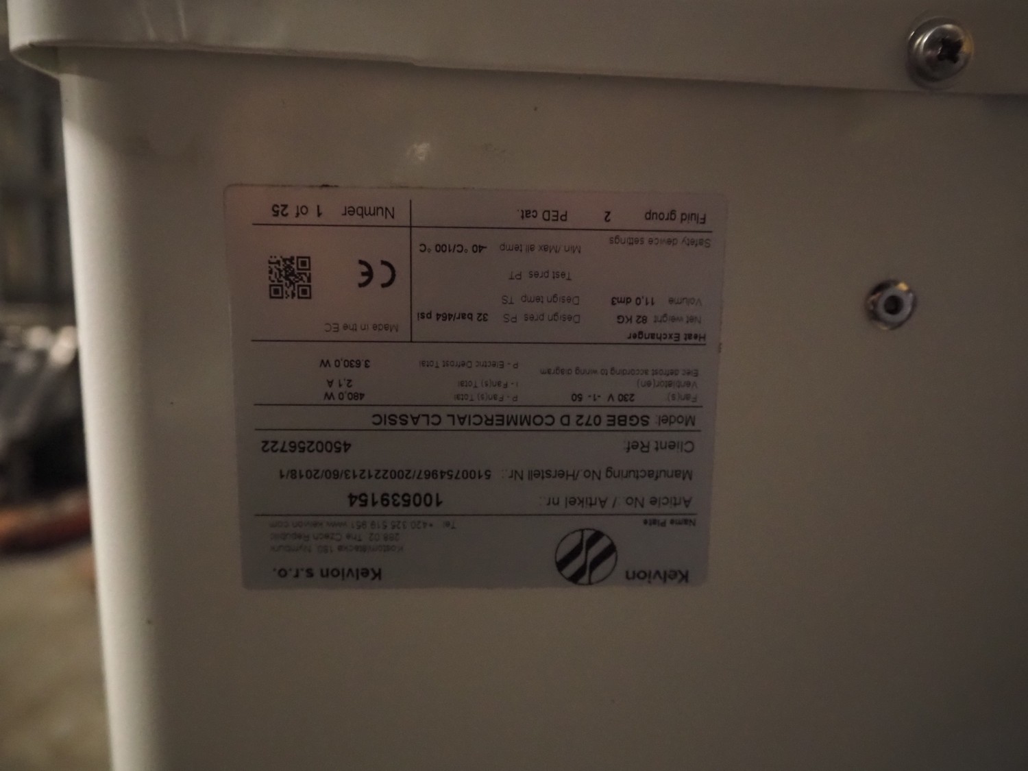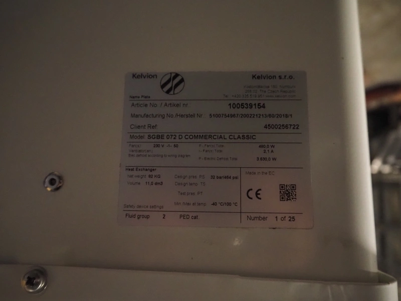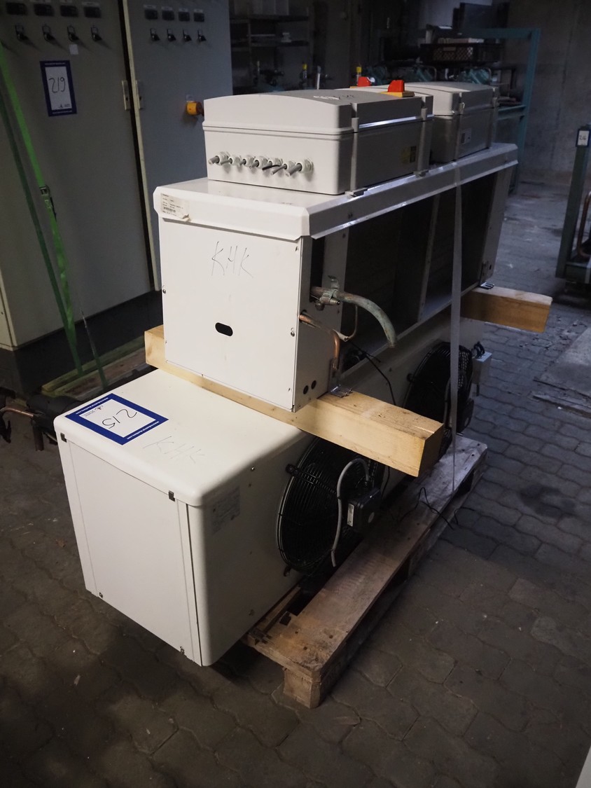 (1x) Günther AG & Co. KG evaporator, type: GHF 031.2F/27-ENW50.E, serial number: 400/1351892.0007, year of construction: 2011, dimensions: 1200 mm x 520 mm x 420 mm, (1x) Kelvion evaporator, type: : SGBE072 D, number: 5100754967/200221213/60/2018/1, year of construction: 2018, 230 V, 1 Ph, 50 Hz, 2.1 A, 3630 W, dimensions: 1500 mm x 820 mm x 540 mm. Including 2 Pego control units.