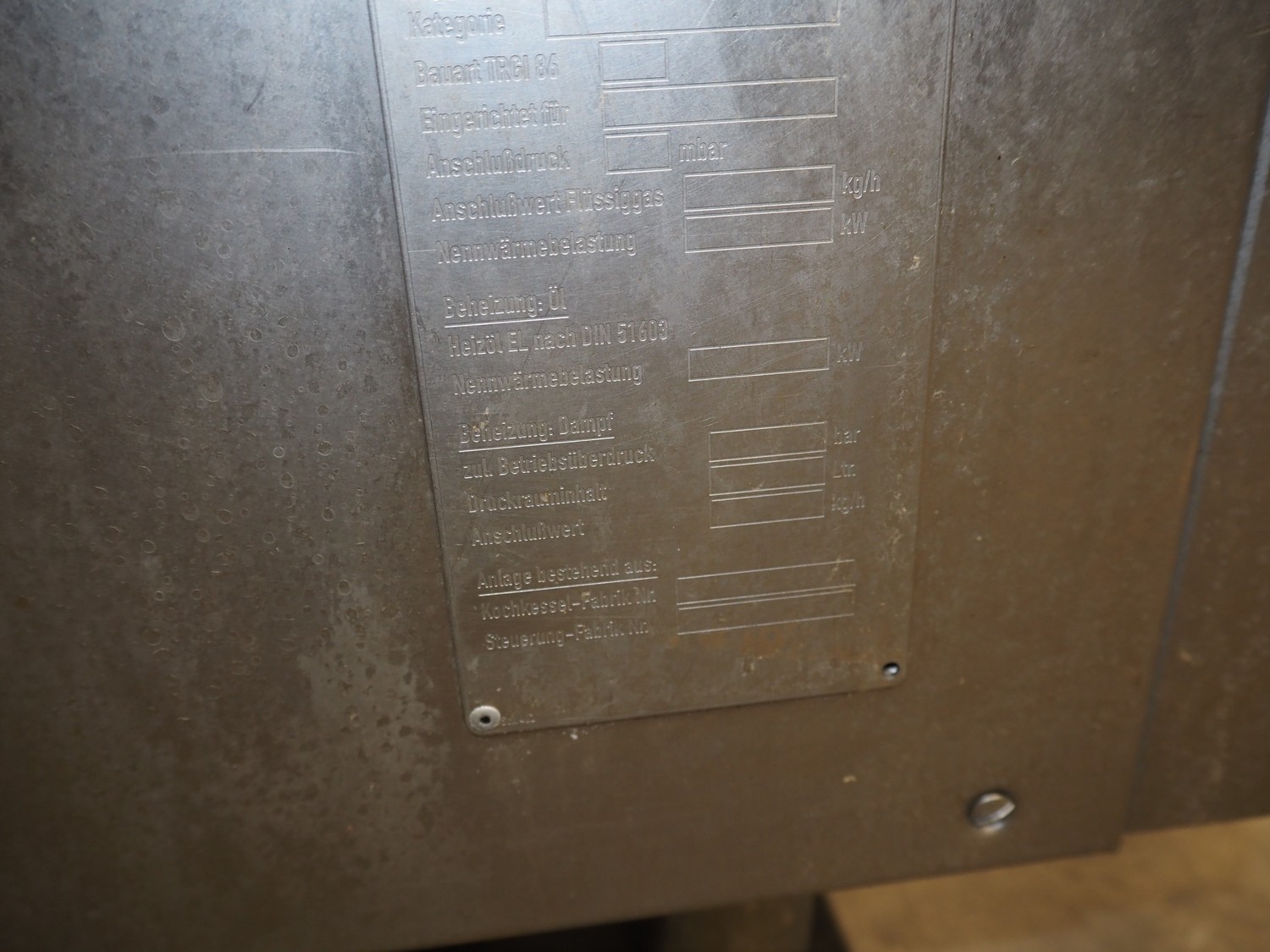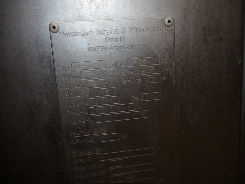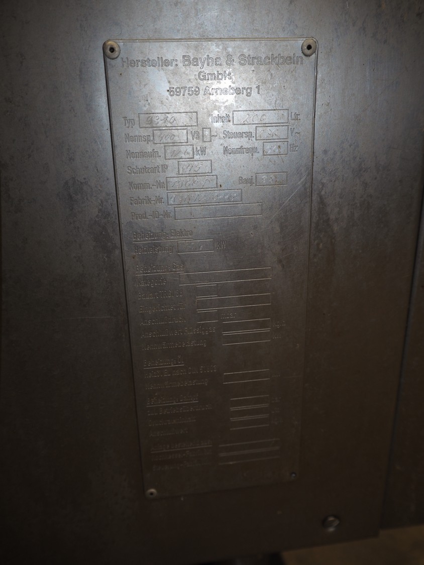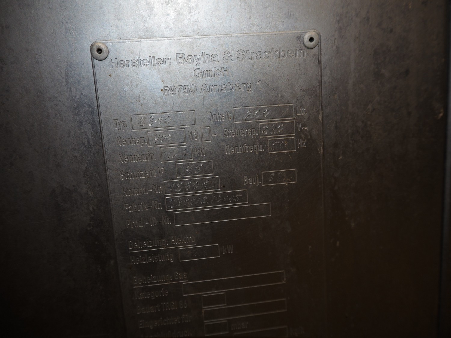 Bayha & Strackbein GmbH cooking vessel, type: 9310, number: 9310/2/0115, year of construction: 1998, 400 V, 3 Ph, 50 Hz, 12.6 kW, inside dimensions: 600 mm x 800 mm x 420 mm, total dimensions: 840 mm x 1400 mm x 1030 mm.