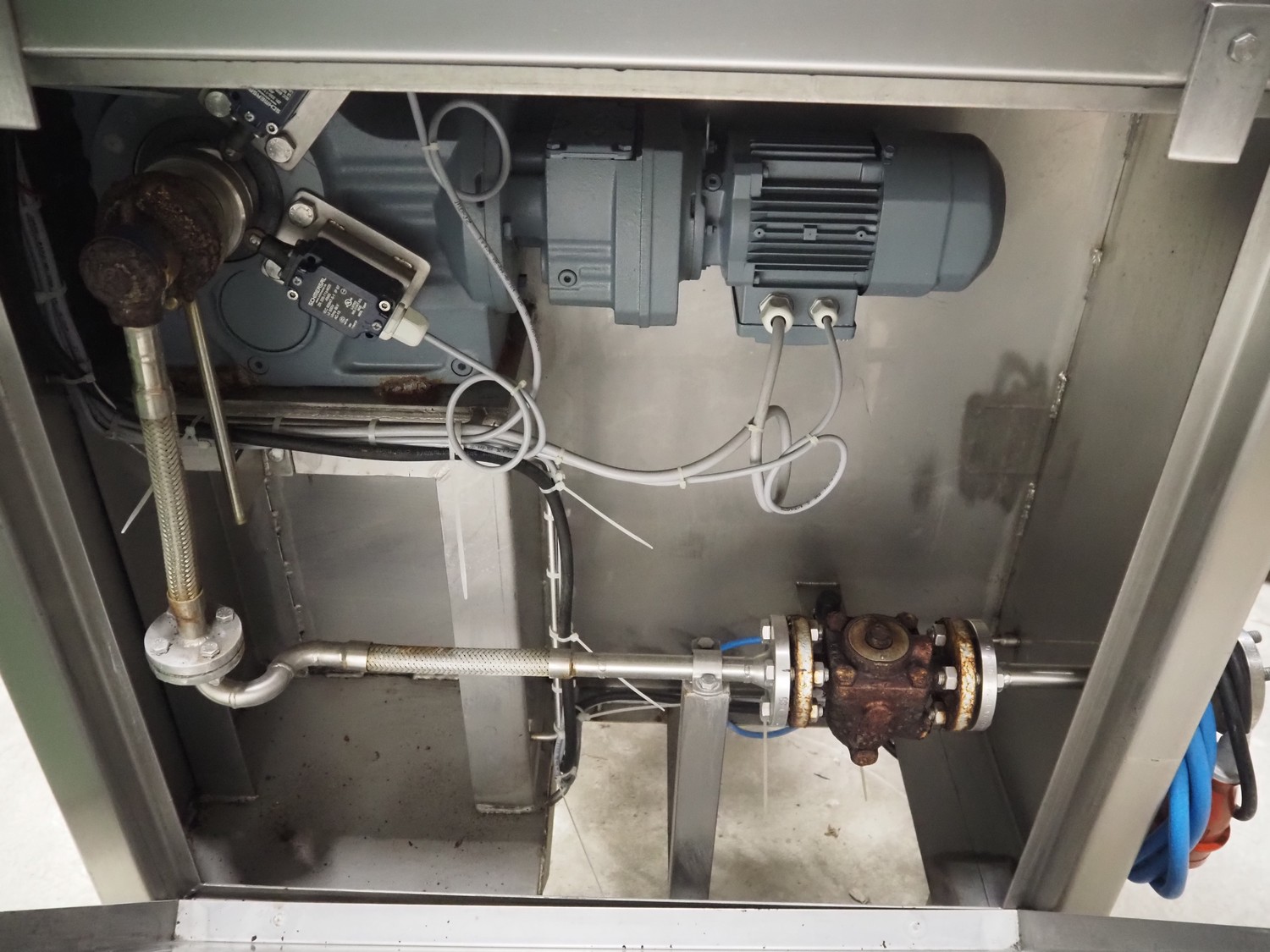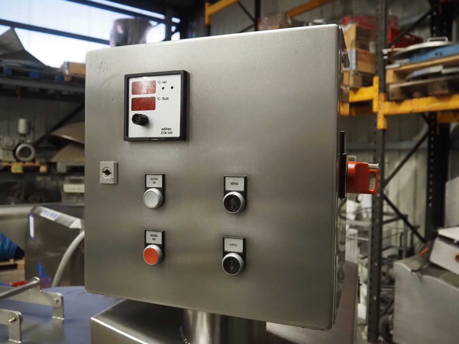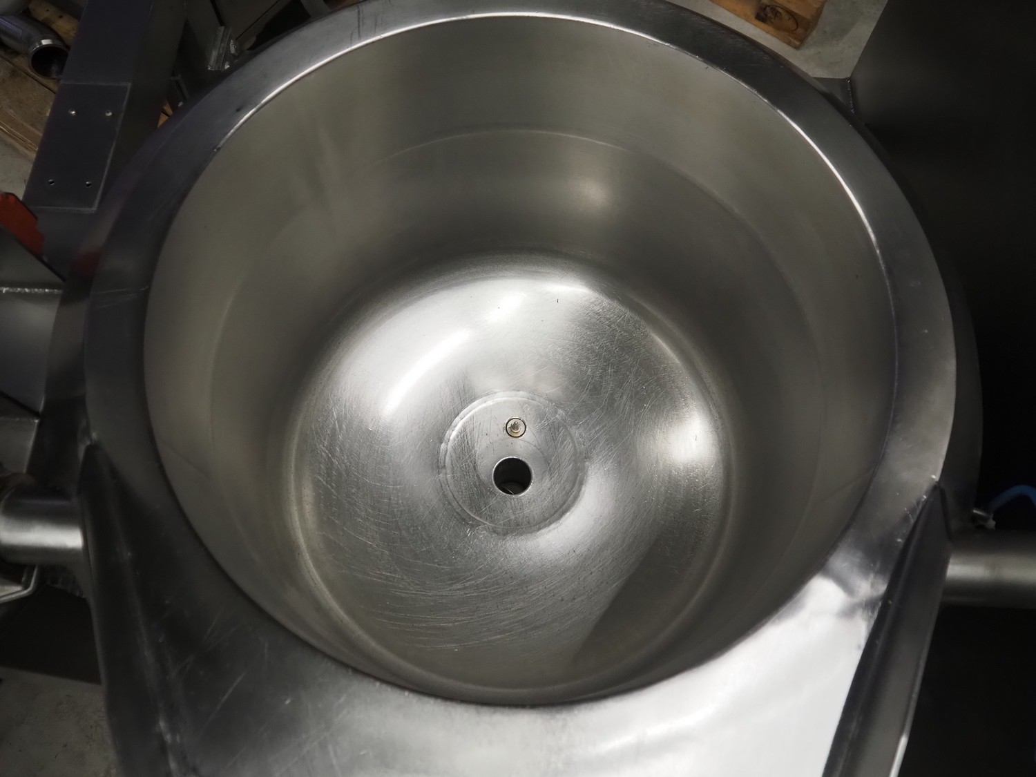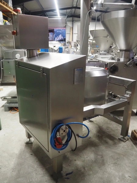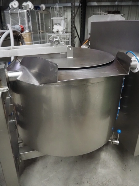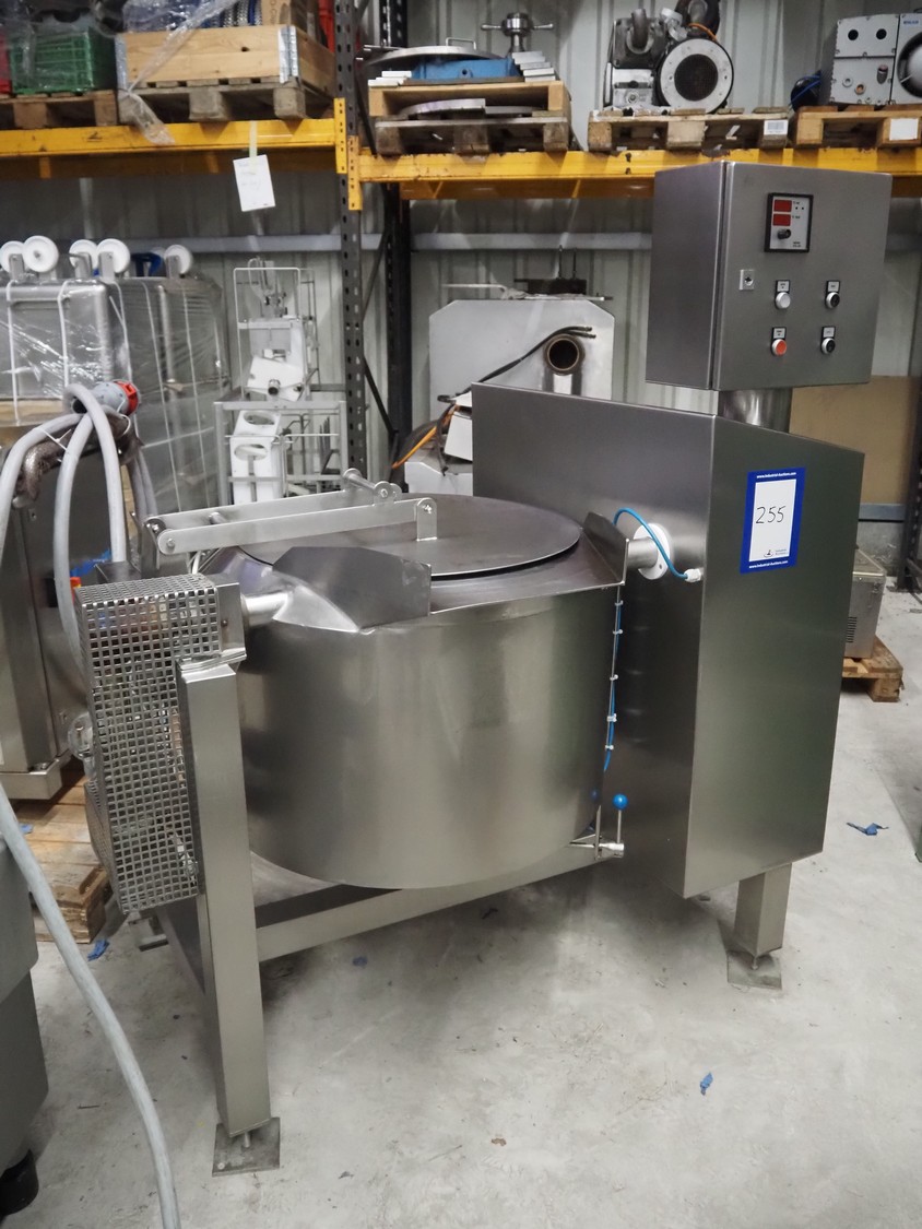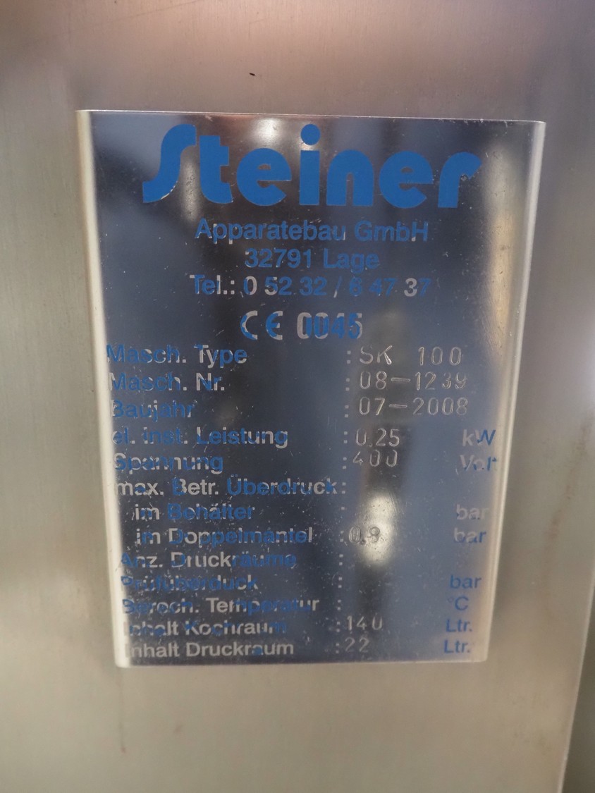 Steiner Apparatebau GmbH double jacketed cooking vessel, type: SK100, number: 08-1239, year of construction: 07-2008, 400 V, volume: 140 liter, dimensions: 1550 mm x 1100 mm x 1730 mm. Missing agitator.
