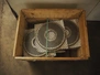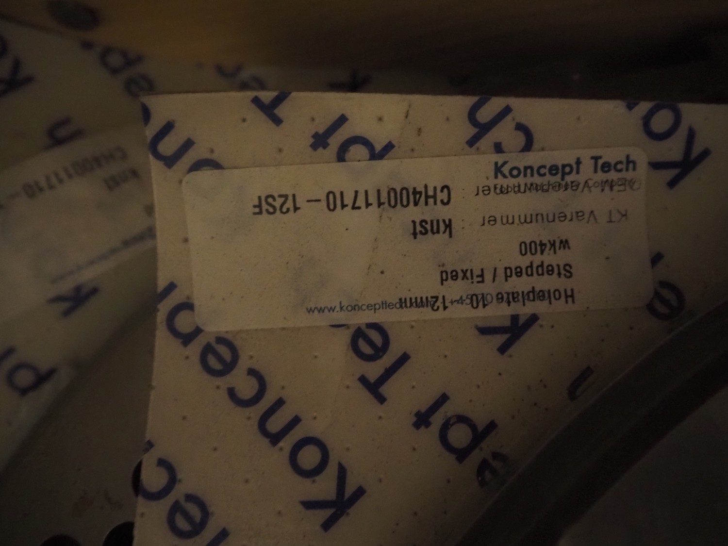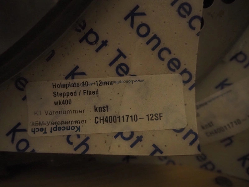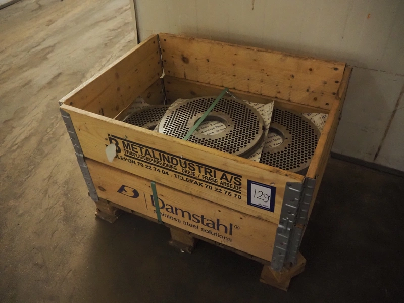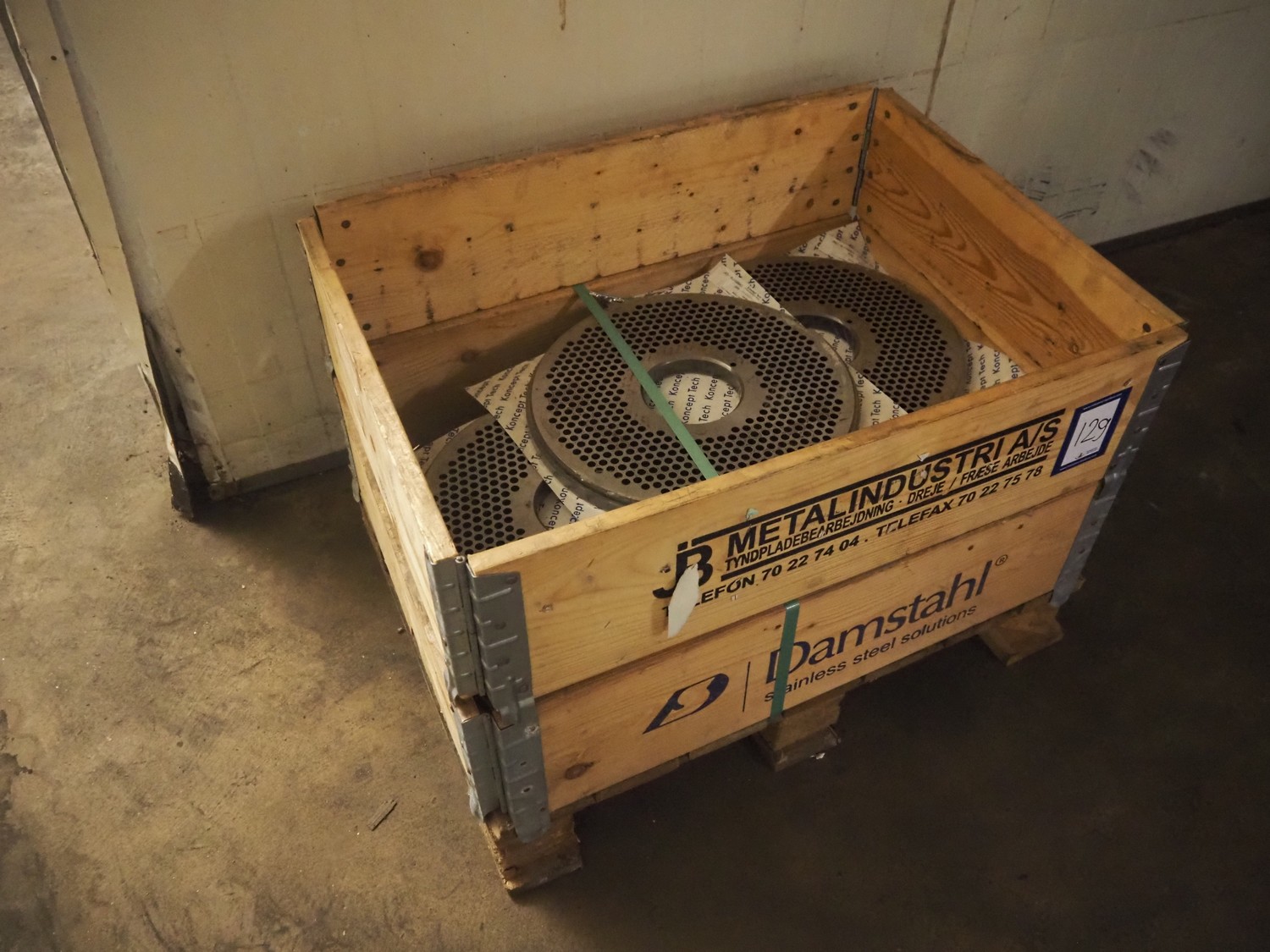 Pallet with Koncept Tech hole plates for micro cutter, hole plates: 10-12 mm, diameter plates: 400 mm, total dimensions: 800 mm x 600 mm x 500 mm.