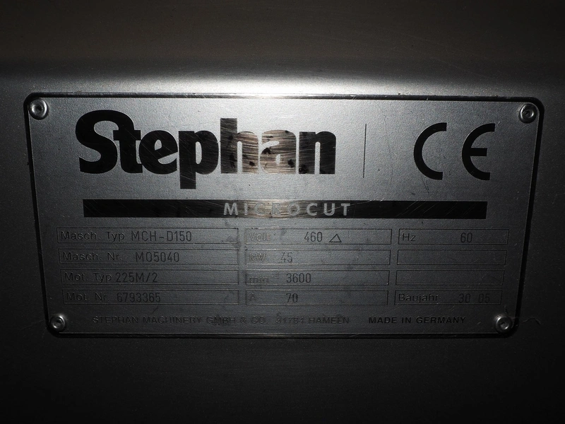 Stephan micro cutter, type: MHC-D150, number: M05040, year of construction: 30-05, 460 V, 60 Hz, 70 A, 45 kW, water cooled, dimensions: 1450 mm x 900 mm x 800 mm. Incomplete.