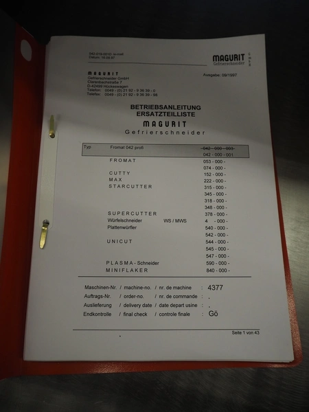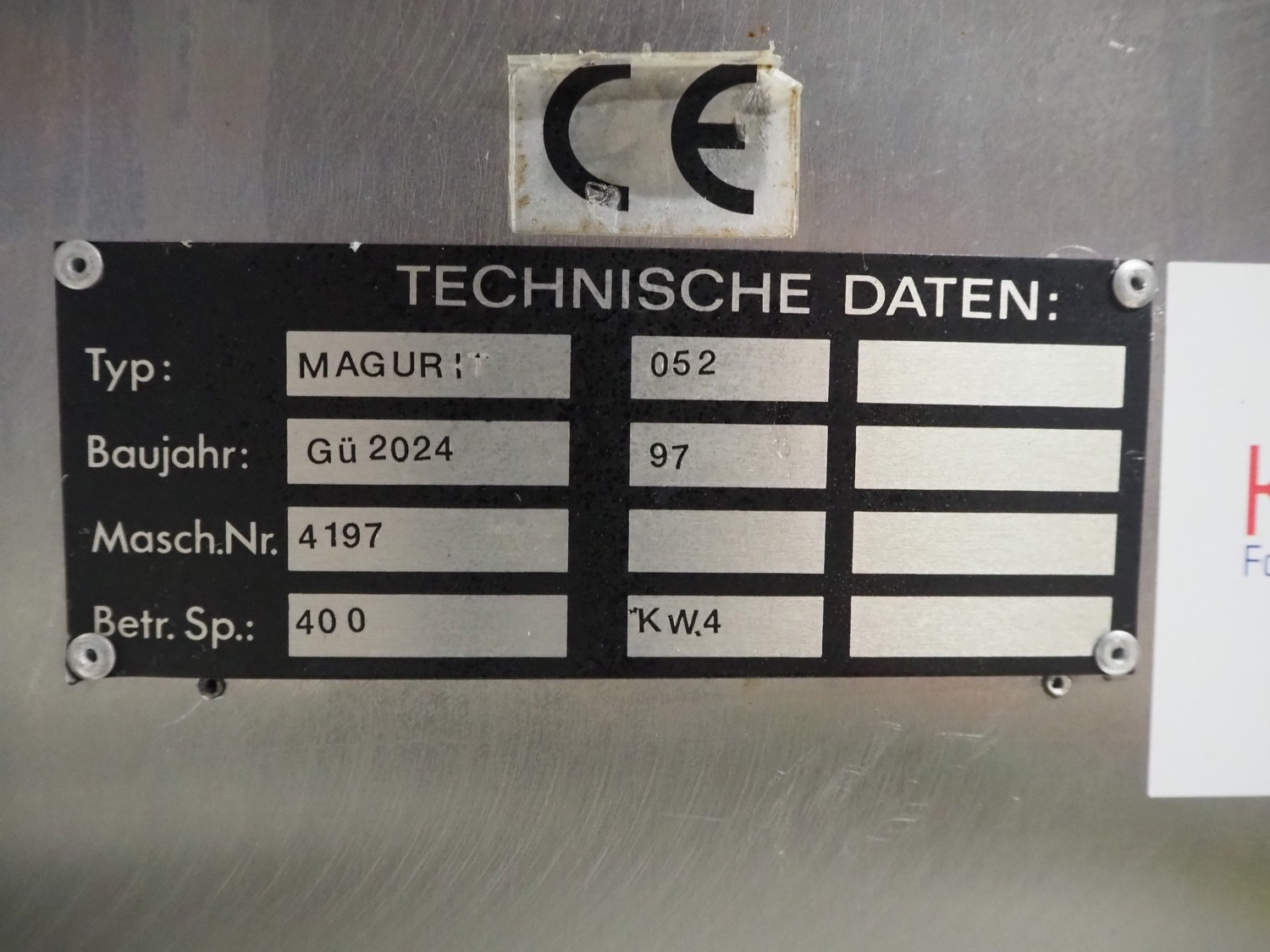 Magurit GmbH frozen block cutter, type: MAGURIT 052, machine number: 4197, year of construction: 1997, 400 V, 4 kW, clearance: 465 mm x 210 mm, total dimensions: 1650 mm x 750 mm x 1630 mm.