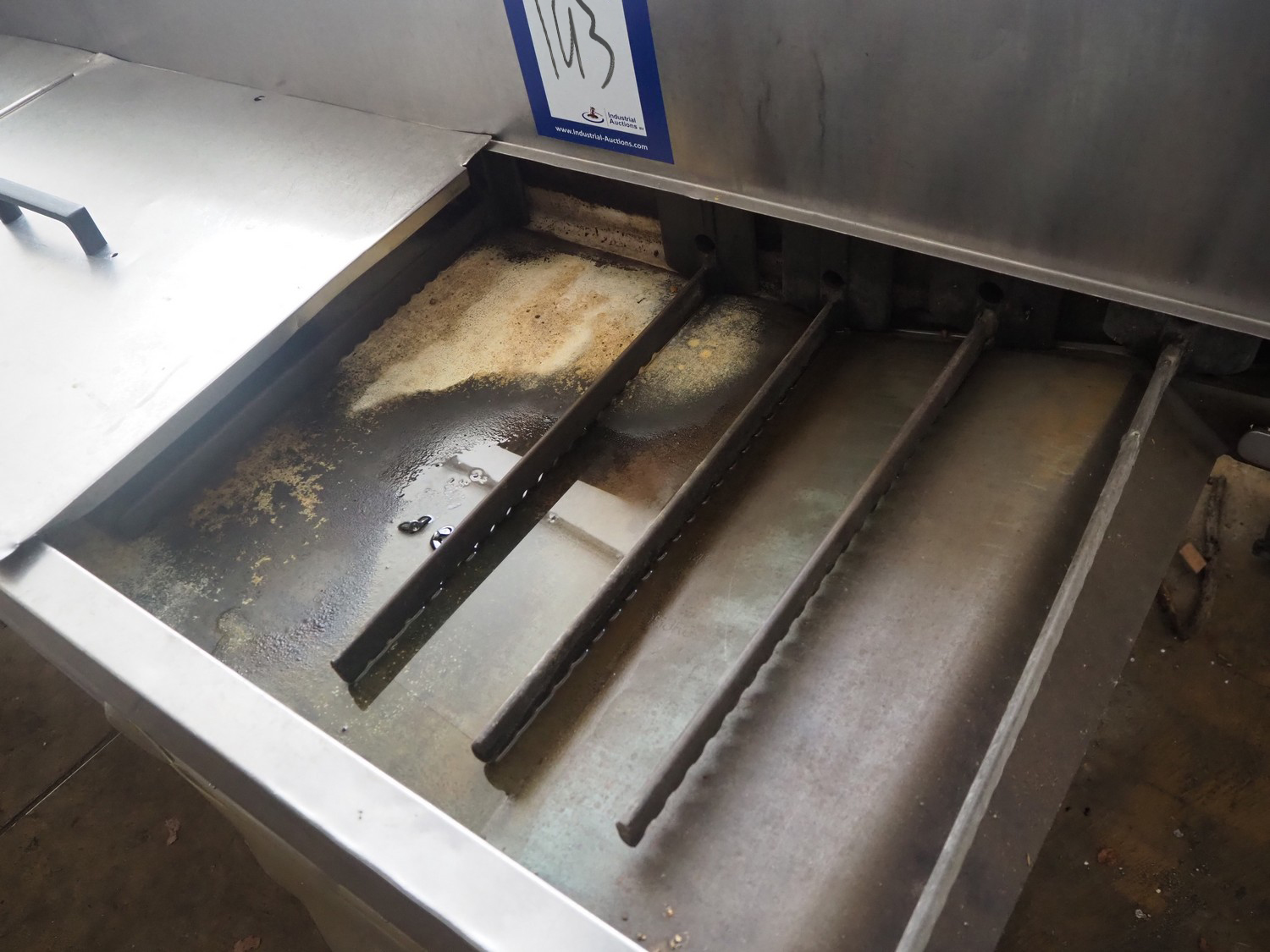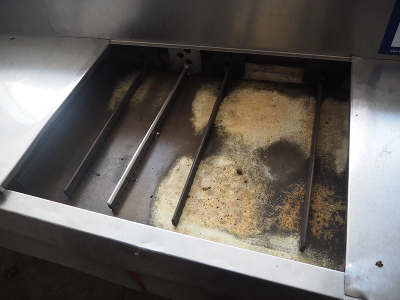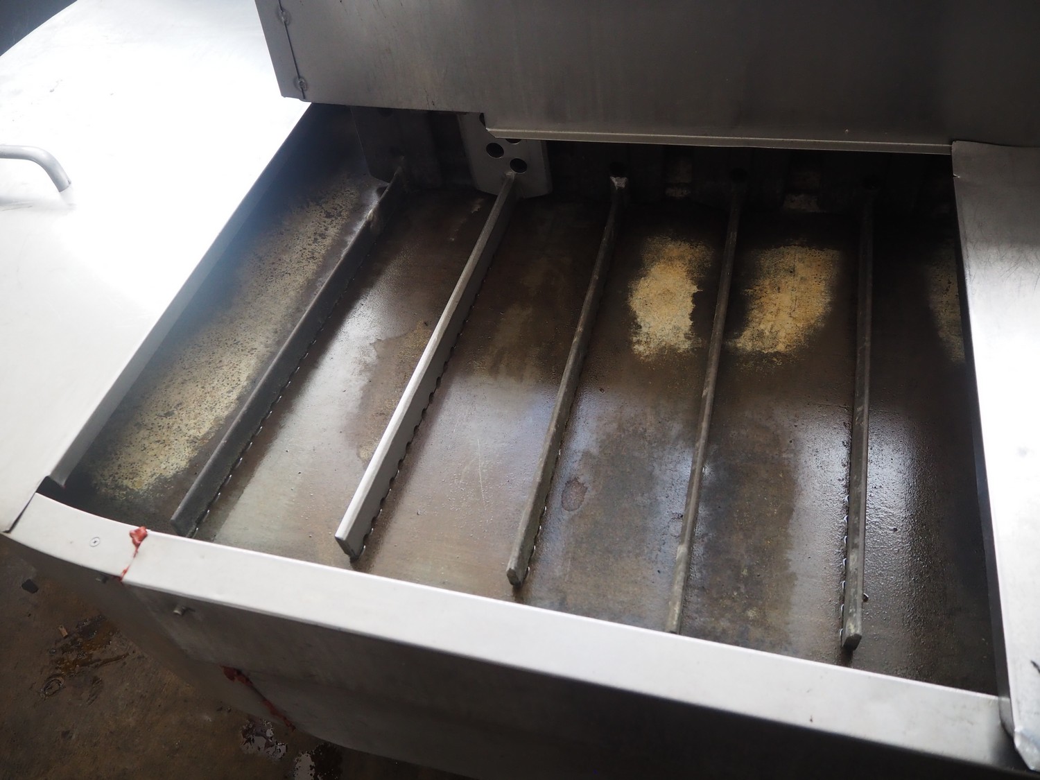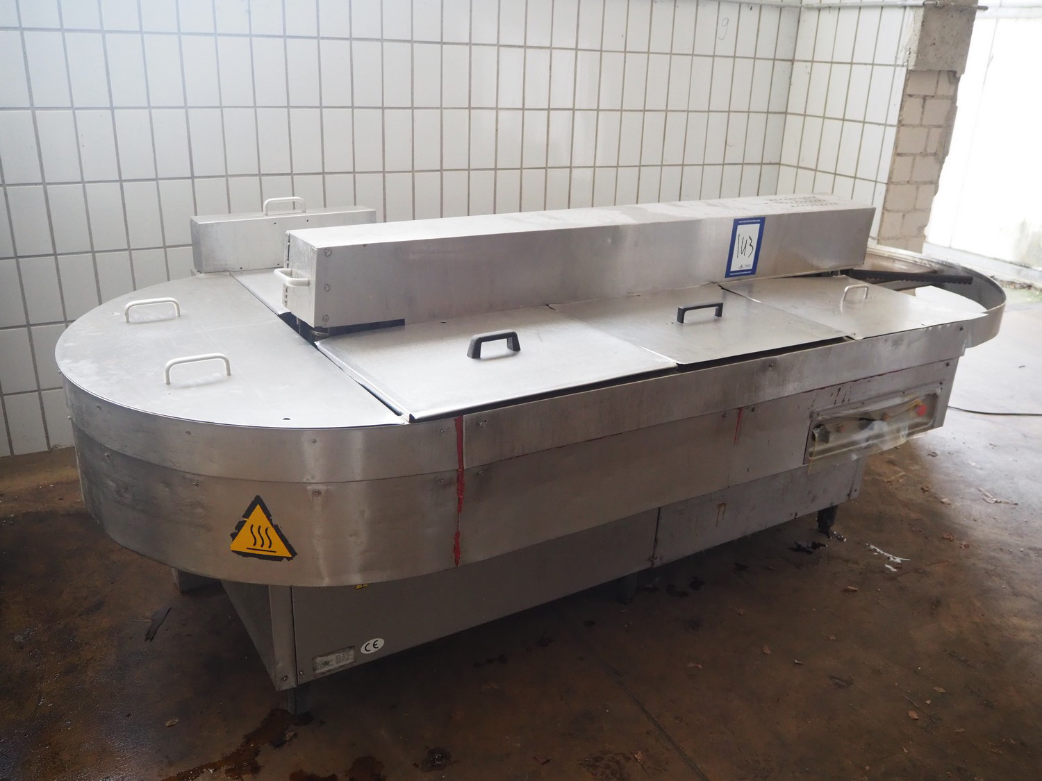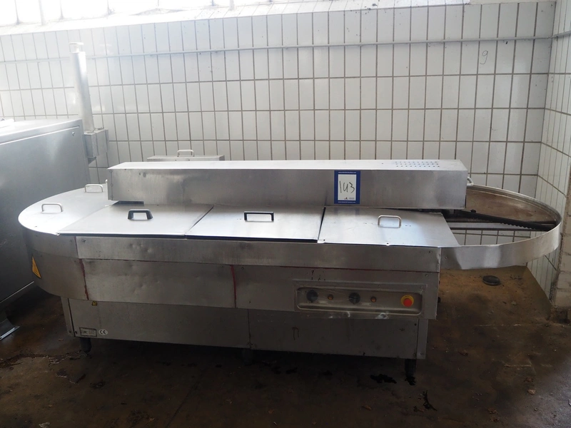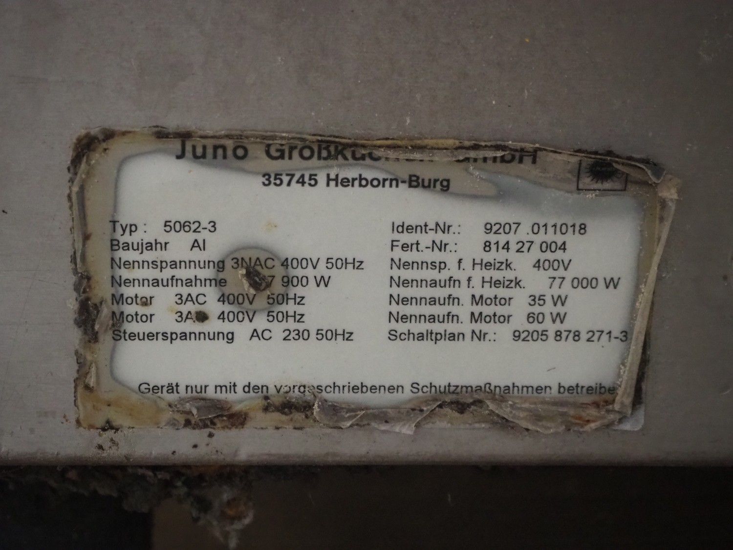 Juno frying machine, type: 5062-3, 400 V, 3 Ph, 50 Hz, dimensions: 3400 mm x 1500 mm x 1200 mm. Missing 1 cover.