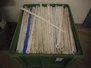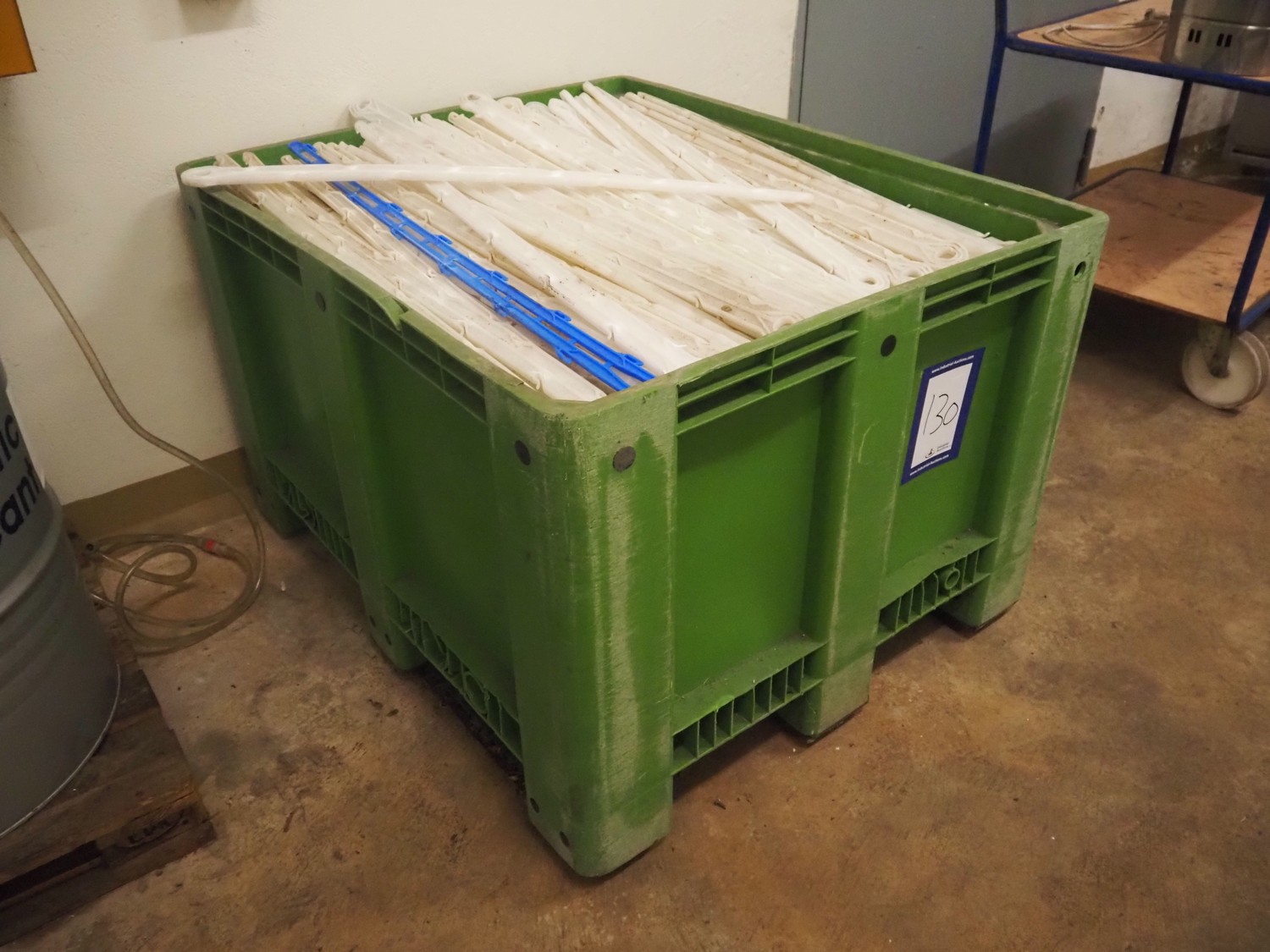 Pallet box with large amount of plastic hooks, hook length: 1040 mm, total dimensions: 1200 mm x 1000 mm x 760 mm.