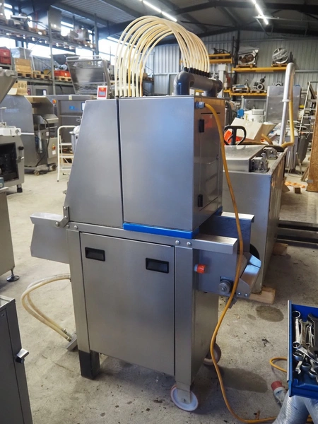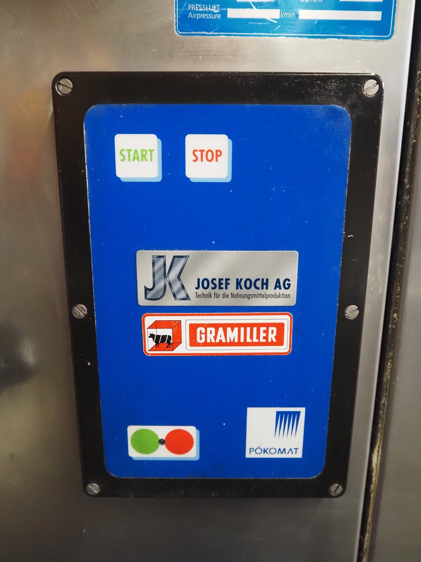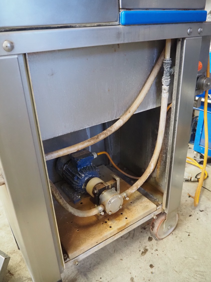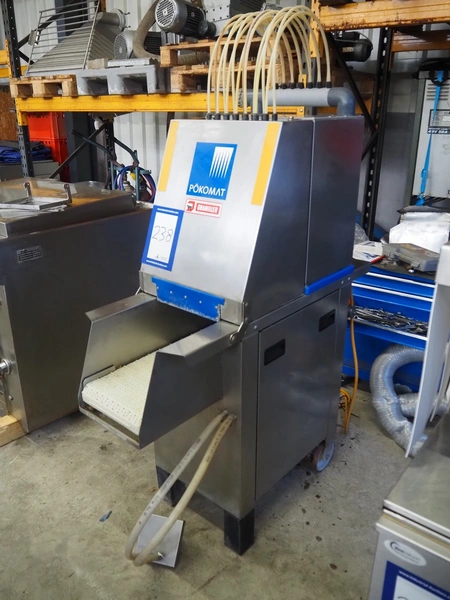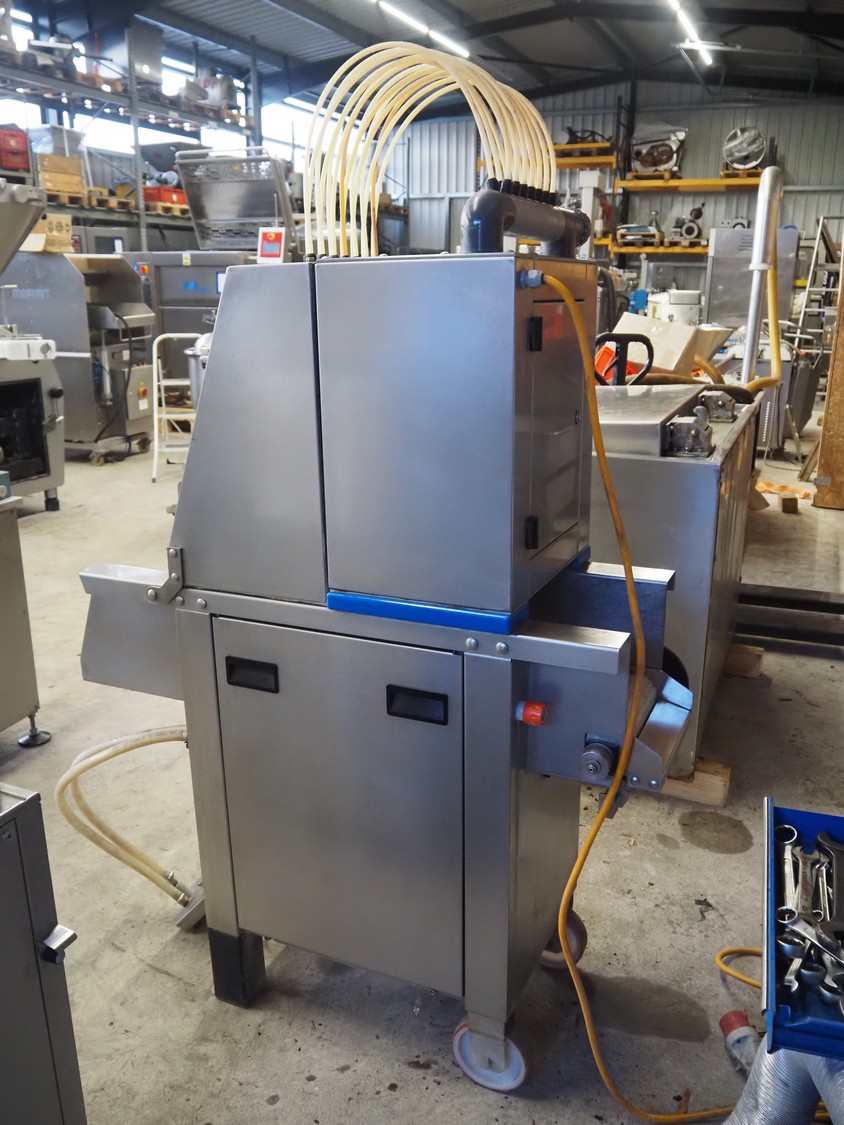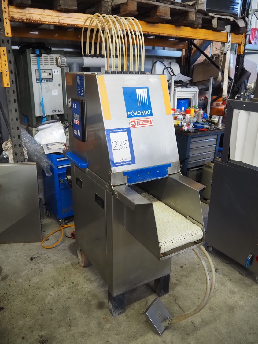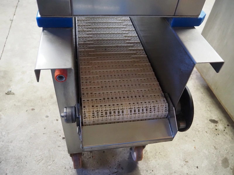 Pökomat mobile injector, 400 V, plastic mesh belt, belt width: 260 mm, clearance: 280 mm x 170 mm, total dimensions: 1220 mm x 480 mm x 1560 mm.