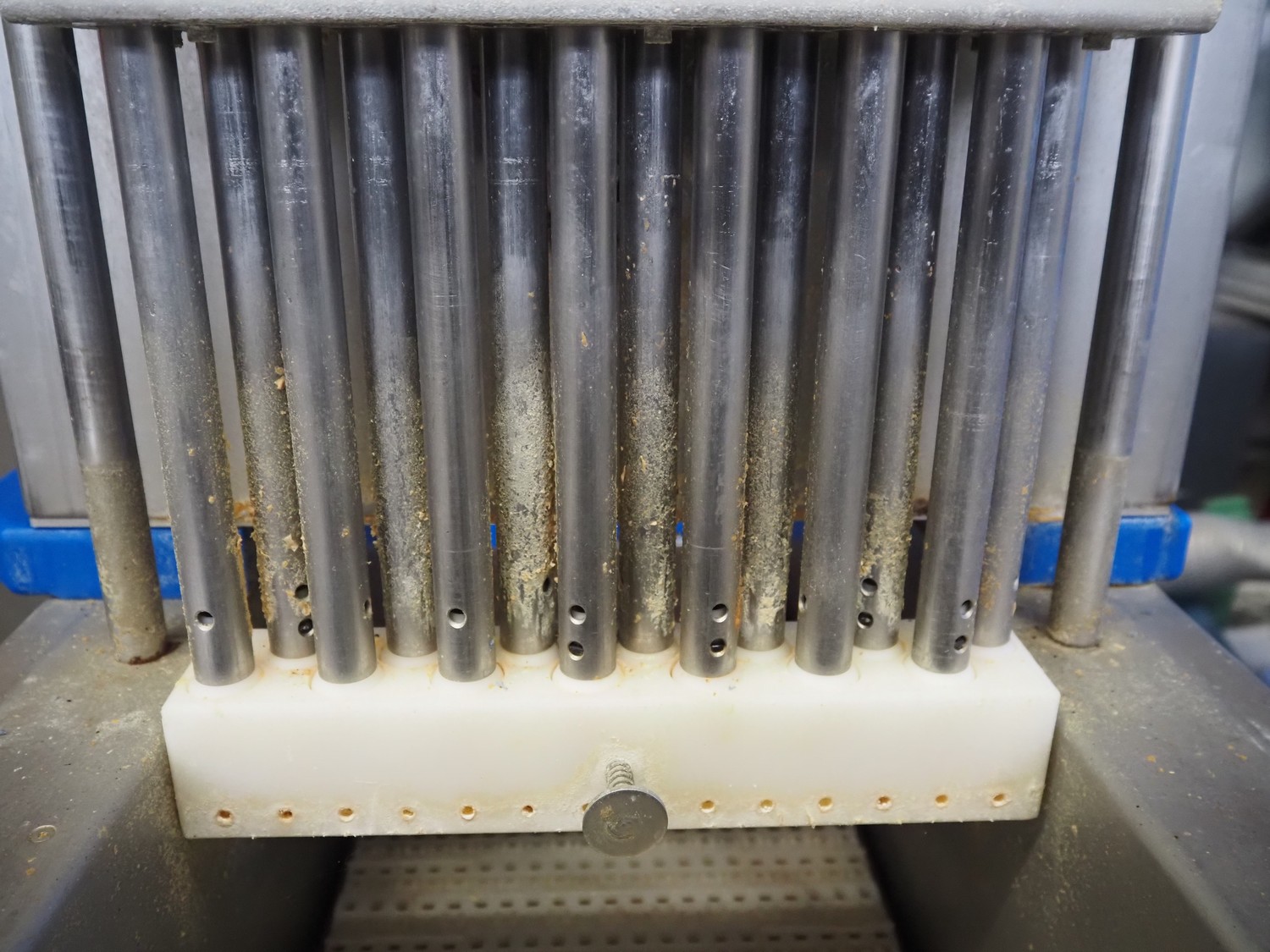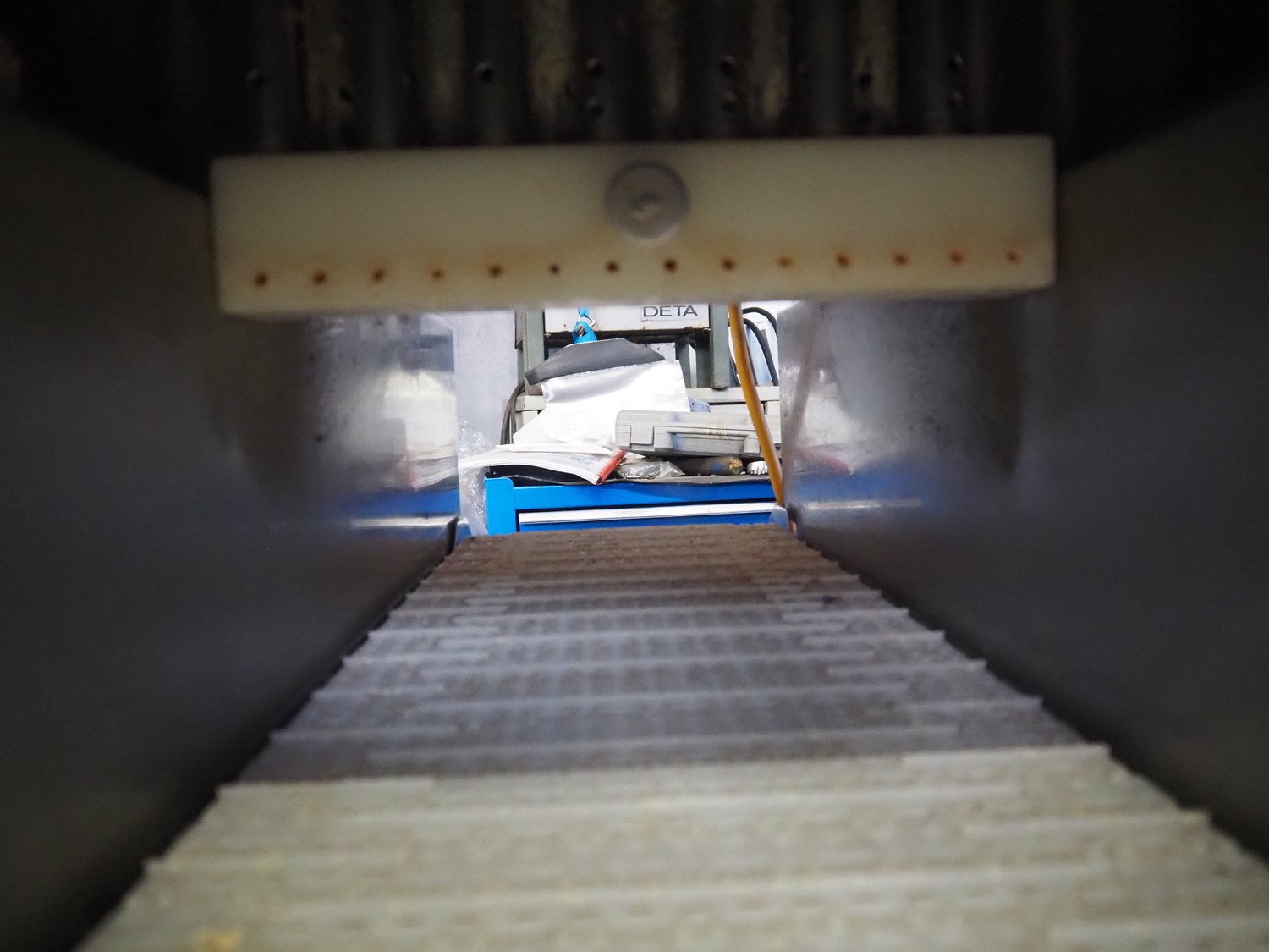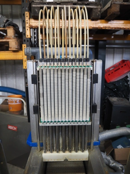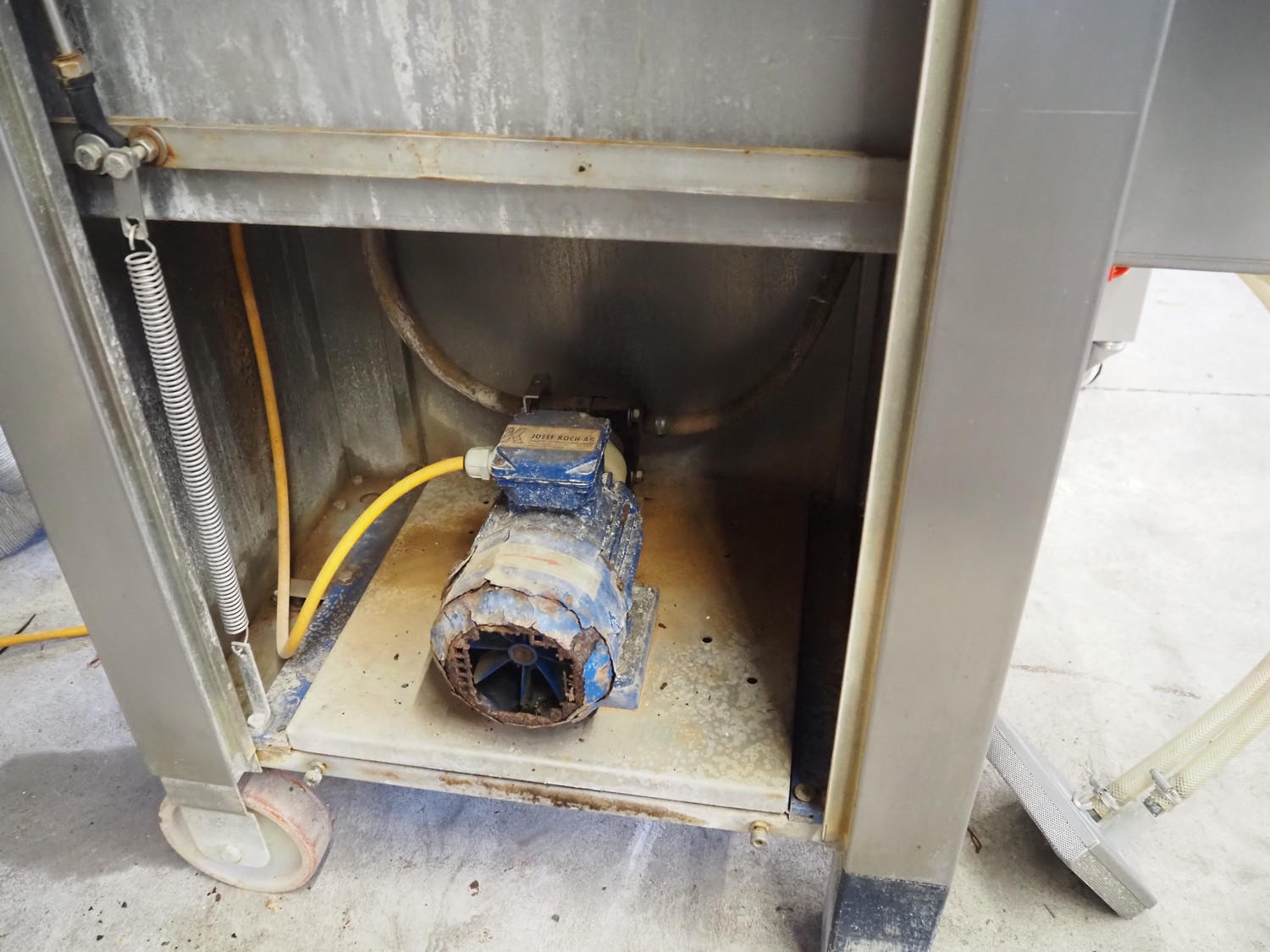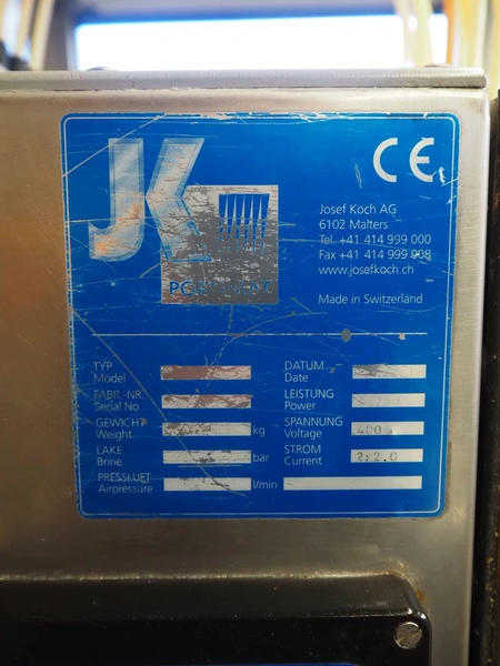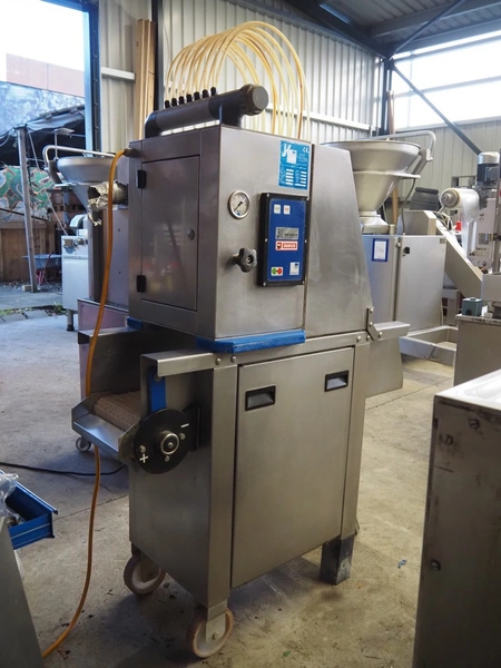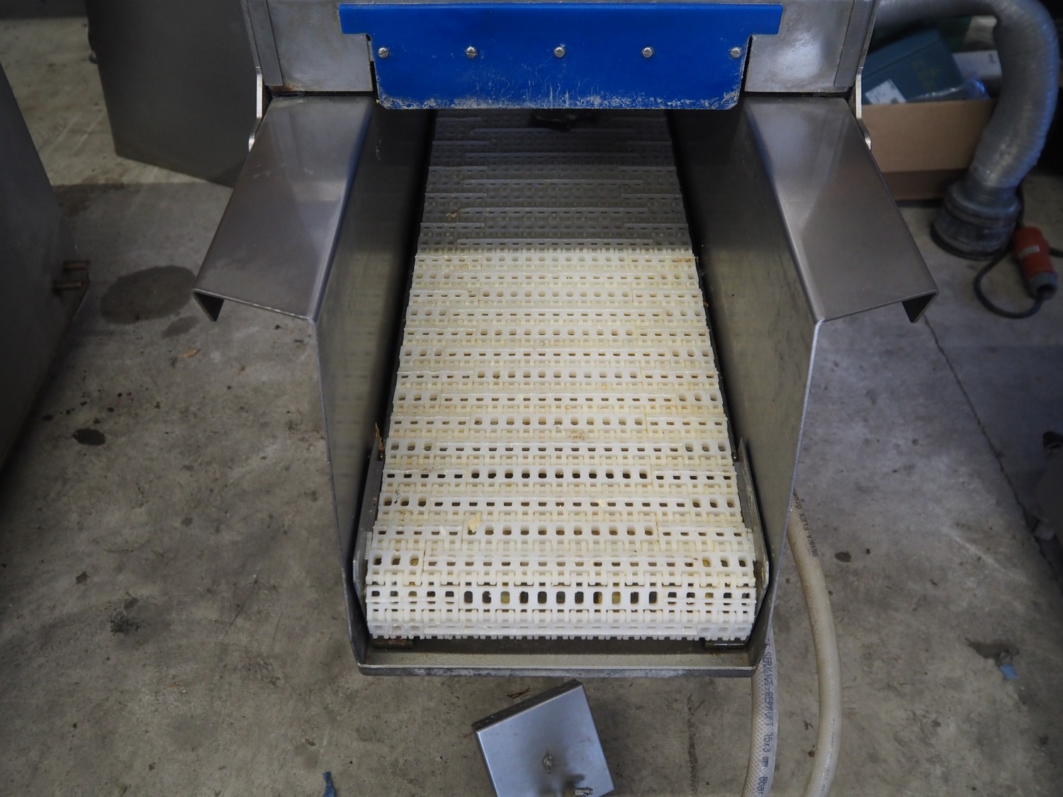 Pökomat mobile injector, 400 V, plastic mesh belt, belt width: 260 mm, clearance: 280 mm x 170 mm, total dimensions: 1220 mm x 480 mm x 1560 mm.