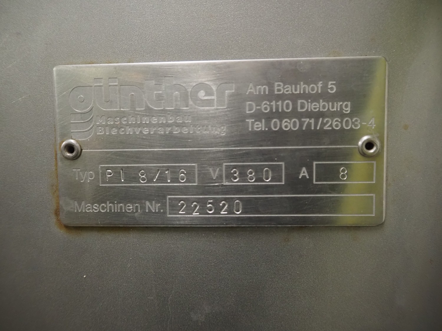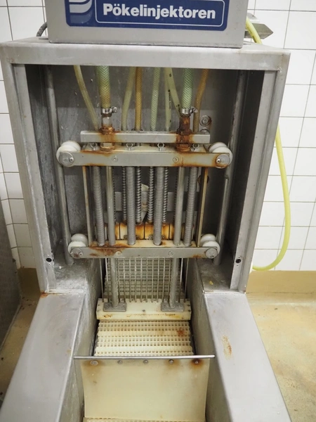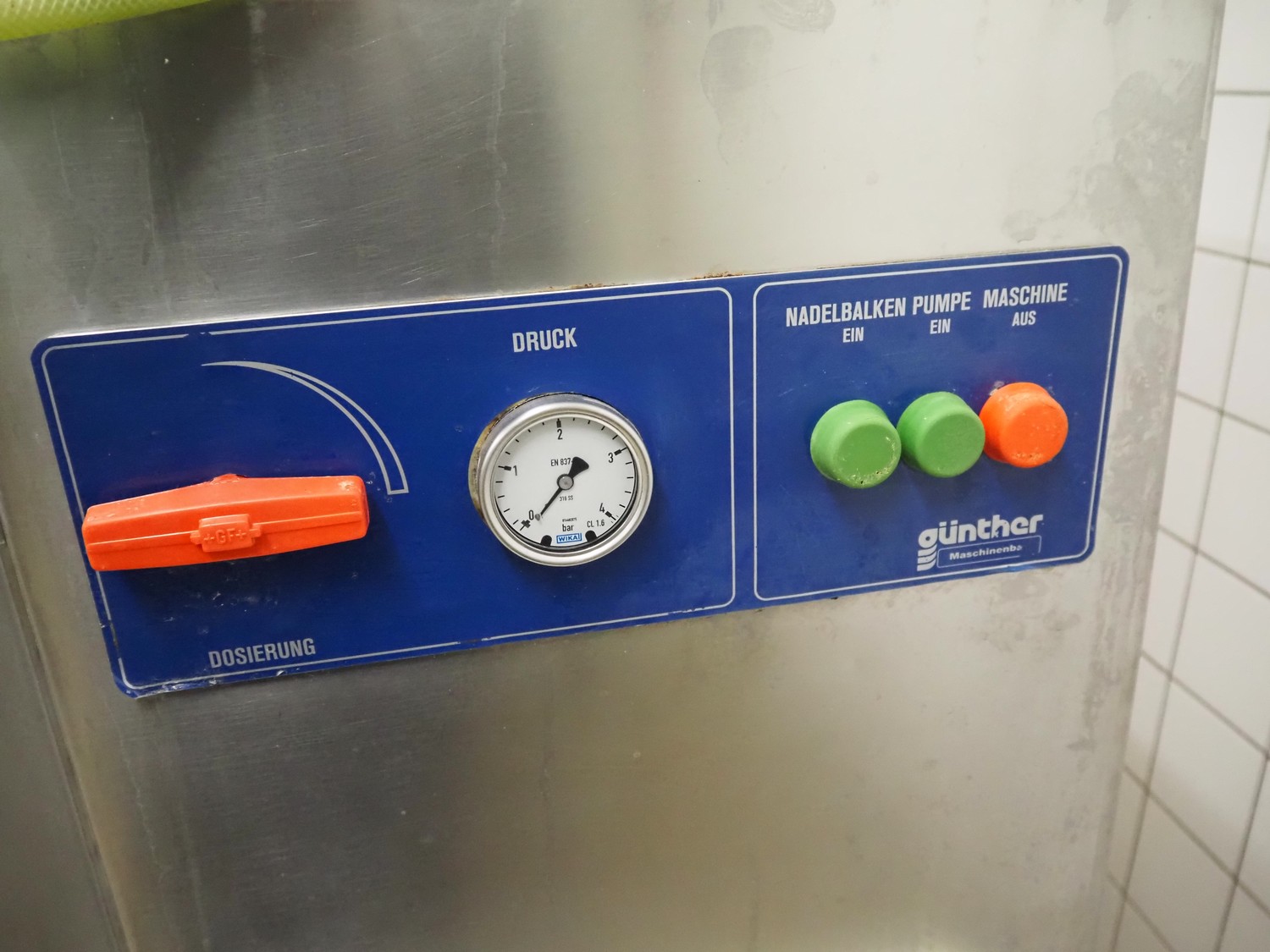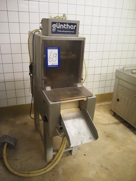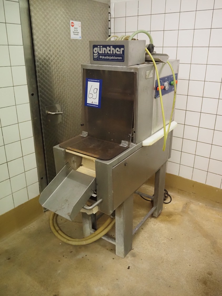 Günther injector, type: PI8/16, machine number: 22520, 380 V, 8 A, plastic mesh belt, belt width: 240 mm, 16 needles, total dimensions: 1350 mm x 450 mm x 1650 mm.