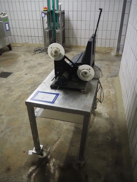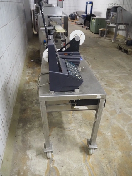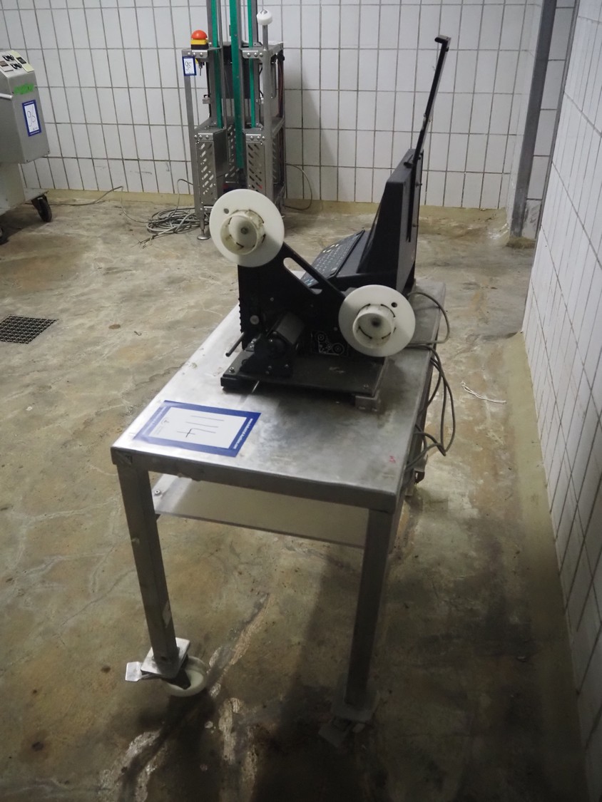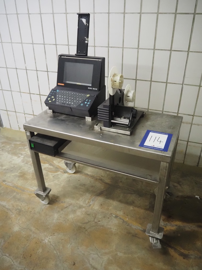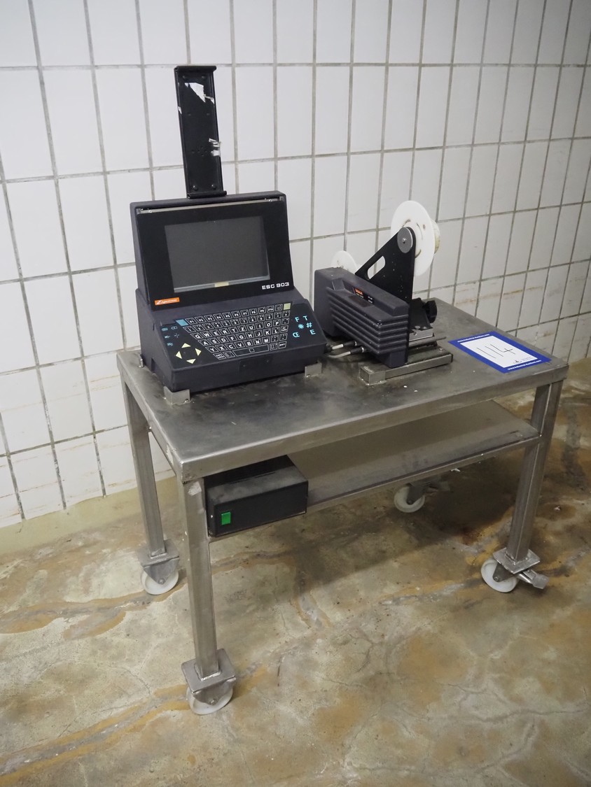 Espera labelling machine with control panel on s/s mobile table, type: ESC 903, number: 70/02/0508, dimensions: 900 mm x 500 mm x 1350 mm.