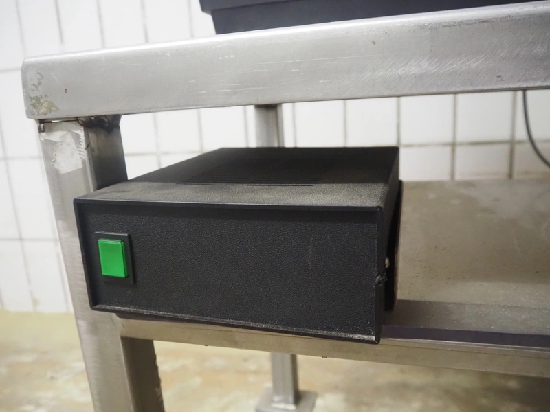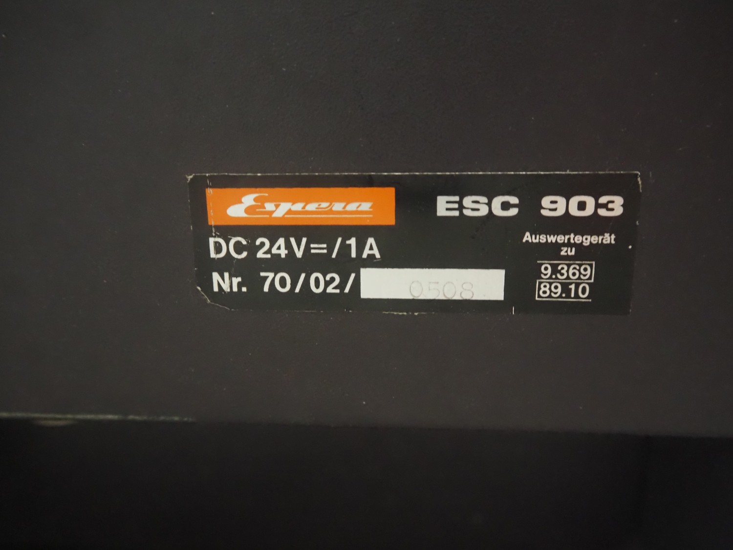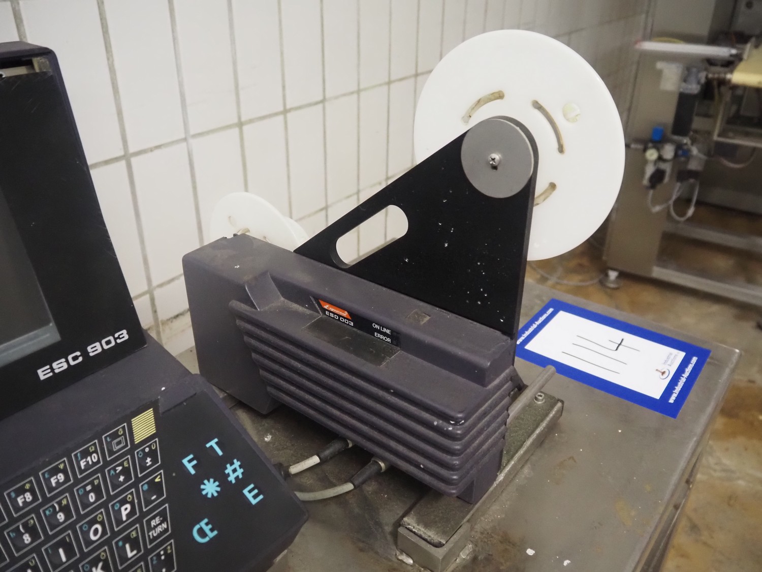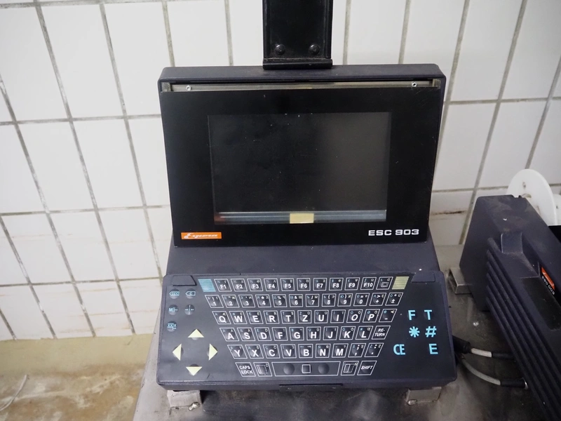 Espera labelling machine with control panel on s/s mobile table, type: ESC 903, number: 70/02/0508, dimensions: 900 mm x 500 mm x 1350 mm.