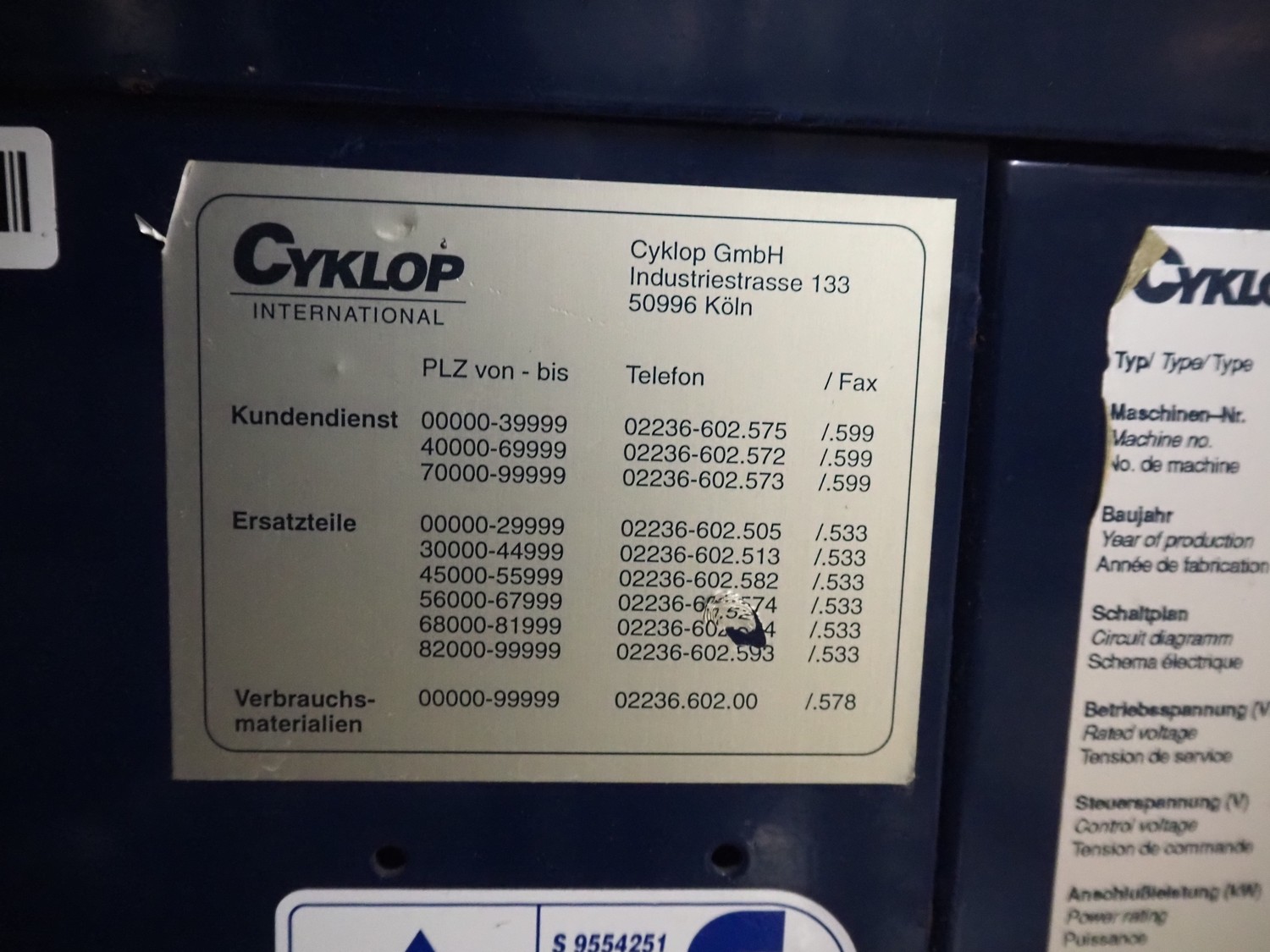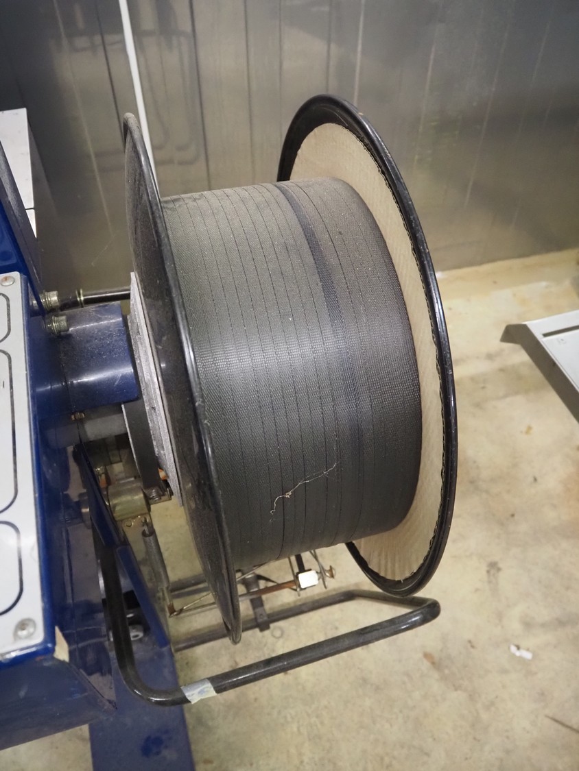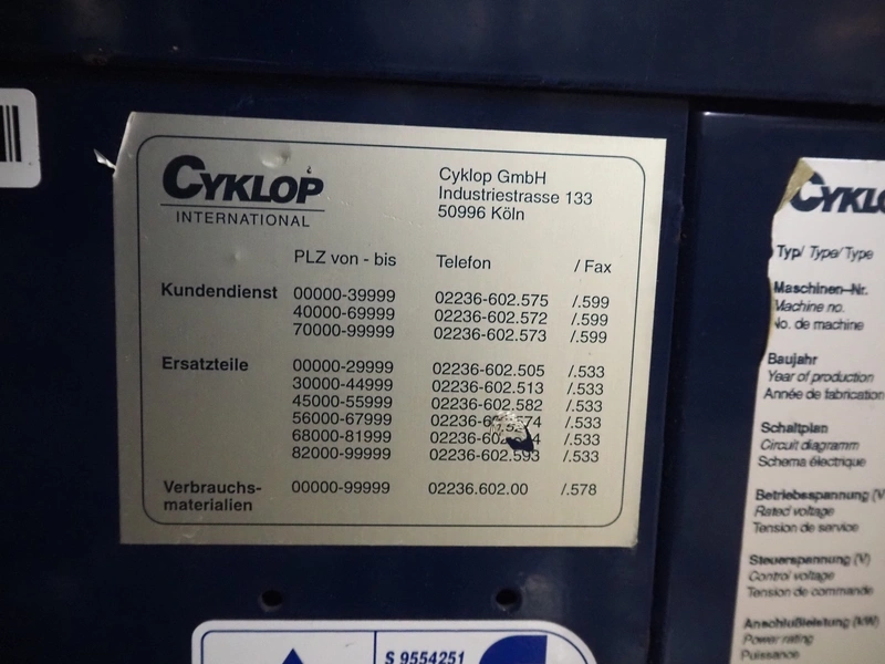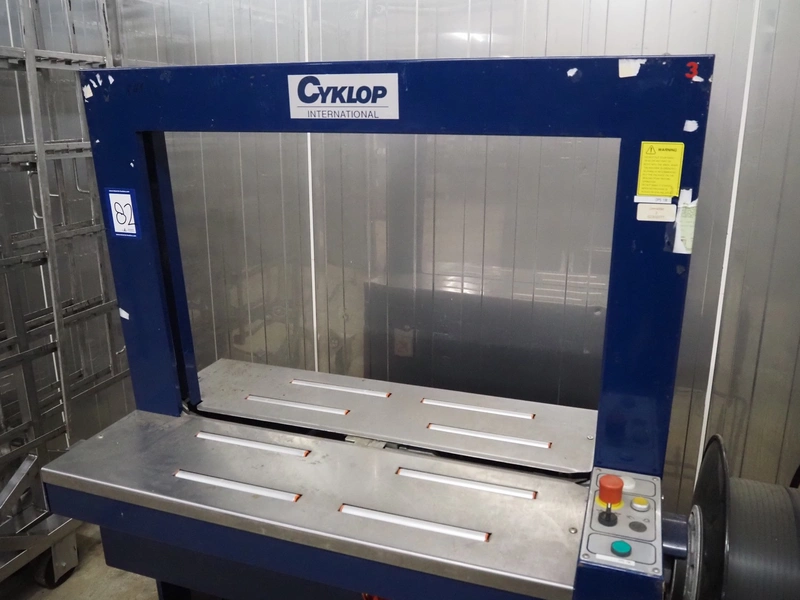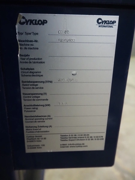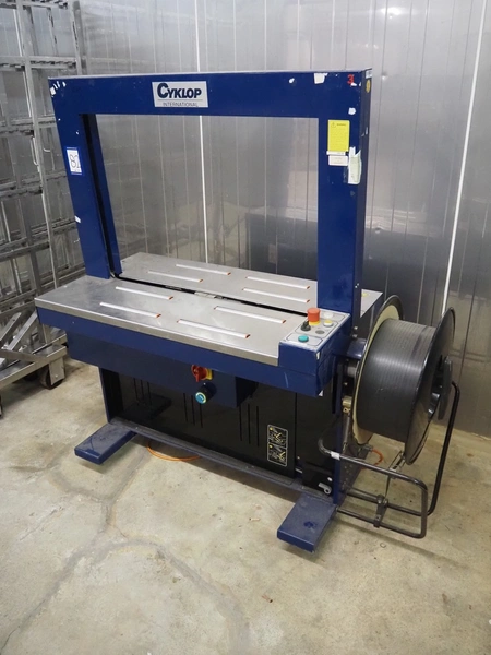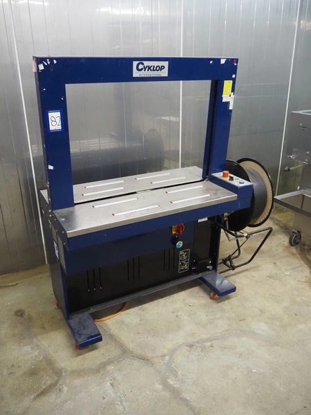 Cyklop mobile strapping machine, type: CD80, machine number: 02302077, 230 V, 50 Hz, 1 KVA, clearance: 870 mm x 605 mm, total dimensions: 1430 mm x 600 mm x 1550 mm.