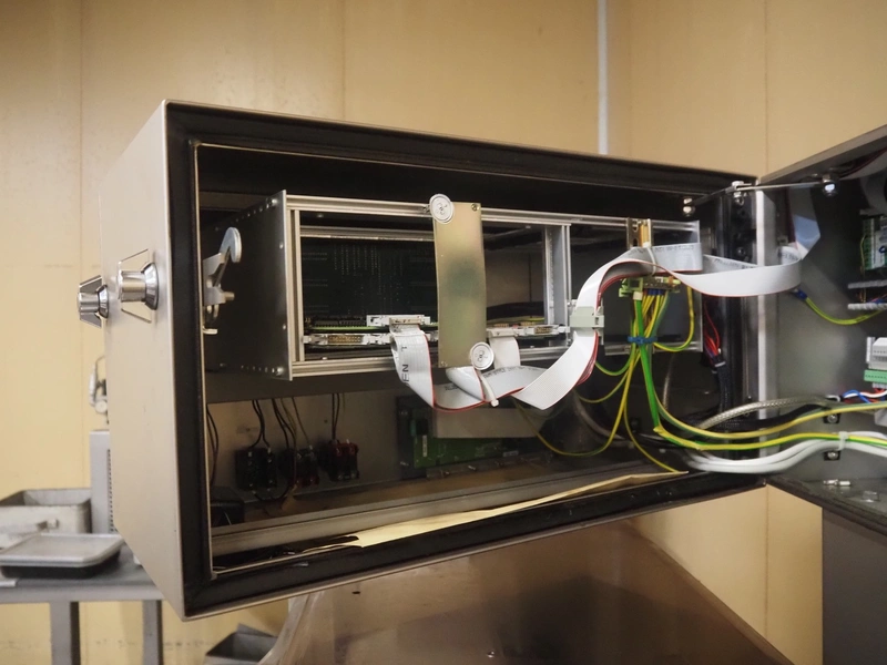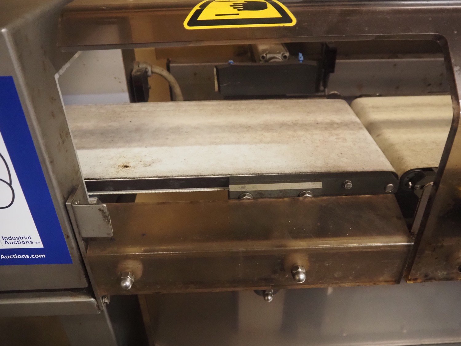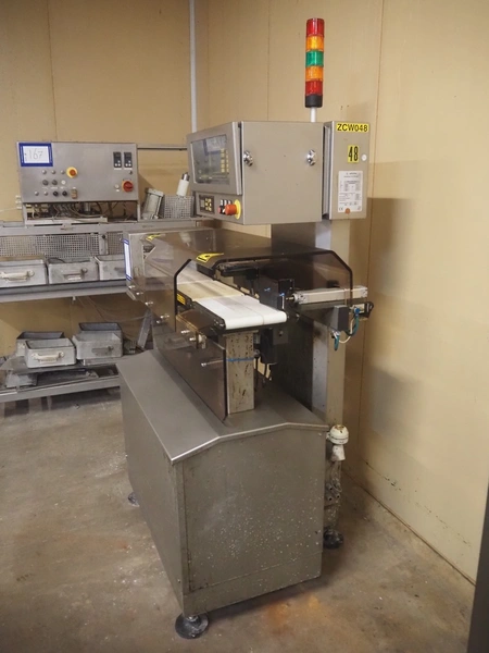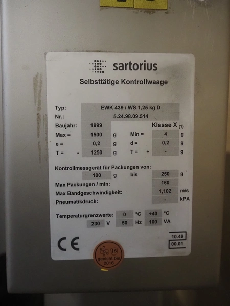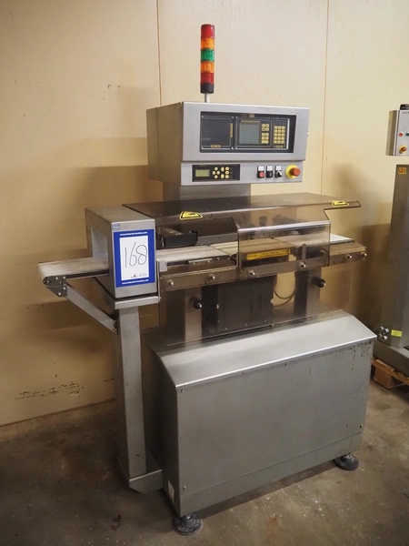 Mesutronic mobile metal detector with Satorius checkweigher and rejector, type metal detector: Matron 2.20 500x100, plastic belt, belt width: 400 mm, clearance: 410 mm x 70 mm, type checkweigher: EWK 439 / WS 1.25 kg D, number: 5.24.98.09.514, year of construction: 1999, maximum capacity: 1500 g, minimum capacity: 4 g, e=d= 0.2 g, T= 1250 g, total dimensions: 1500 mm x 930 mm x 1020 mm.