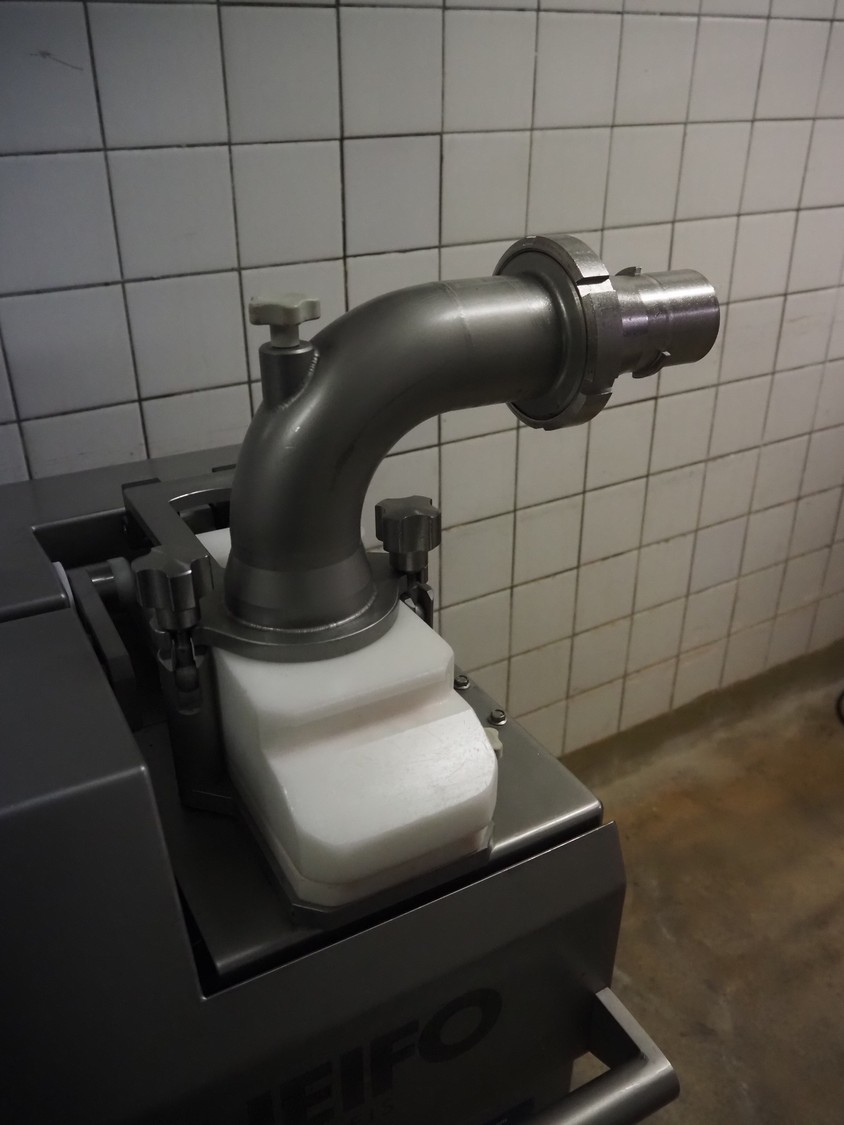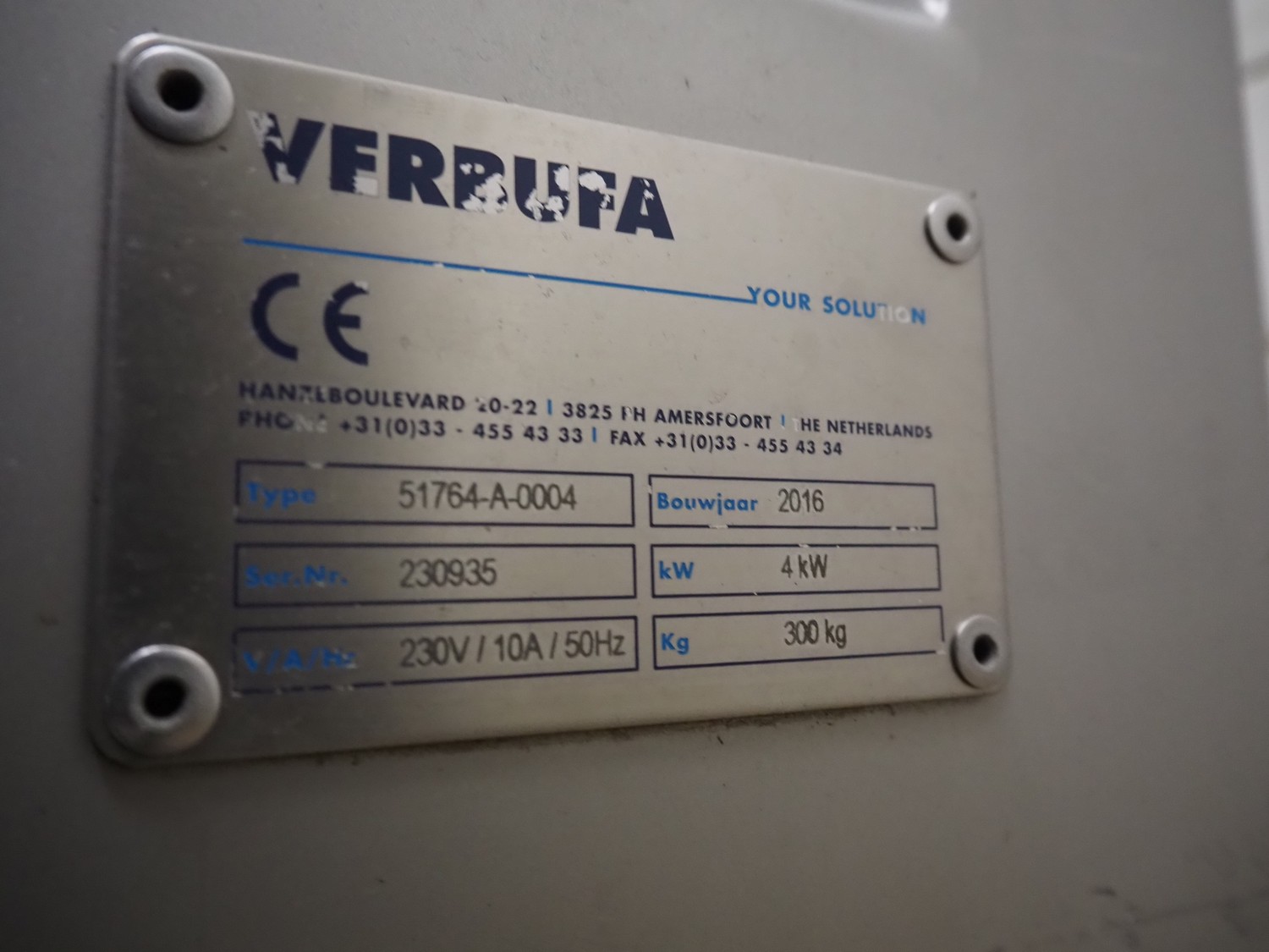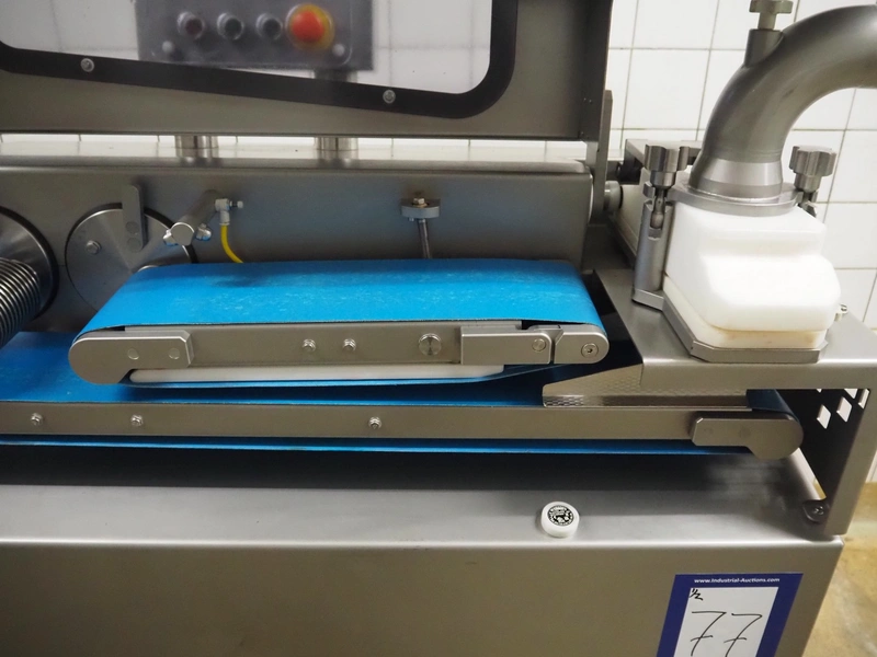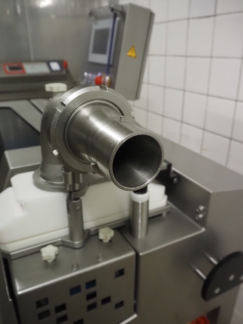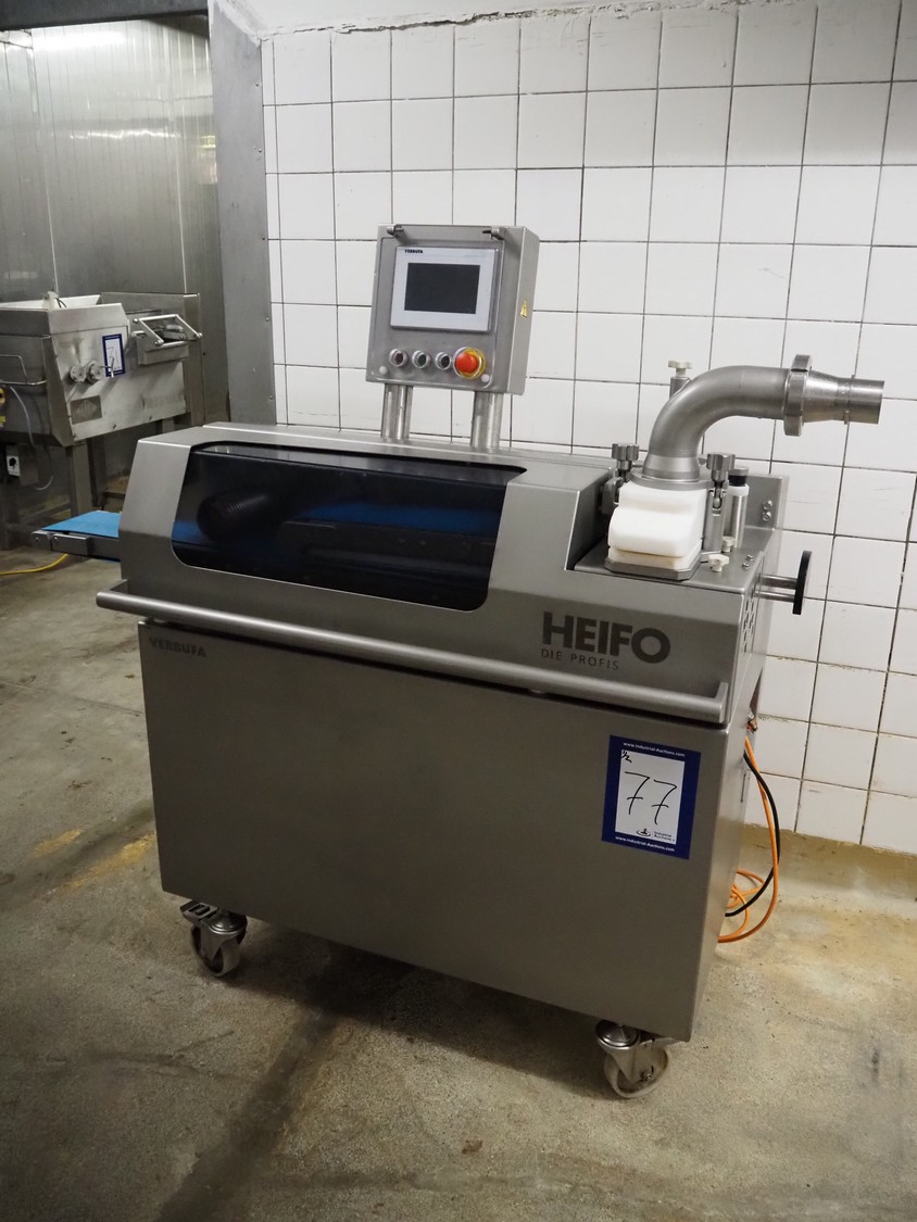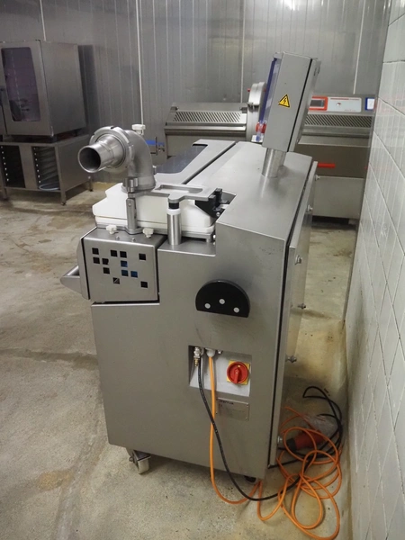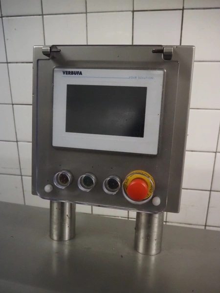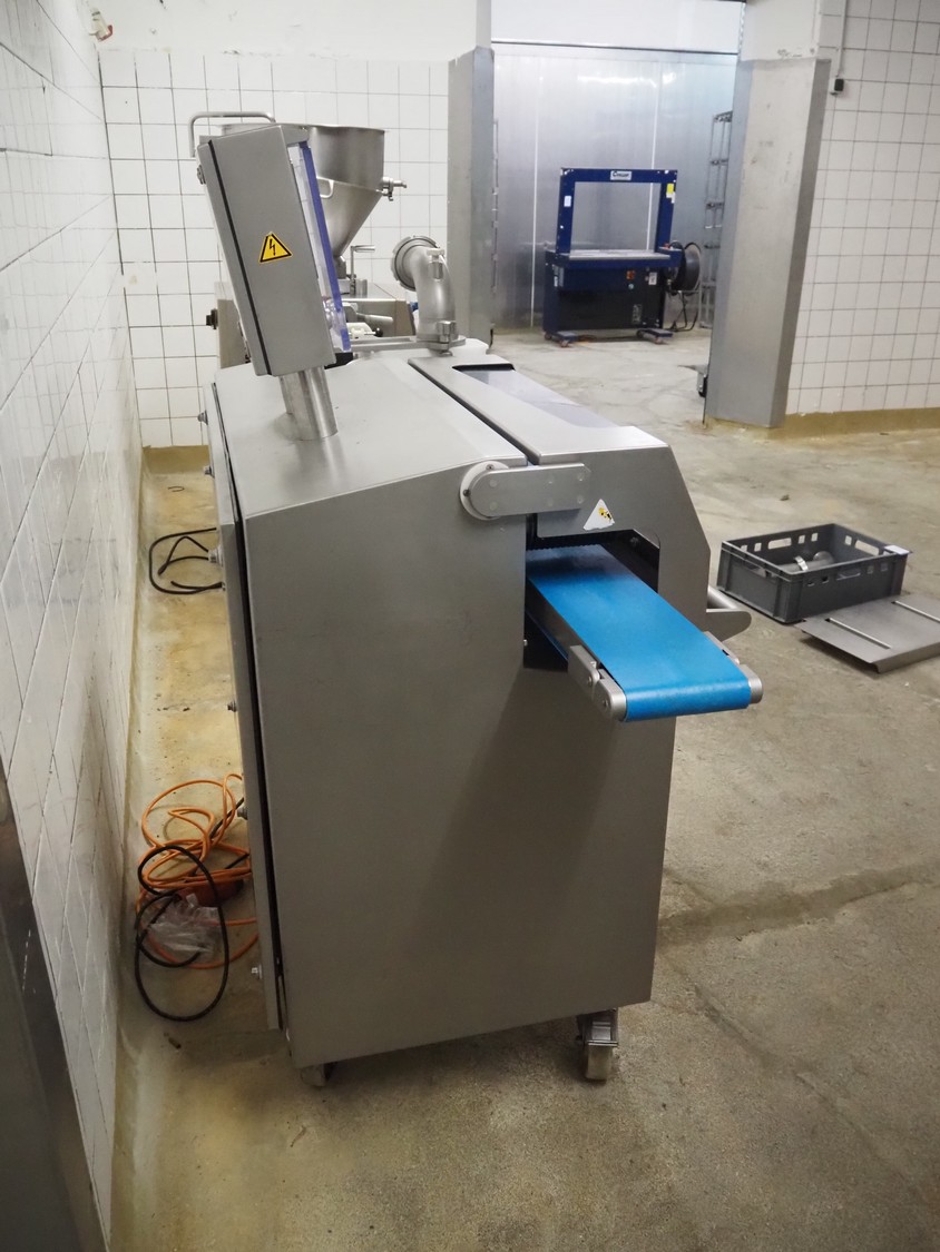 Verbufa mobile portioning machine, type: 51764-A-0004, serial number: 230935, year of construction: 2016, 230 V, 50 Hz, 10 A, 4 kW, weight: 300 kg, plastic belt, belt width: 150 mm, diameter form: 35 mm, total dimensions: 1500 mm x 730 mm x 1550 mm. Including crate with parts.