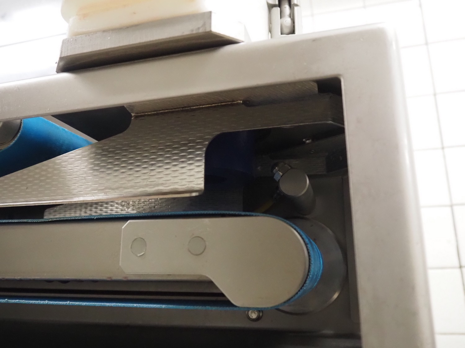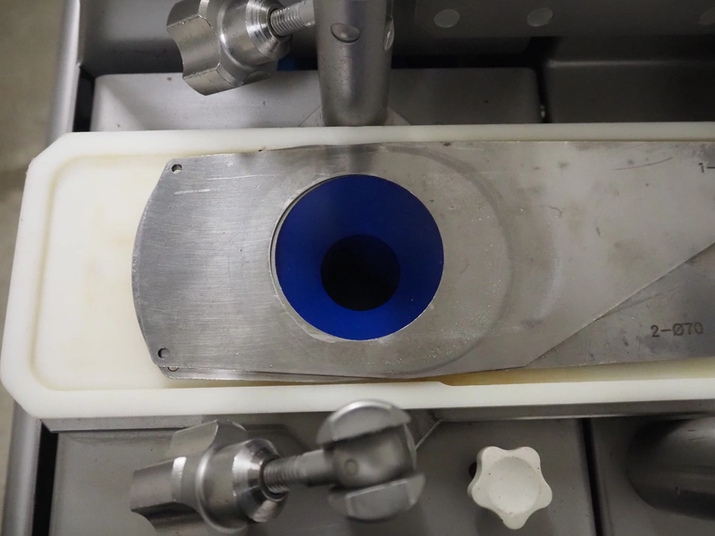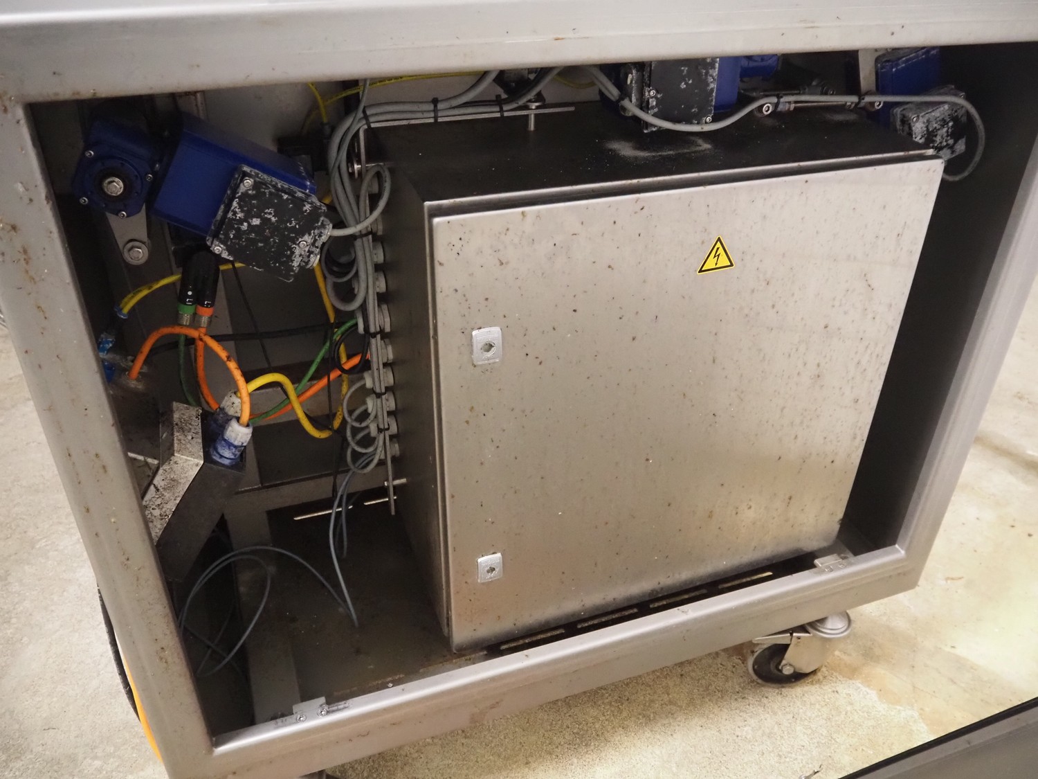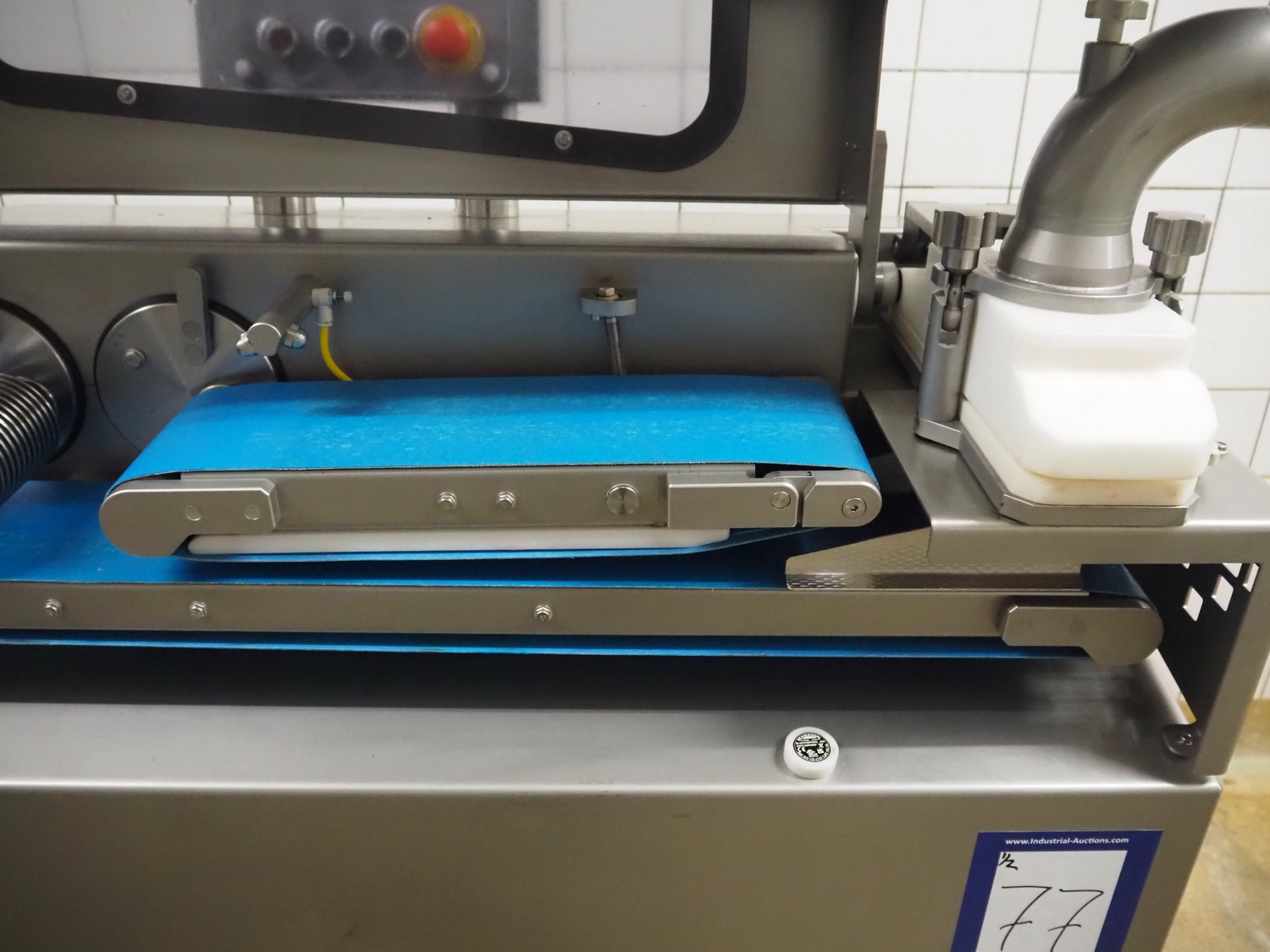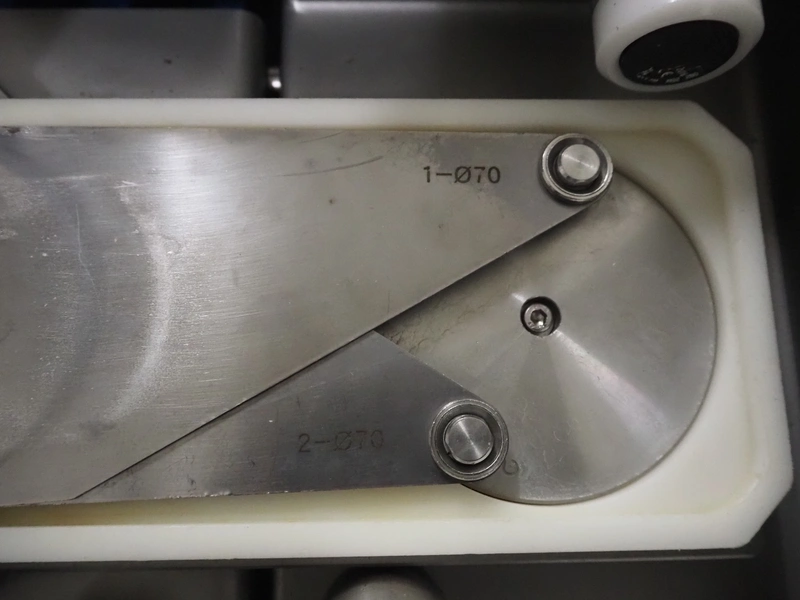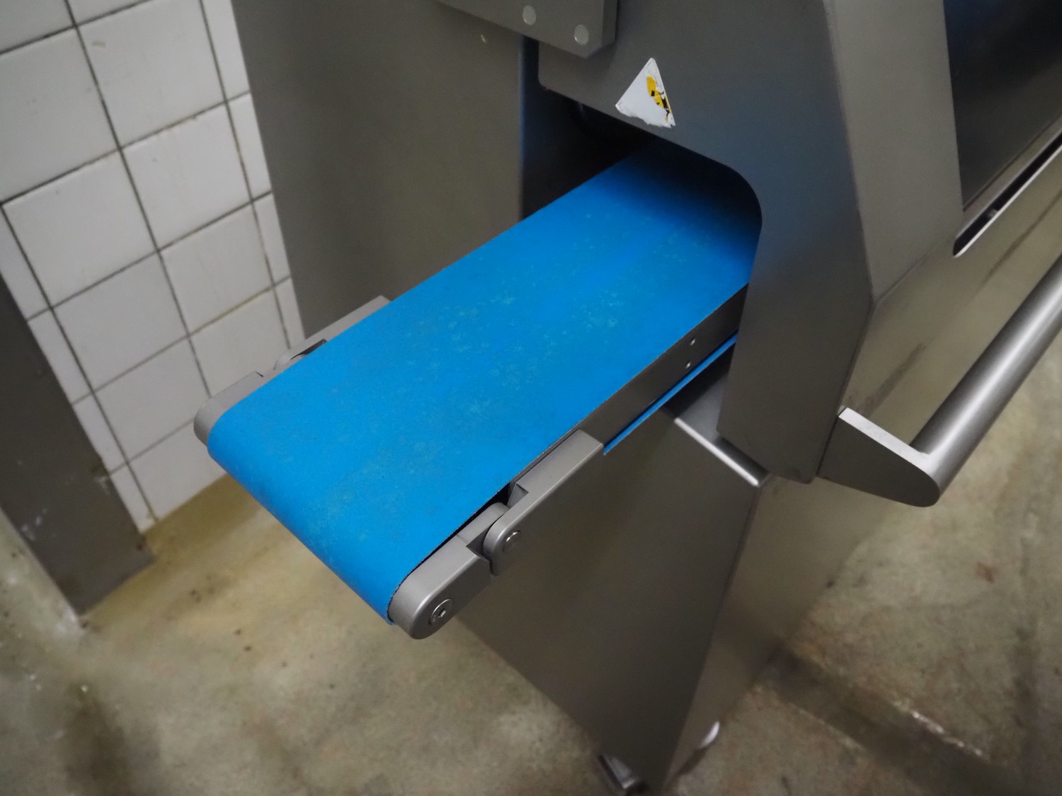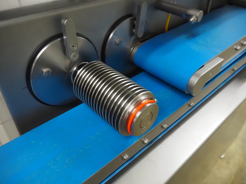 Verbufa mobile portioning machine, type: 51764-A-0004, serial number: 230935, year of construction: 2016, 230 V, 50 Hz, 10 A, 4 kW, weight: 300 kg, plastic belt, belt width: 150 mm, diameter form: 35 mm, total dimensions: 1500 mm x 730 mm x 1550 mm. Including crate with parts.