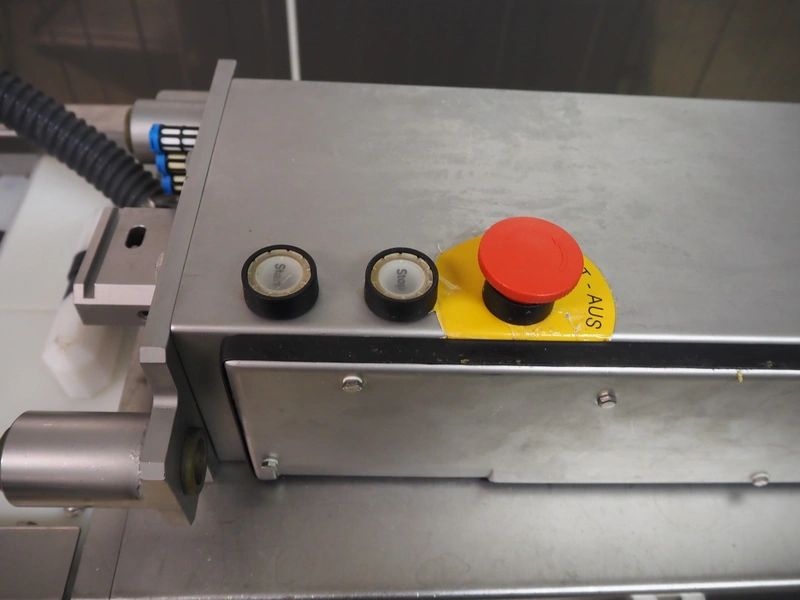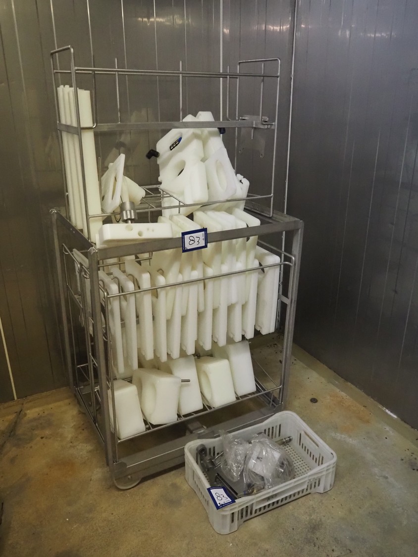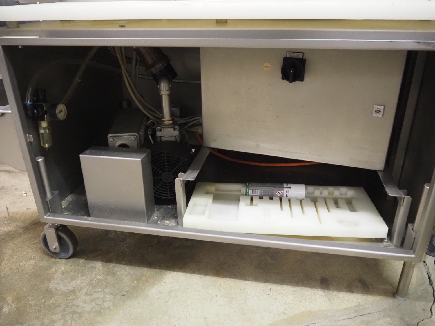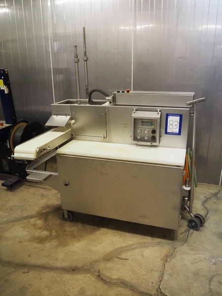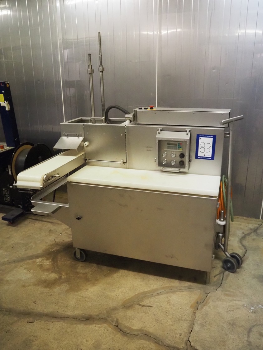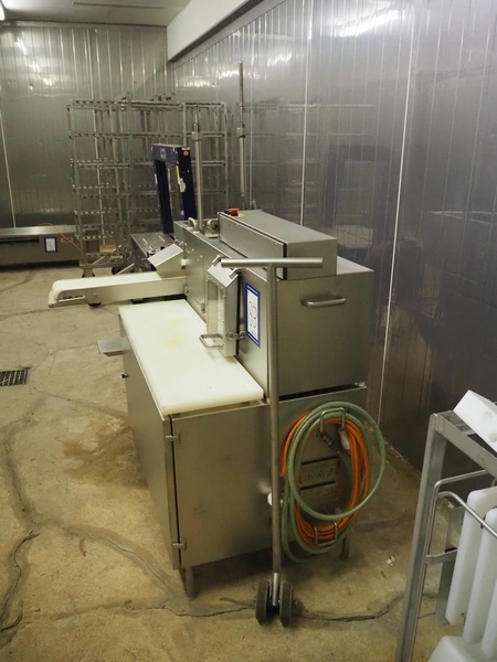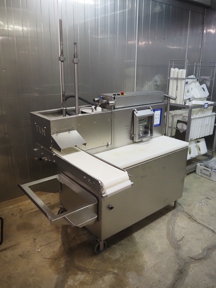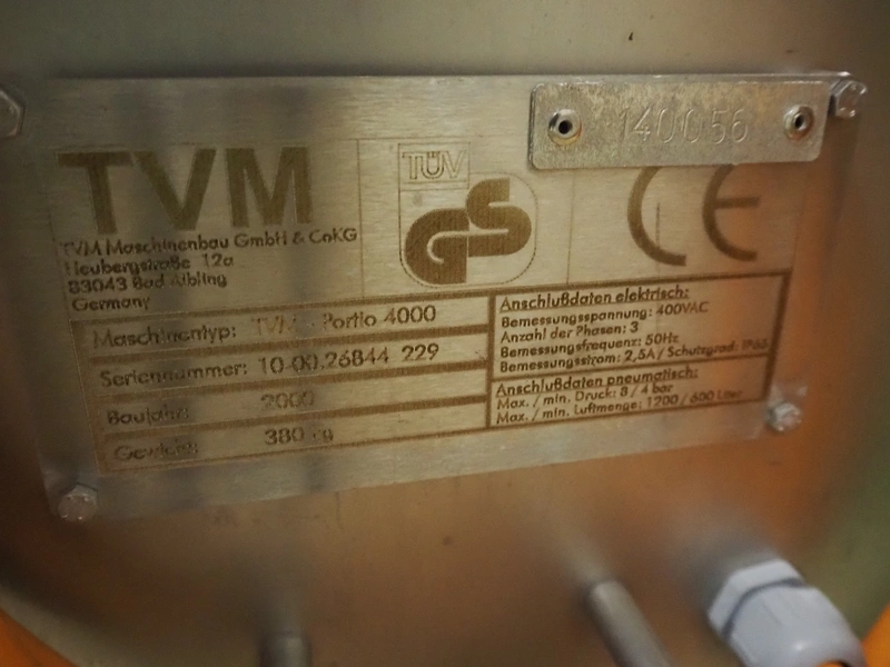 TVM mobile portioning machine, type: TVM Portio 4000, serial number: 10.26844.229, year of construction: 2000, 400 V, 3 Ph, 50 Hz, 2.5 A, 4-8 bar, 380 kg, Busch vacuum pump, type: RC 0025 E 501, number: 00045179, capacity: 25 m³ per hour, plastic outfeed belt, belt width: 200 mm, total dimensions: 1500 mm x 720 mm x 1900 mm. With trolley with parts, dimensions trolley: 820 mm x 620 mm x 1670 mm.