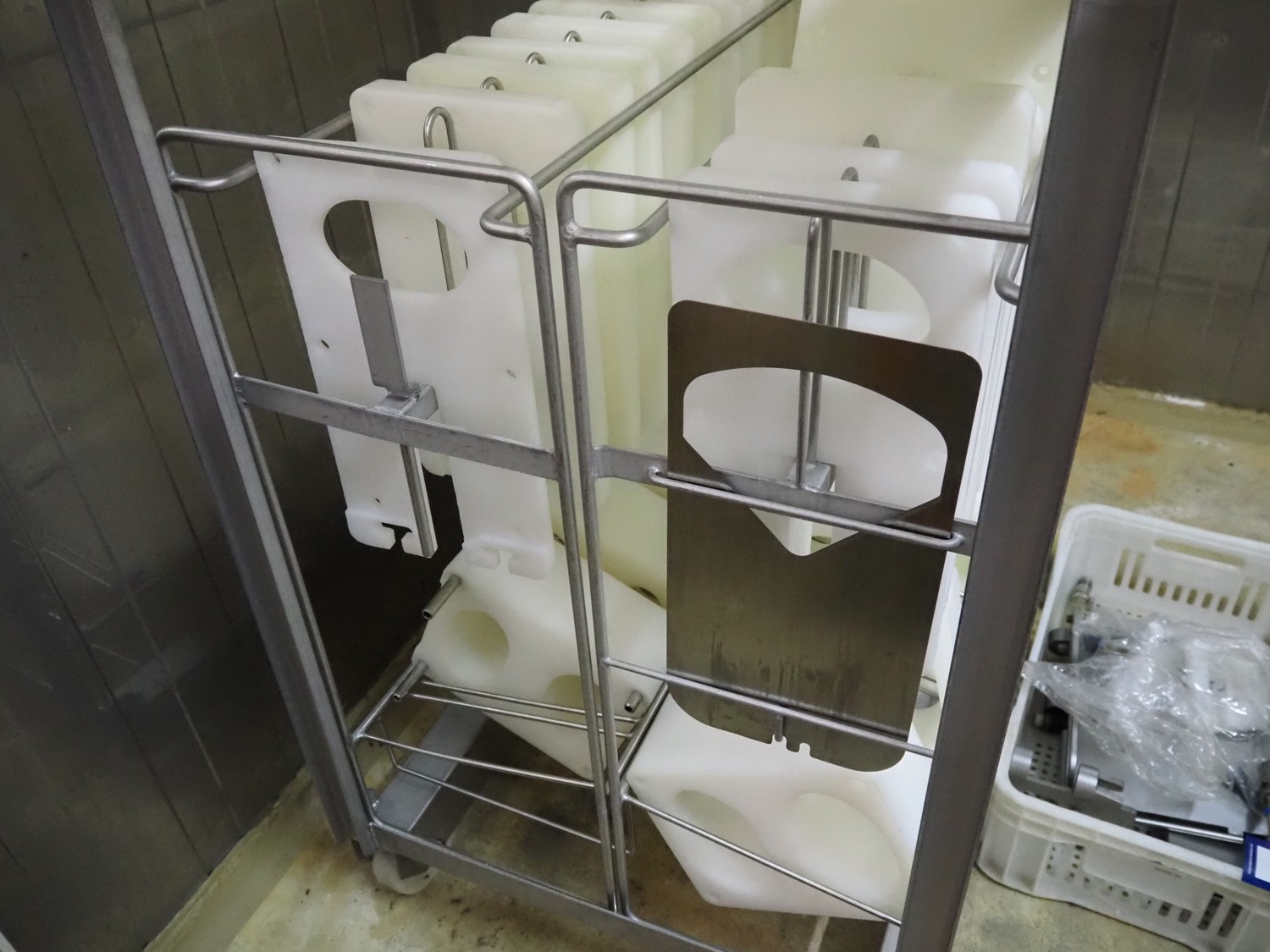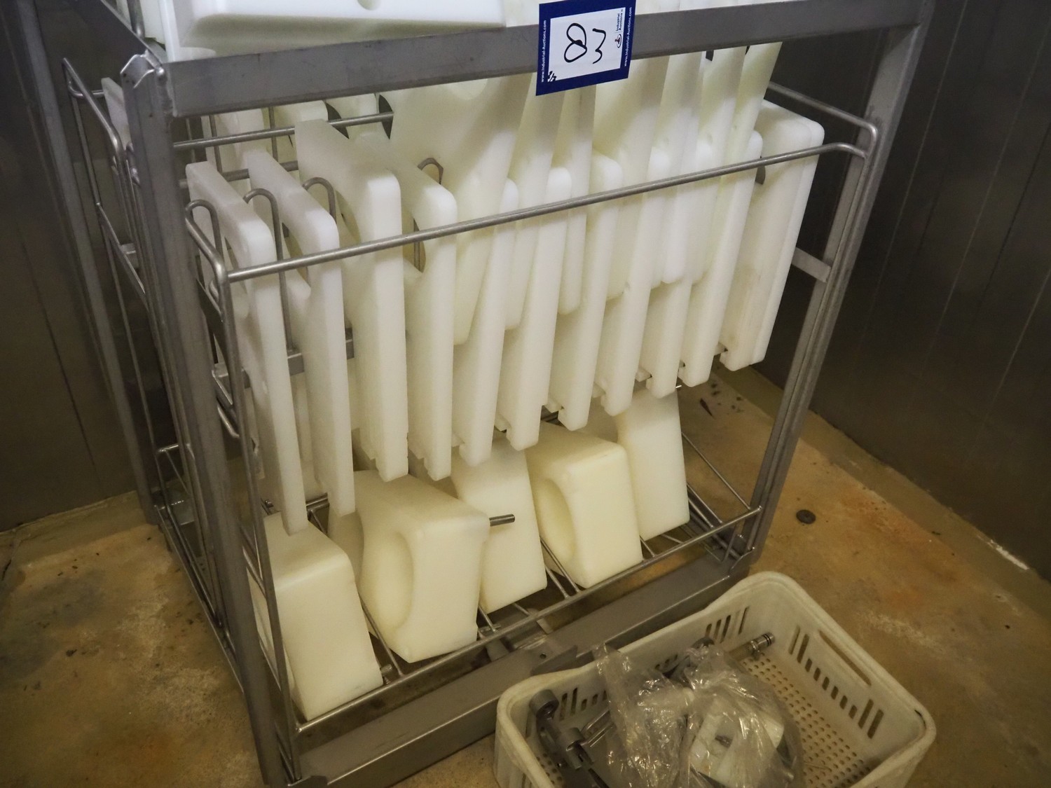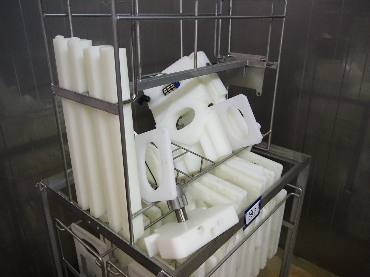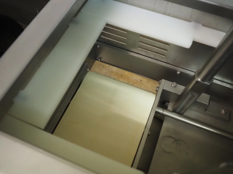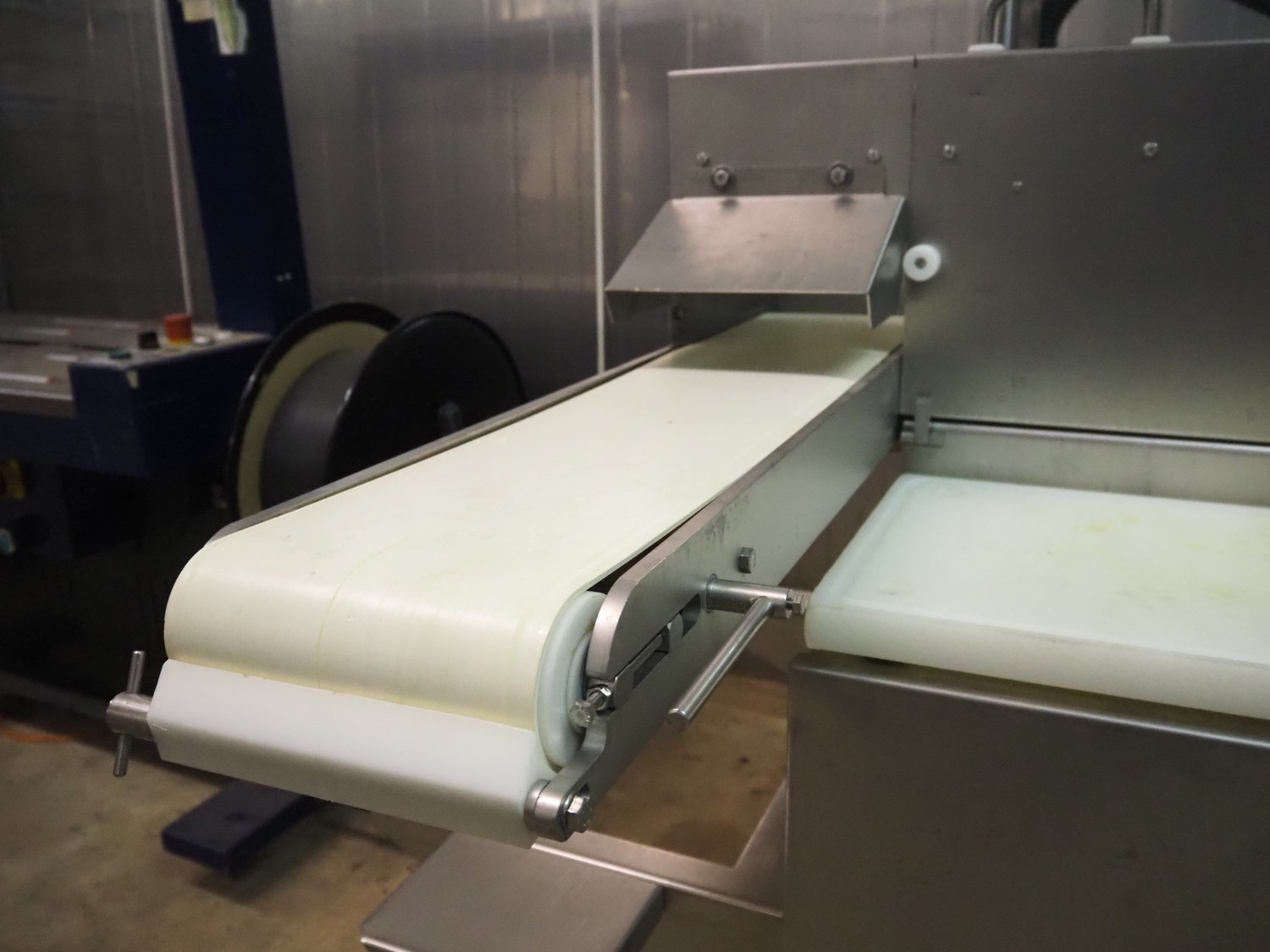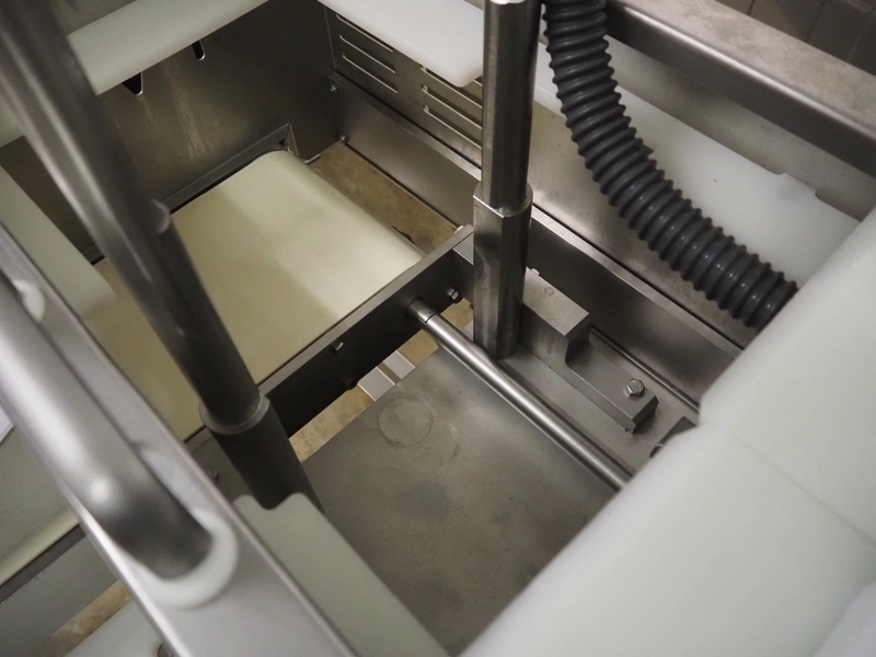 TVM mobile portioning machine, type: TVM Portio 4000, serial number: 10.26844.229, year of construction: 2000, 400 V, 3 Ph, 50 Hz, 2.5 A, 4-8 bar, 380 kg, Busch vacuum pump, type: RC 0025 E 501, number: 00045179, capacity: 25 m³ per hour, plastic outfeed belt, belt width: 200 mm, total dimensions: 1500 mm x 720 mm x 1900 mm. With trolley with parts, dimensions trolley: 820 mm x 620 mm x 1670 mm.