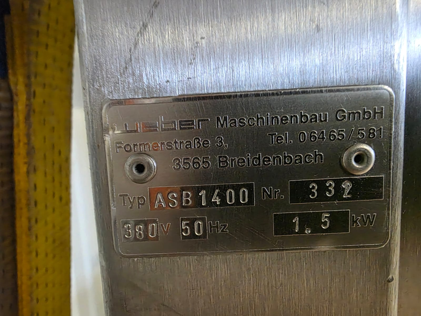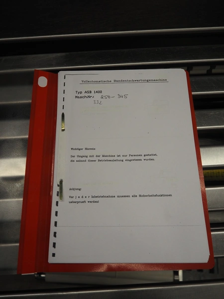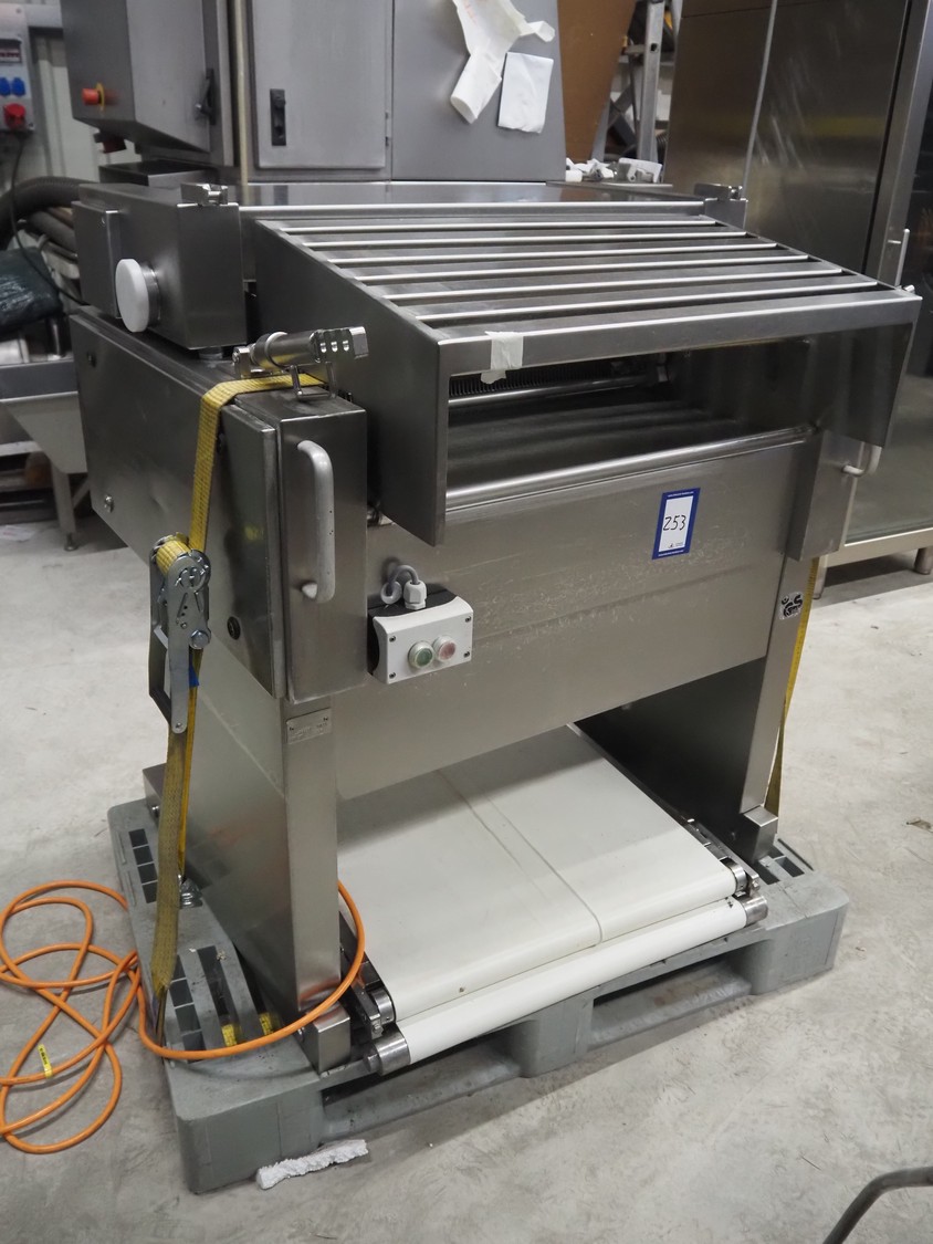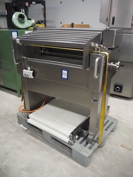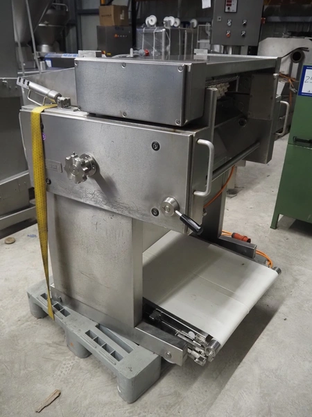 Weber skinning and deriding machine, type: ASB 1400, number: 332, 380 V, 50 Hz, 1.5 kW, working width: 700 mm, total dimensions: 1080 mm x 930 mm x 1150 mm. Including 2 plastic belts, belt width: 620 mm.