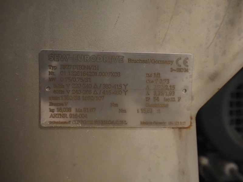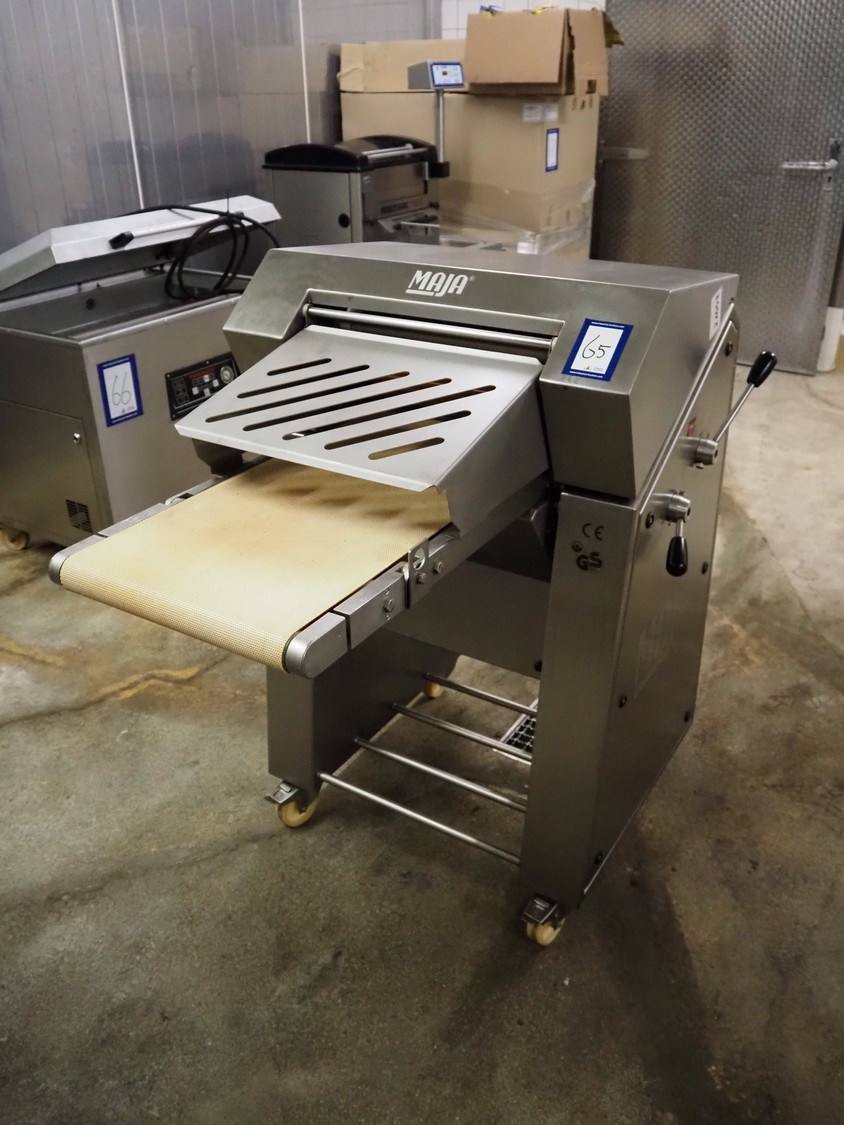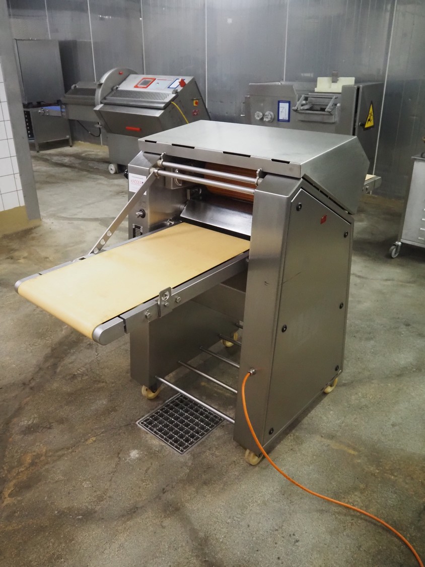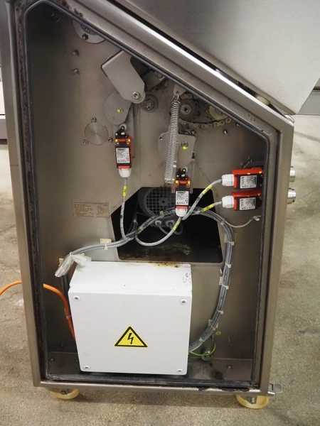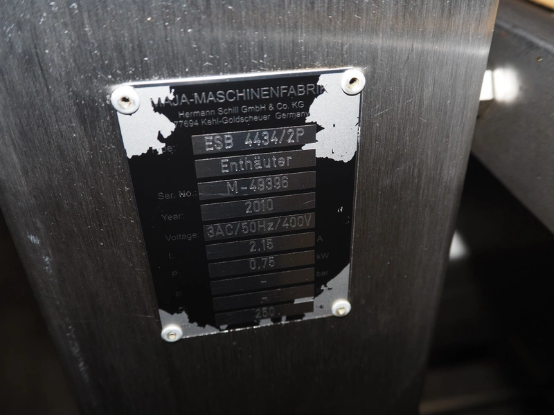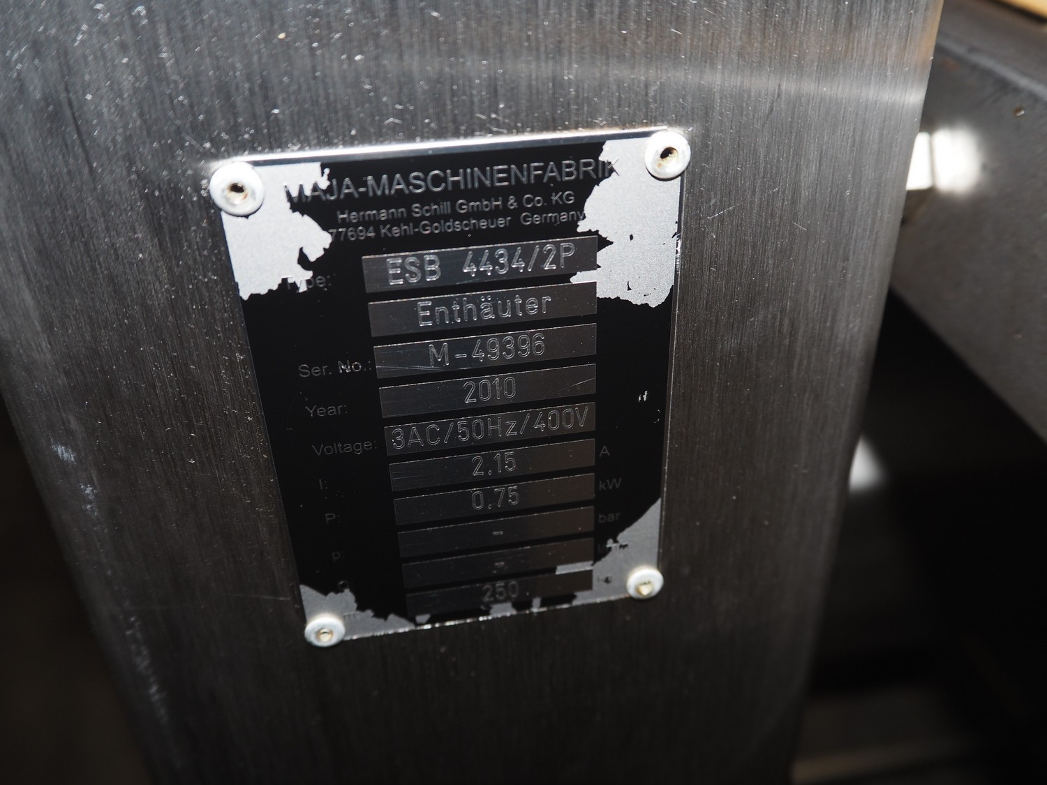 Maja Maschinenfabrik mobile skinning machine, type: ESB 4434/2P, serial number: M-49396, year of construction: 2010, 400 V, 3 Ph, 50 Hz, 2.15 A, 0.75 kW, plastic belt, belt width: 385 mm, working width: 460 mm, total dimensions: 1320 mm x 850 mm x 1250 mm.