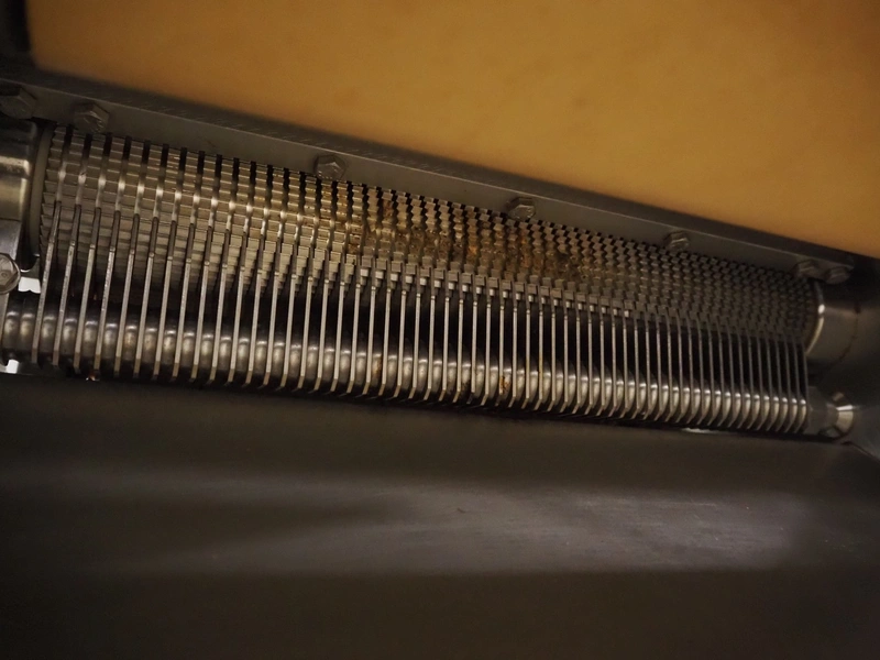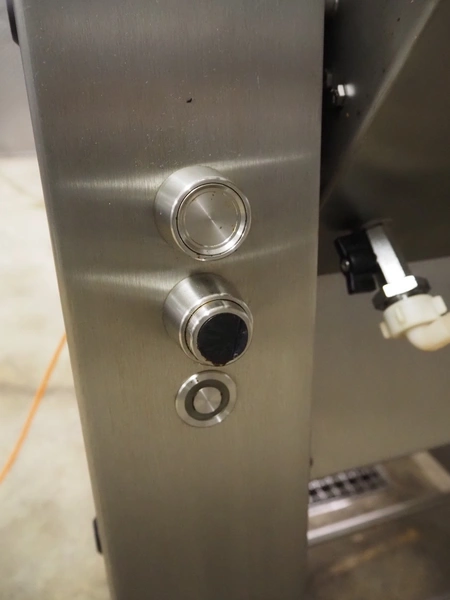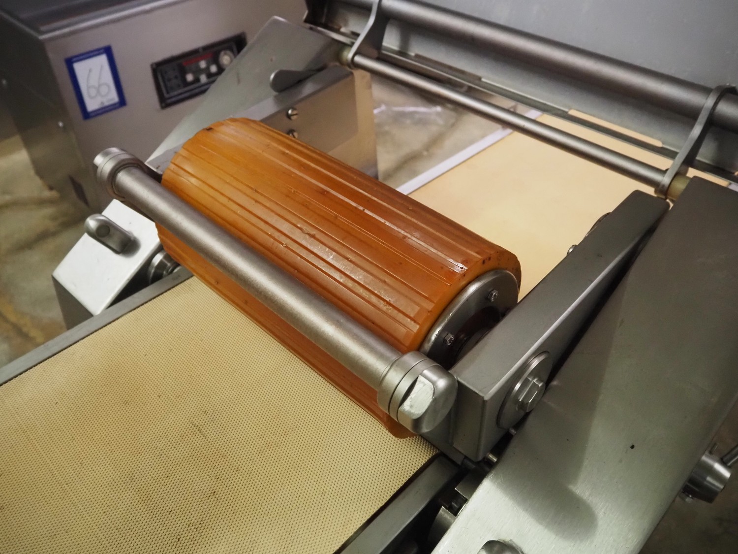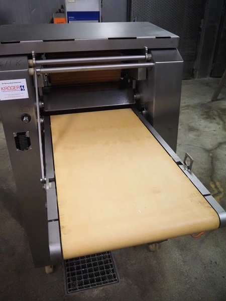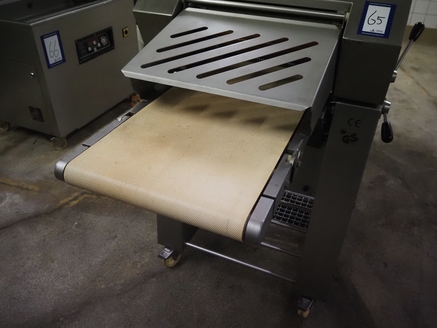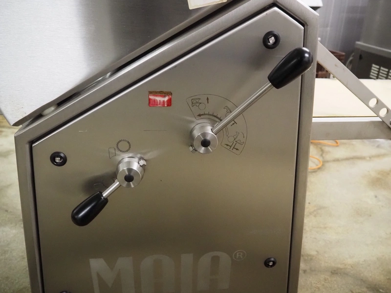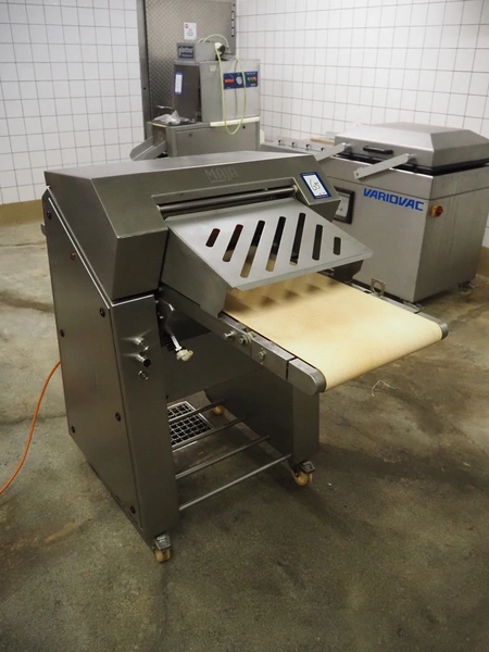 Maja Maschinenfabrik mobile skinning machine, type: ESB 4434/2P, serial number: M-49396, year of construction: 2010, 400 V, 3 Ph, 50 Hz, 2.15 A, 0.75 kW, plastic belt, belt width: 385 mm, working width: 460 mm, total dimensions: 1320 mm x 850 mm x 1250 mm.