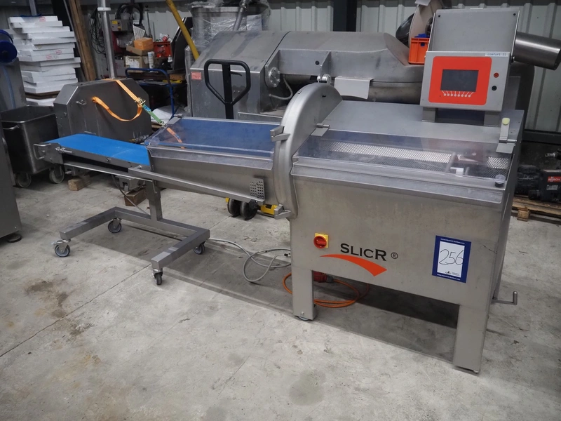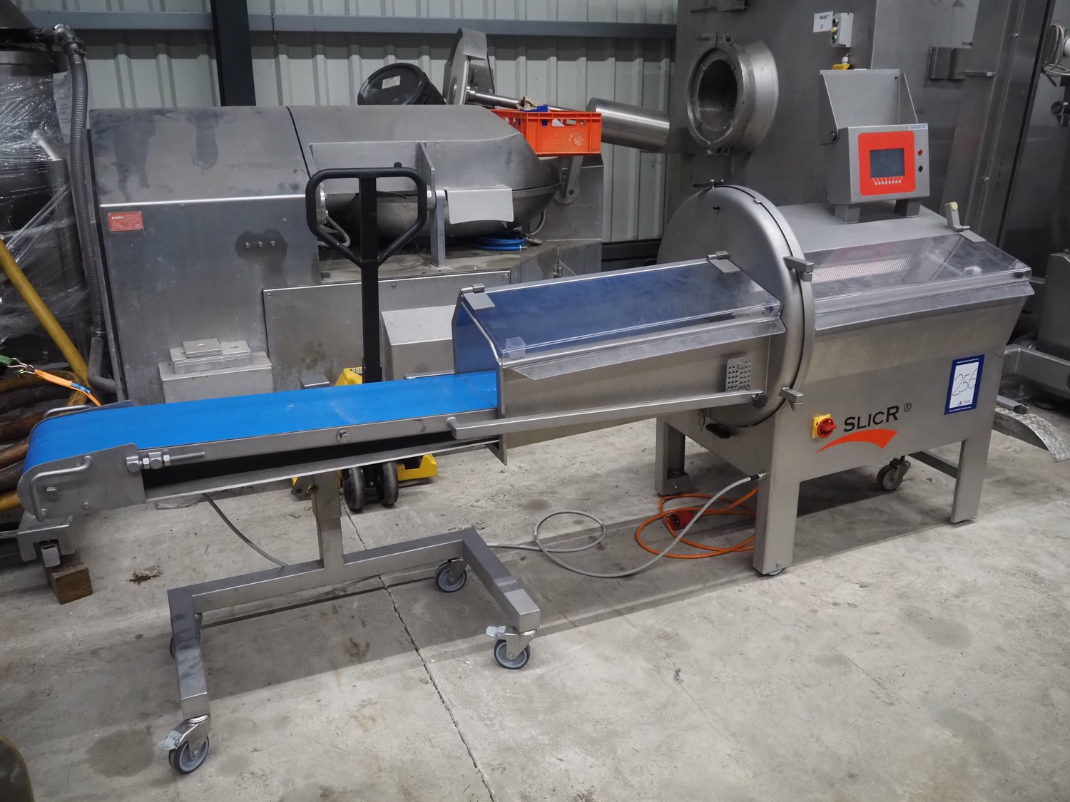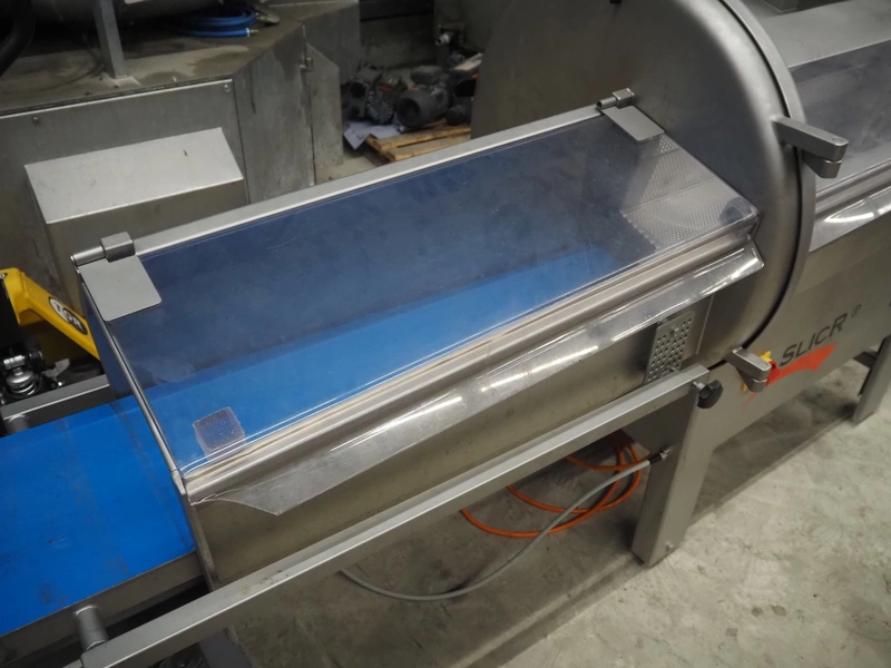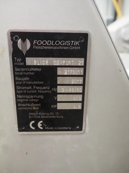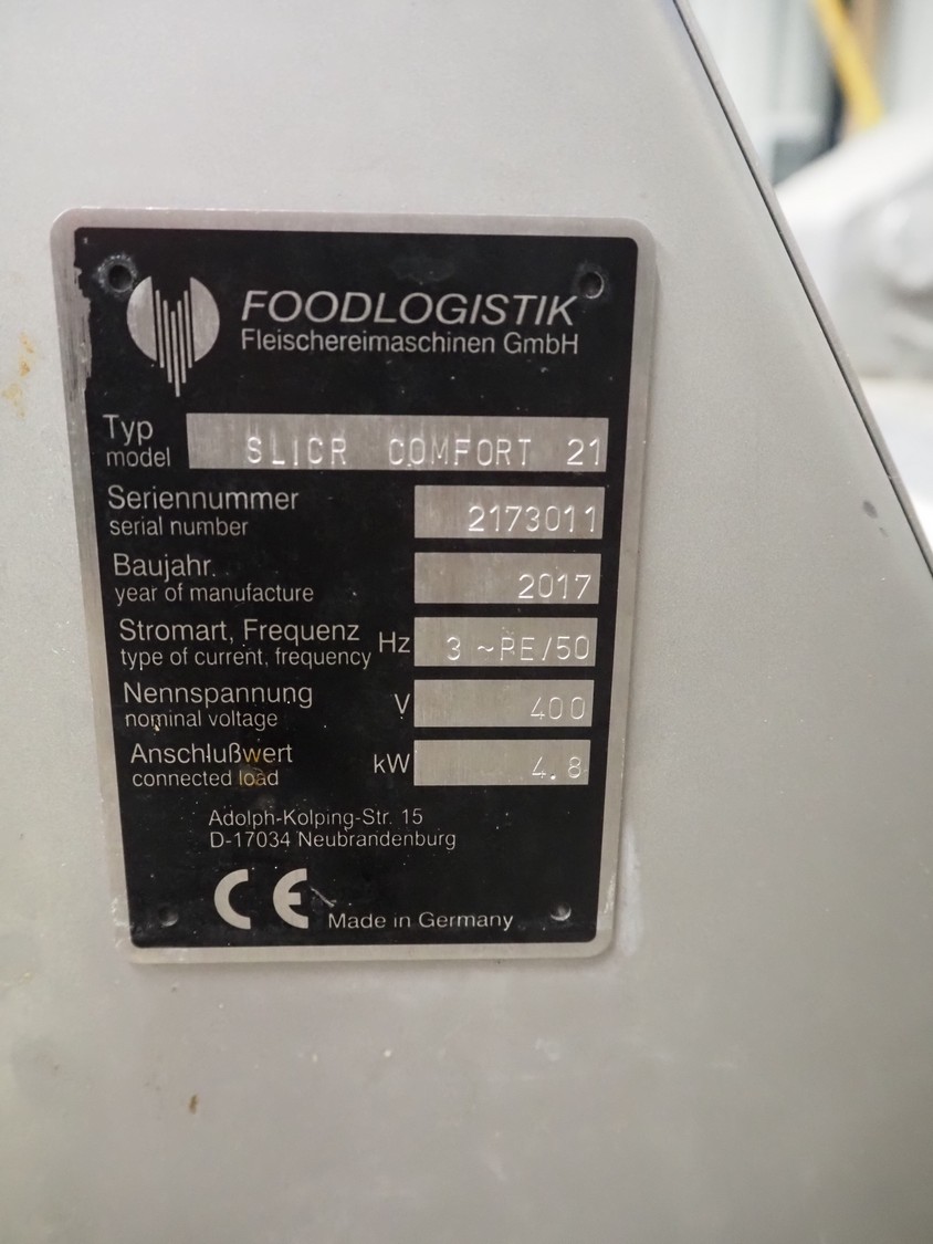 Foodlogistik Fleischereimaschinen GmbH mobile slicer, model: SLICR COMFORT 21, serial number: 2173011, year of construction: 2017, 400 V, 3 Ph, 50 Hz, 4.8 kW, plastic belt, belt width: 290 mm, dimensions chamber: 210 mm x 190 mm x 900 mm, total dimensions: 3000 mm x 830 mm x 1380 mm.