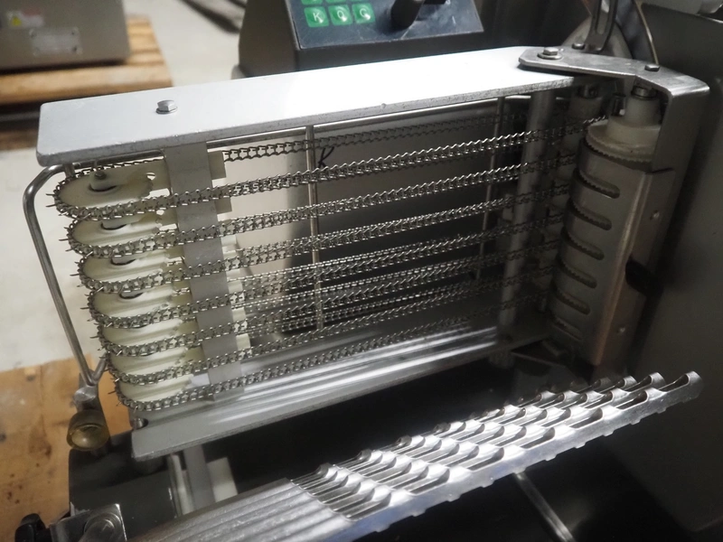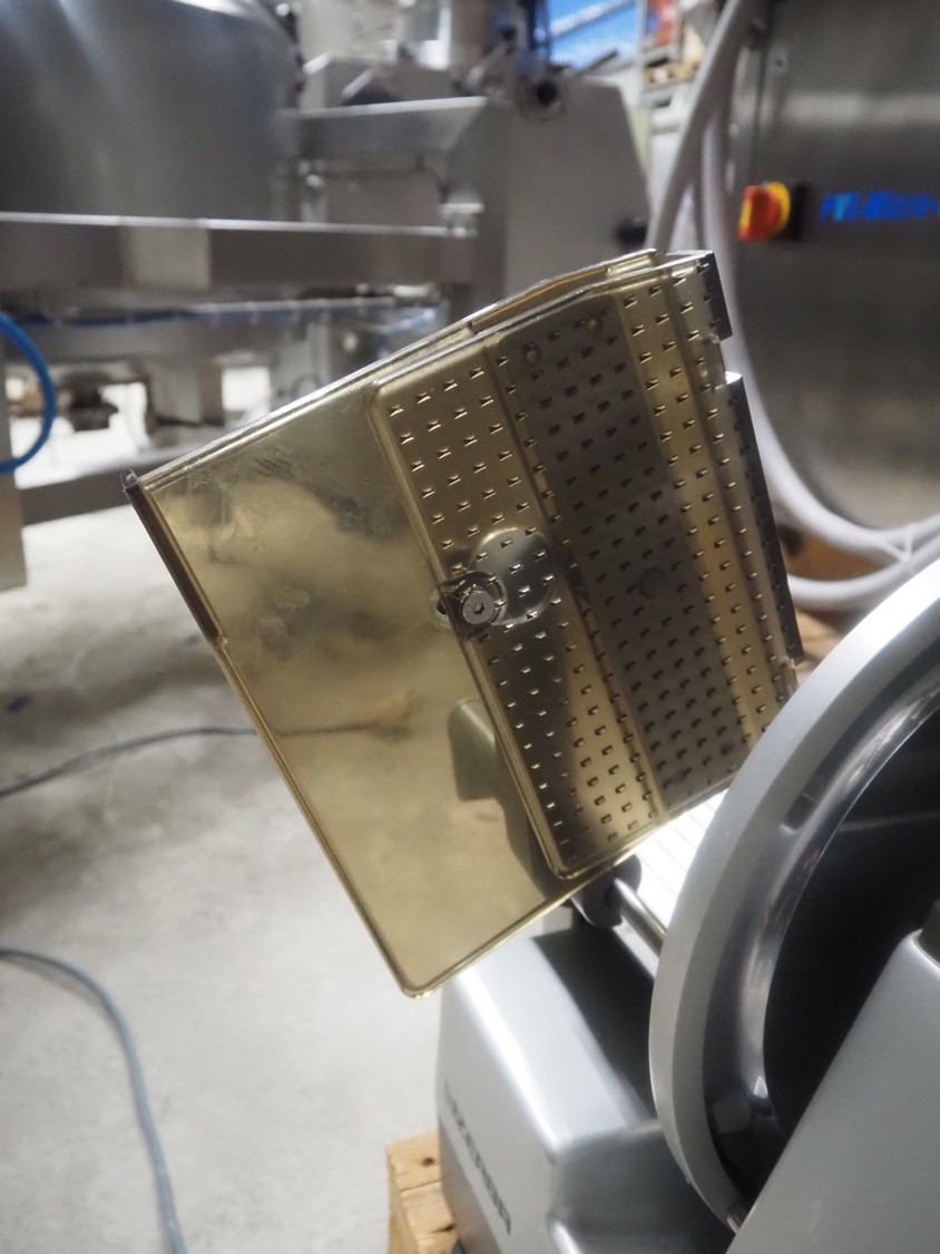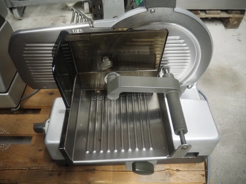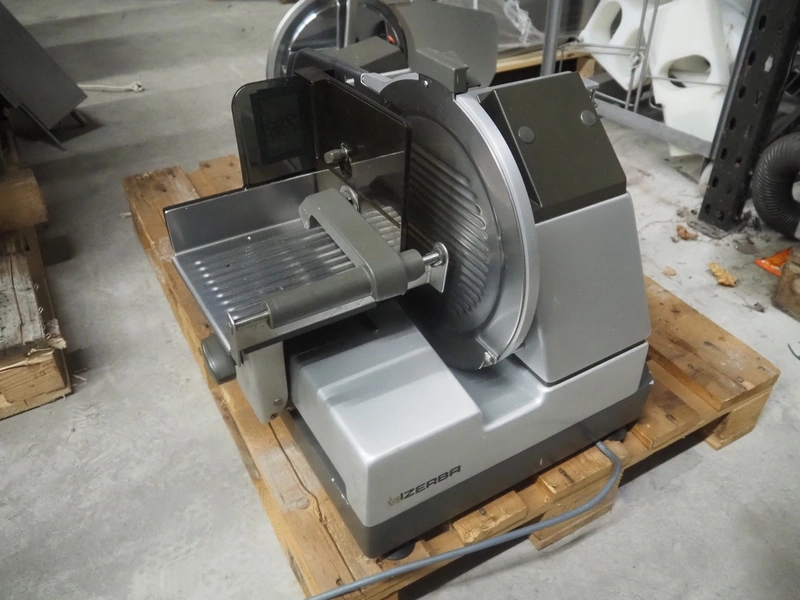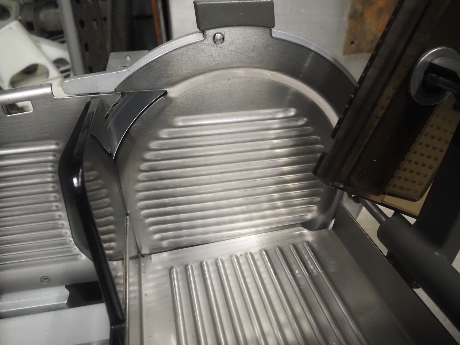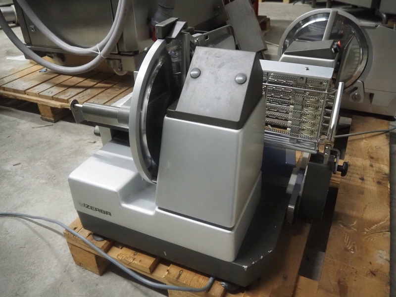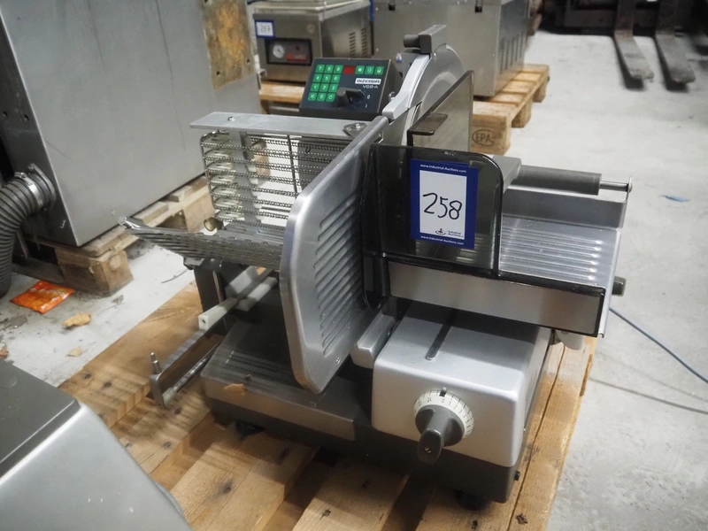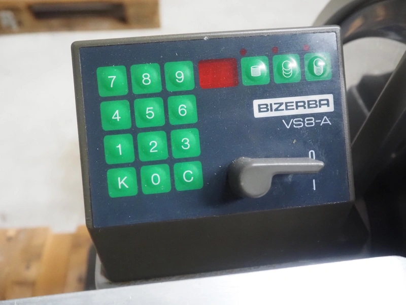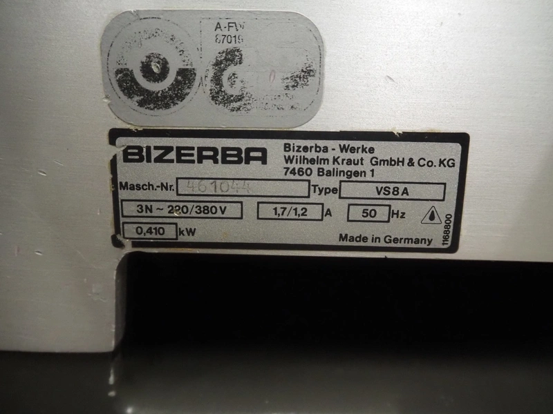Bizerba slicer, type: VS 8 A, machine number: 461044, 220/380 V, 3 Ph, 50 Hz, 1.7/1.2 A, 0.41 kW, dimensions: 700 mm x 680 mm x 540 mm.