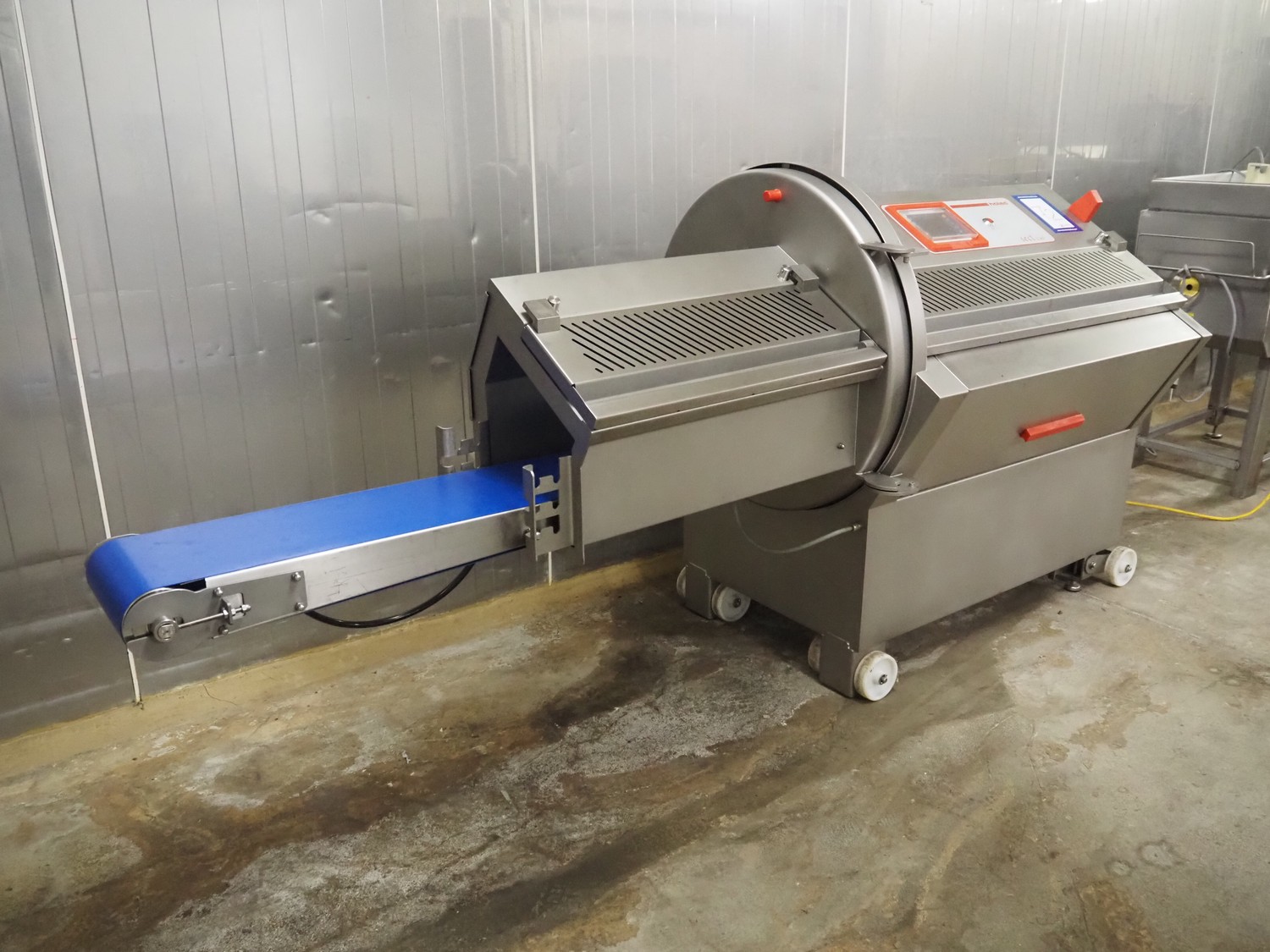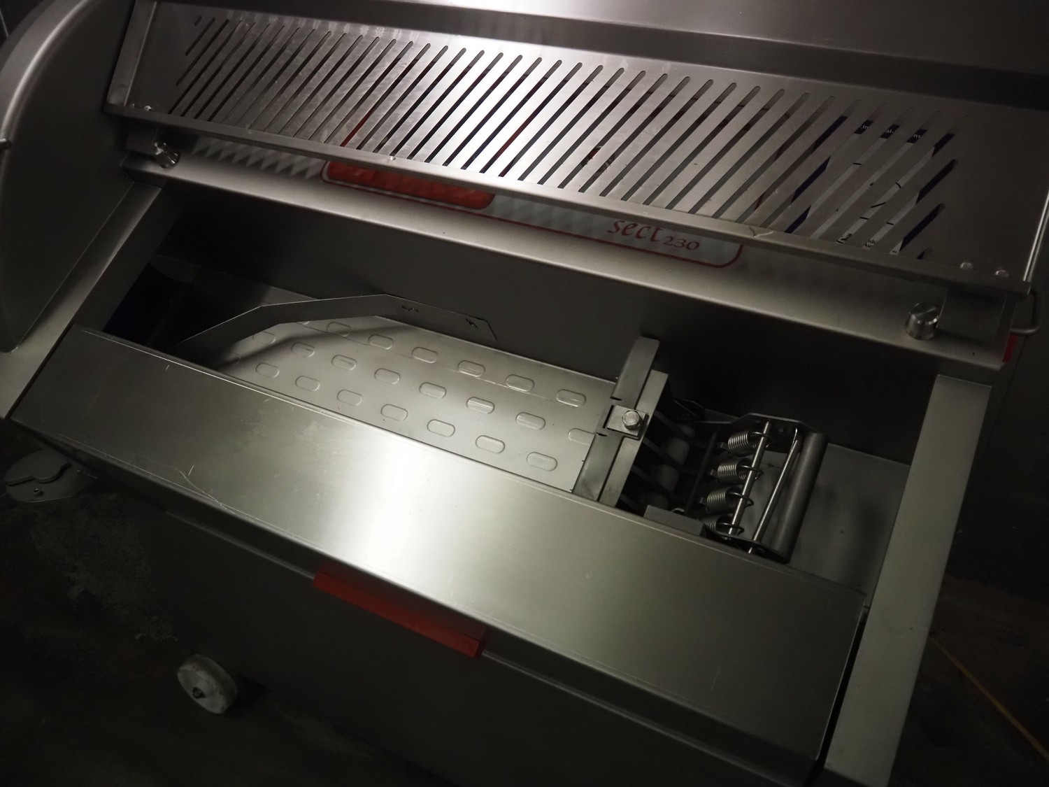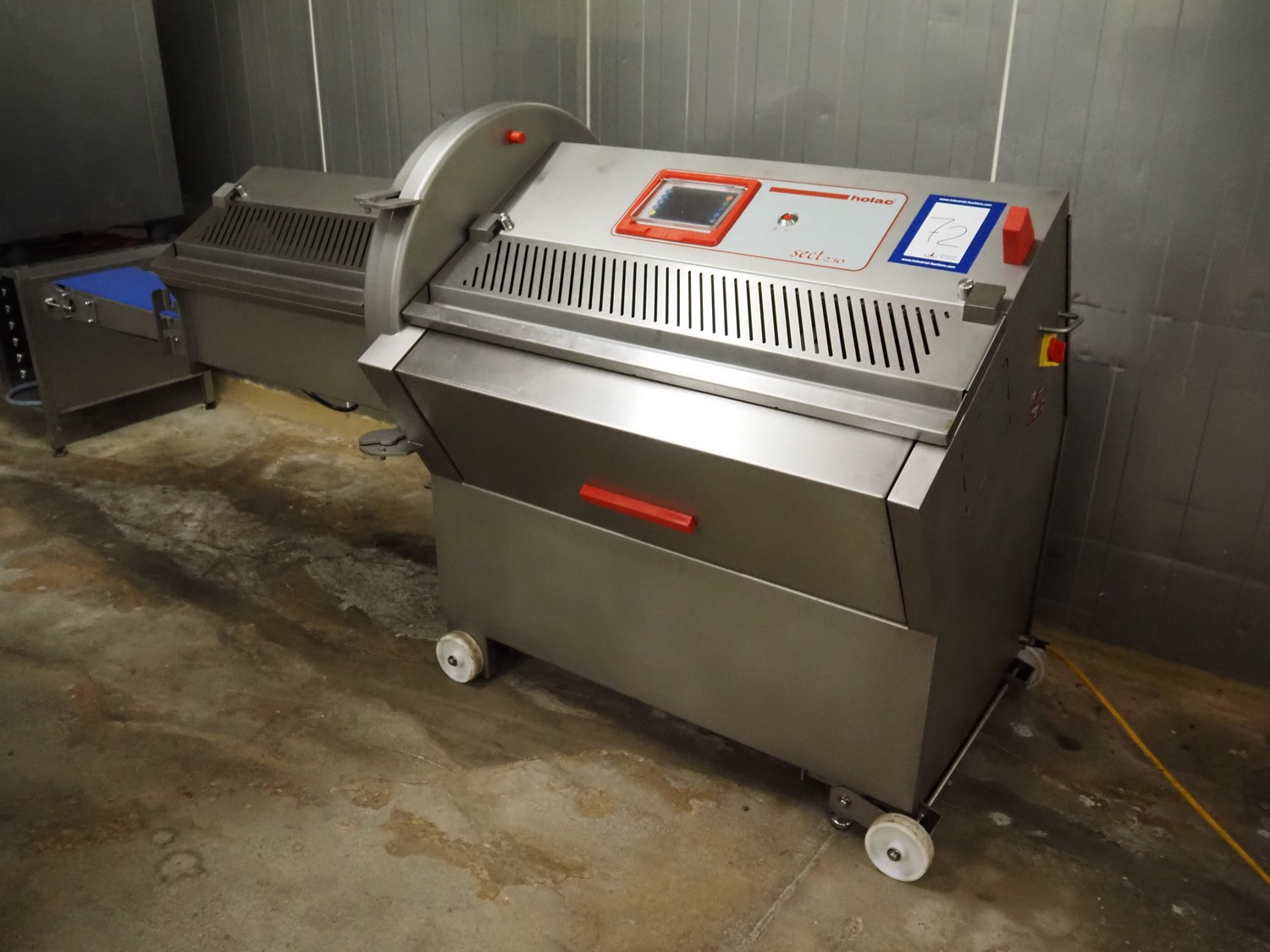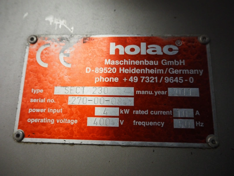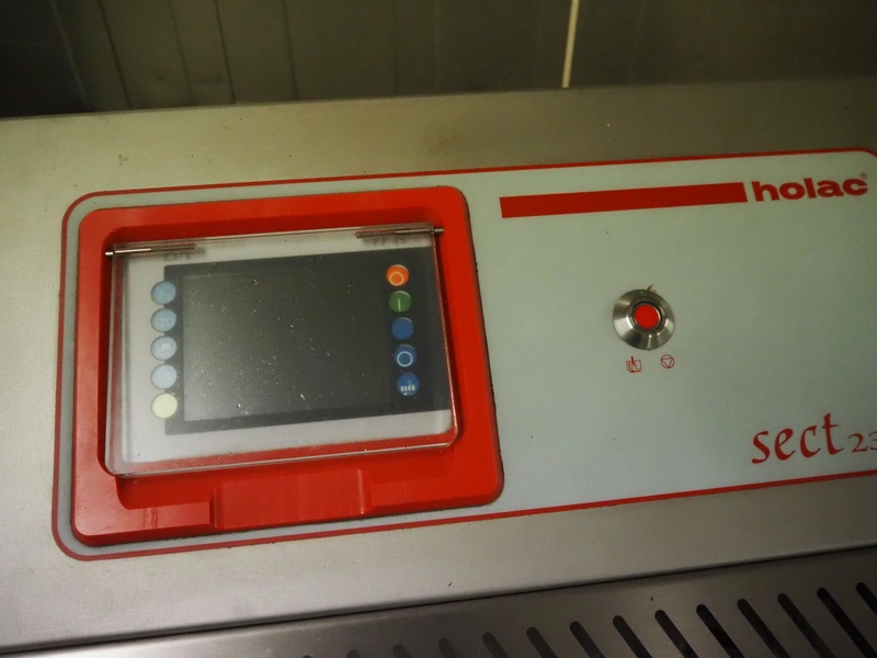 Holac Maschinenbau GmbH mobile slicer, type: SECT 230, serial number: 270-00-08, year of construction: 2011, 400 V, 50 Hz, 10 A, 4 kW, plastic belt, belt width: 250 mm, dimensions chamber: 230 mm x 180 mm, total dimensions: 2850 mm x 920 mm x 1320 mm.