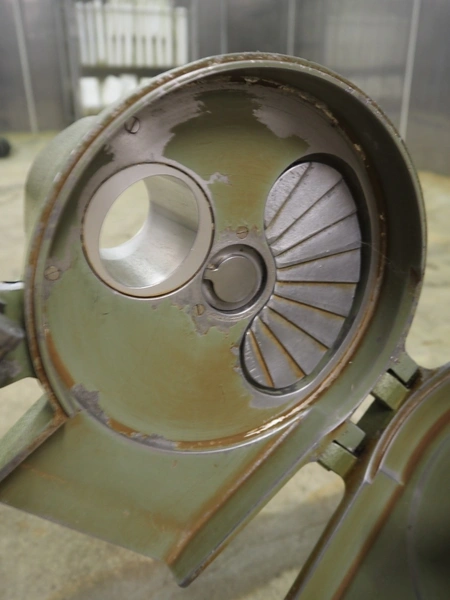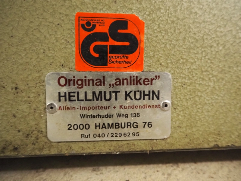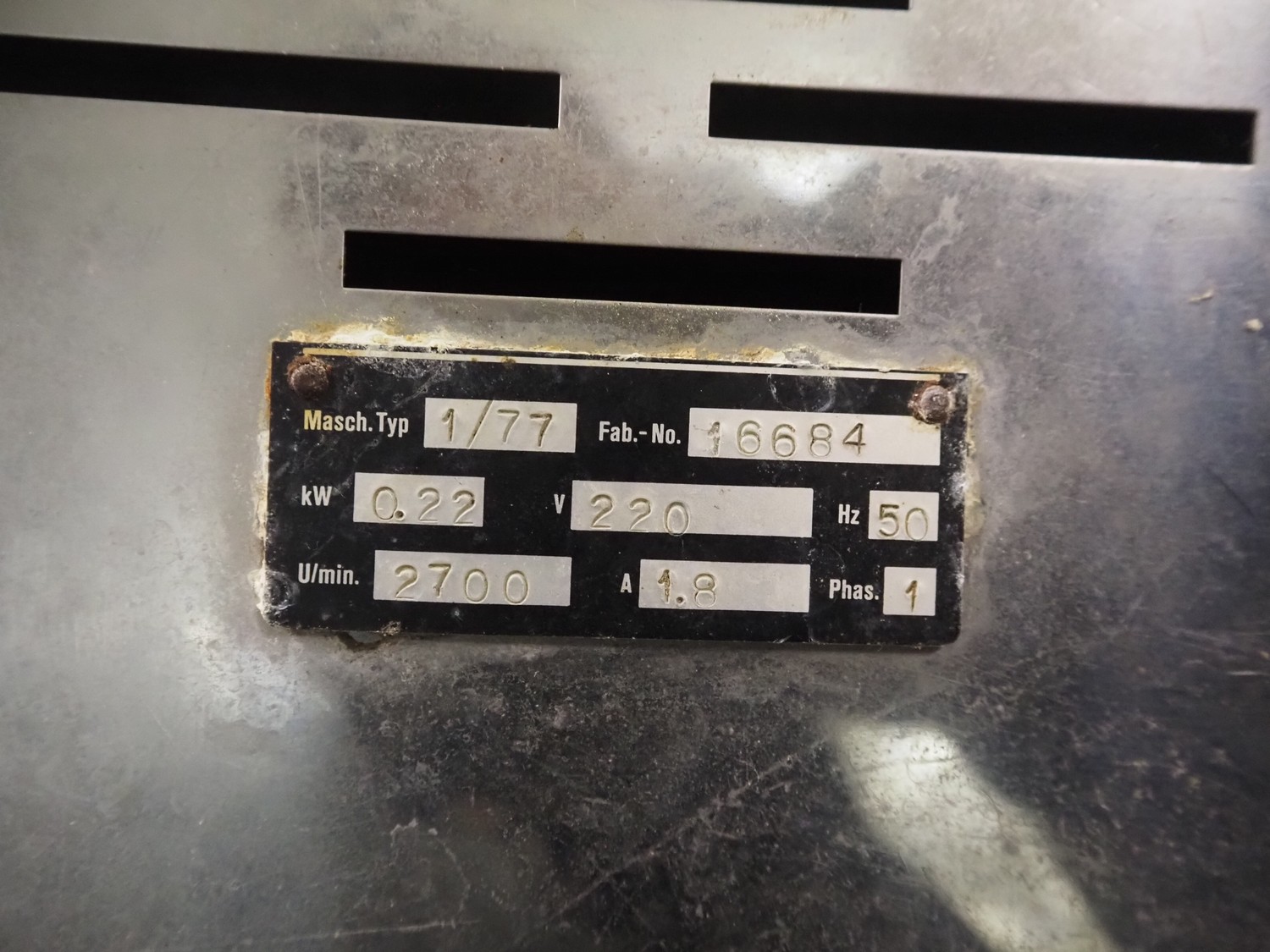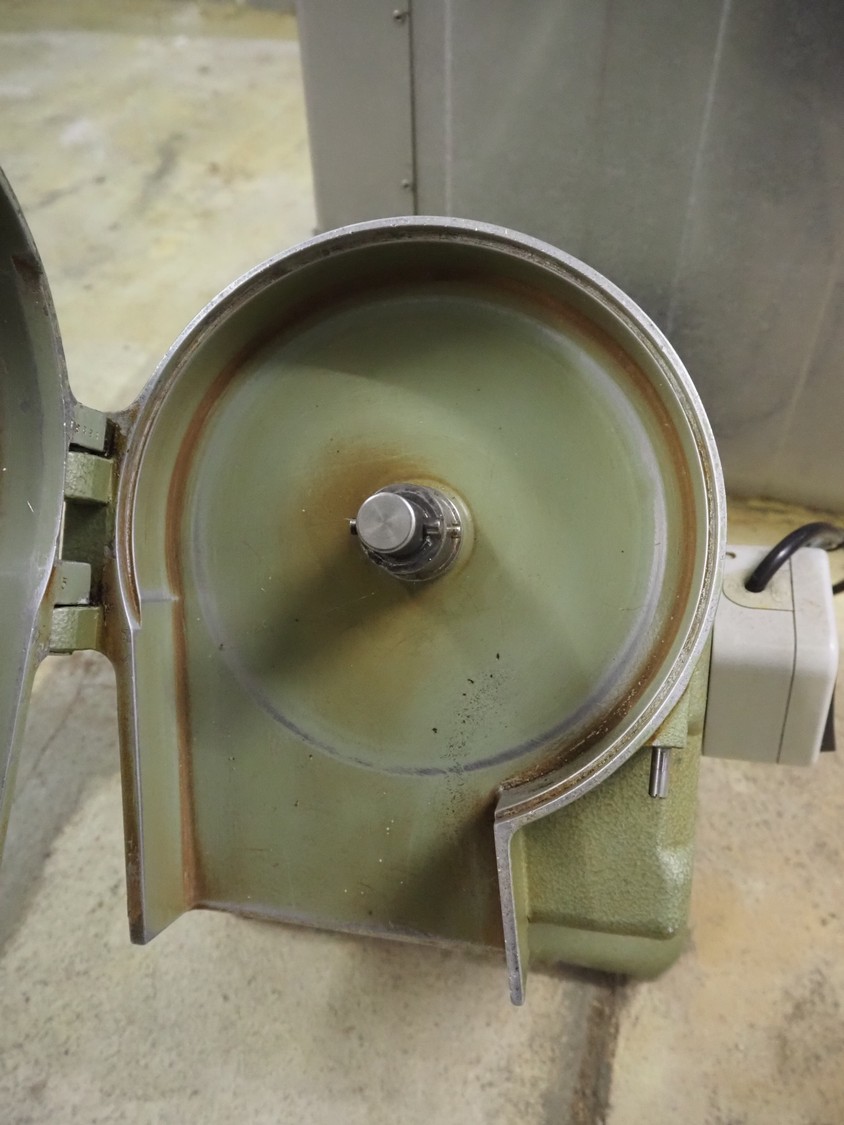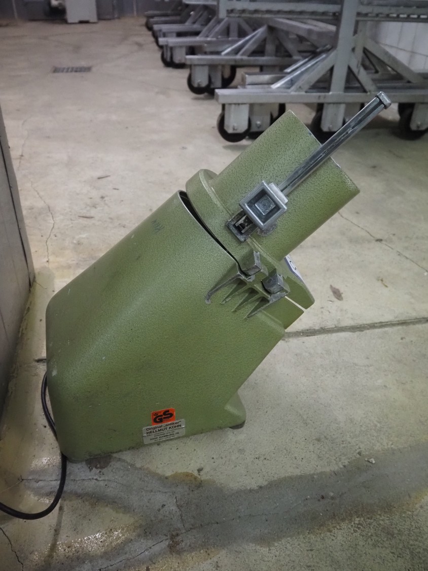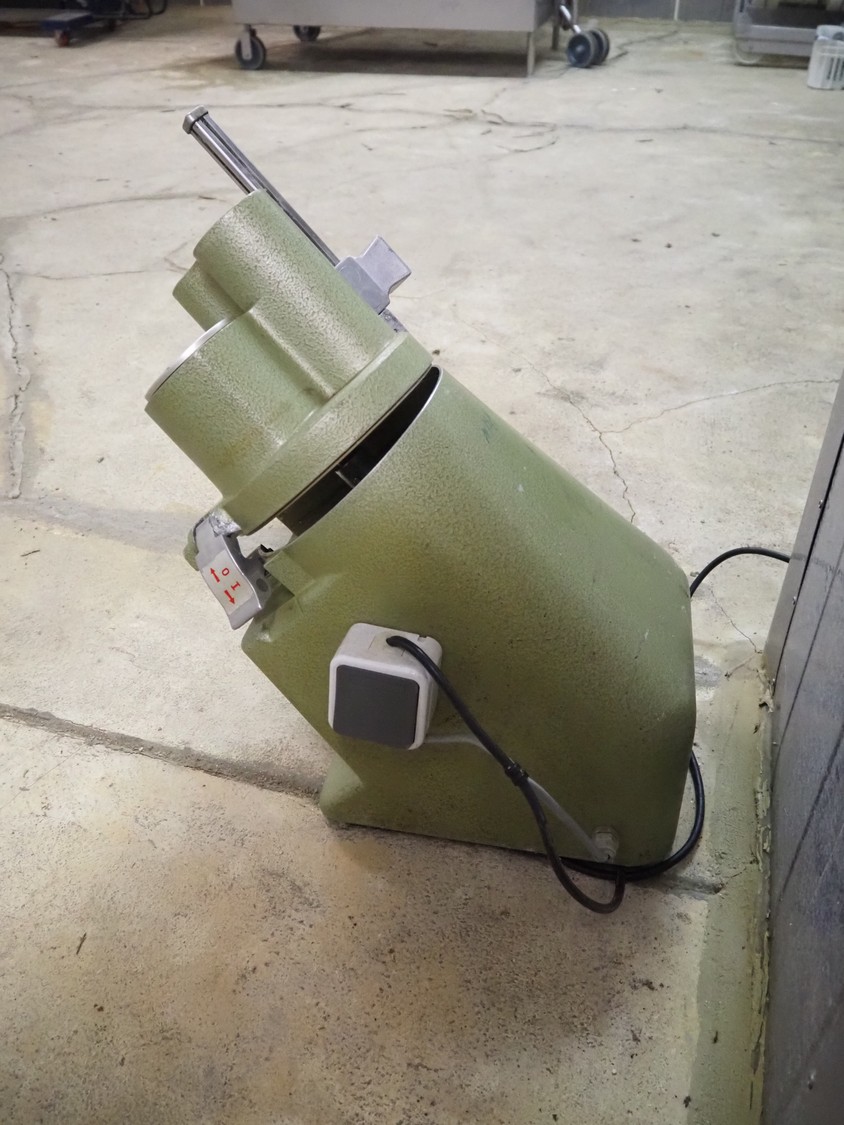 Hellmut Kühn vegetable slicer, type: 1/77, fabrication number: 16684, 220 V, 1 Ph, 50 Hz, 1.8 A, 0.22 kW, U/min 2700 mm, dimensions: 300 mm x 450 mm x 520 mm. Incomplete, missing knife.