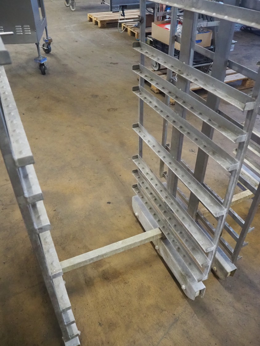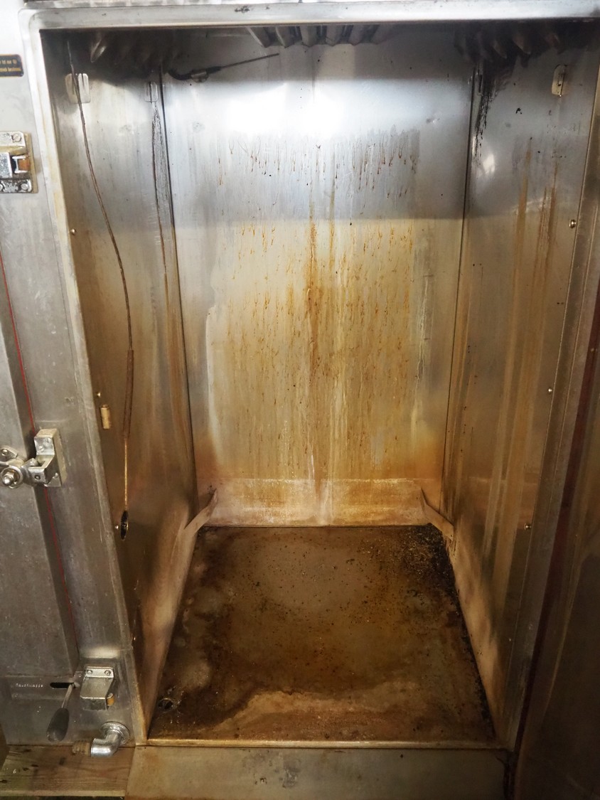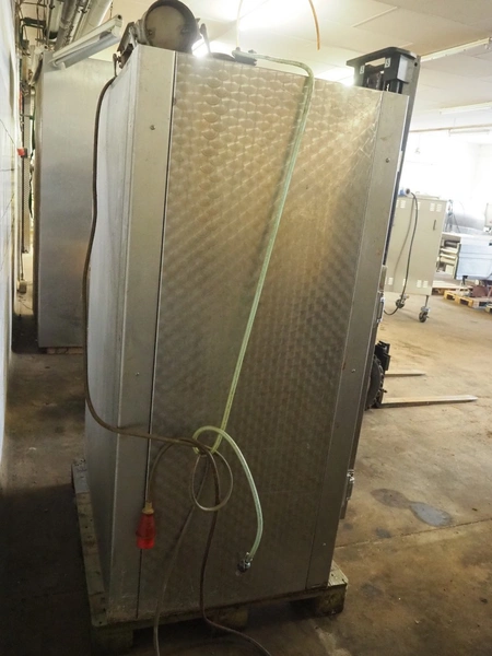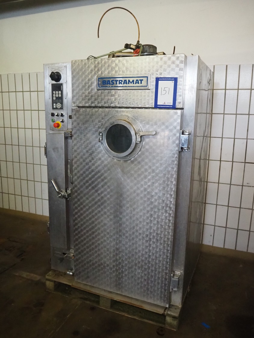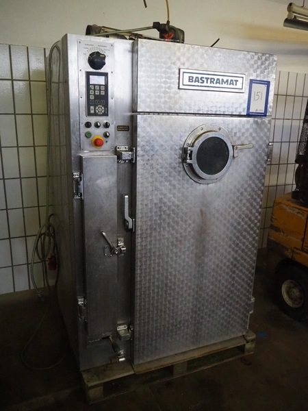 Bastramat smoking chamber, electric heated, dimensions: 1400 mm x 1000 mm x 1900 mm. Including 2 s/s smoke trolleys, dimensions: (2x) 700 mm x 650 mm x 1360 mm and crate with smoke sticks.
