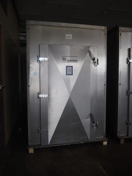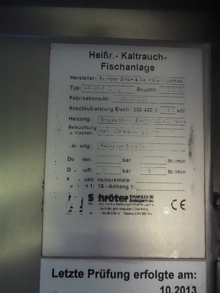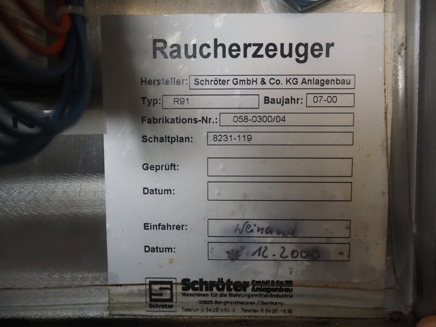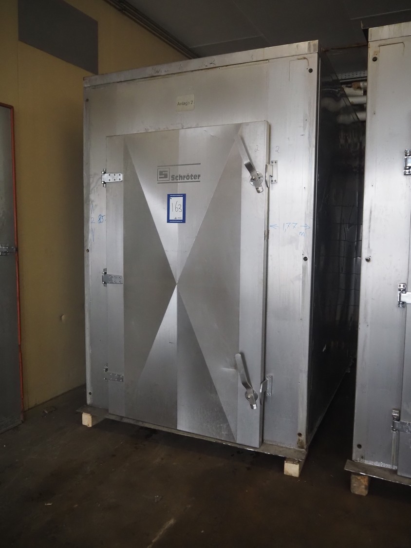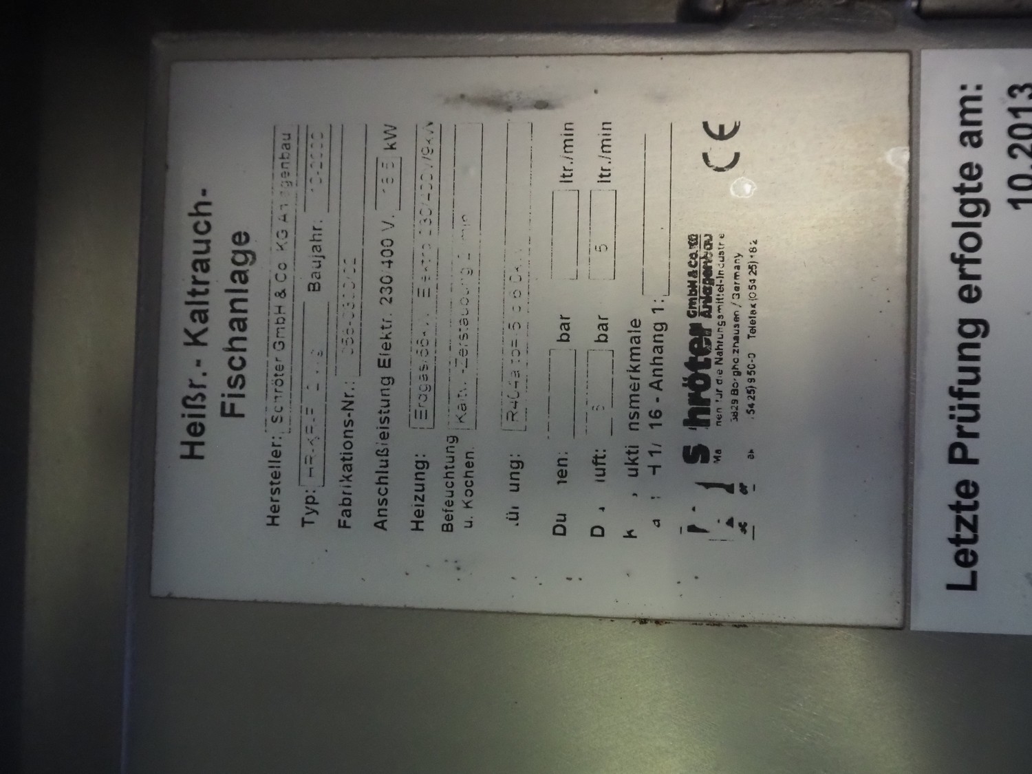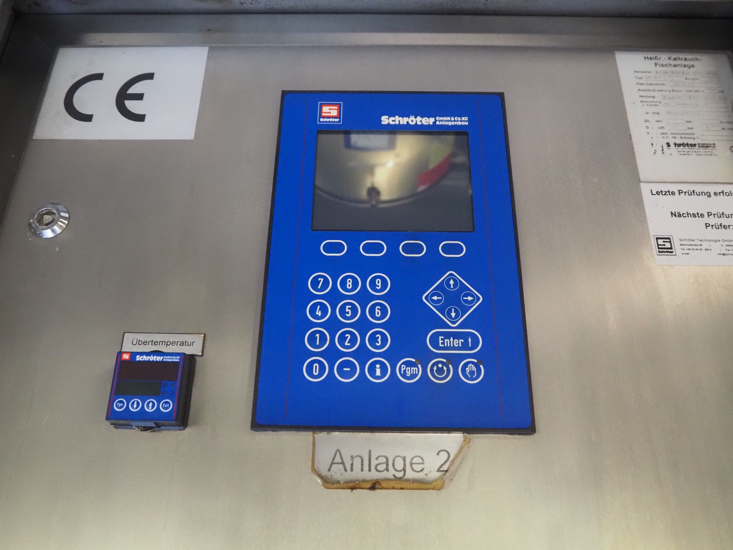 Schröter Technologie GmbH & Co. KG smoking chamber, type: HR-KR-F 2 Wg, number: 058-0300/02, year of construction: 10-2000, 230/400 V, 18.5 kW, gas heated, inside dimensions: 1600 mm x 2200 mm x 2050 mm, total dimensions: 1790 mm x 3400 mm x 2750 mm, with Schröter Technologie GmbH & Co. KG smoke generator, type: R 91, number: 0580300/02. 652/2, year of construction: 08/2000, 230/400 V, 1,5 kW, dimensions: 780 mm x 600 mm x 1750 mm. Including switch cabinet, dimensions: 750 mm x 1000 mm x 380 mm.